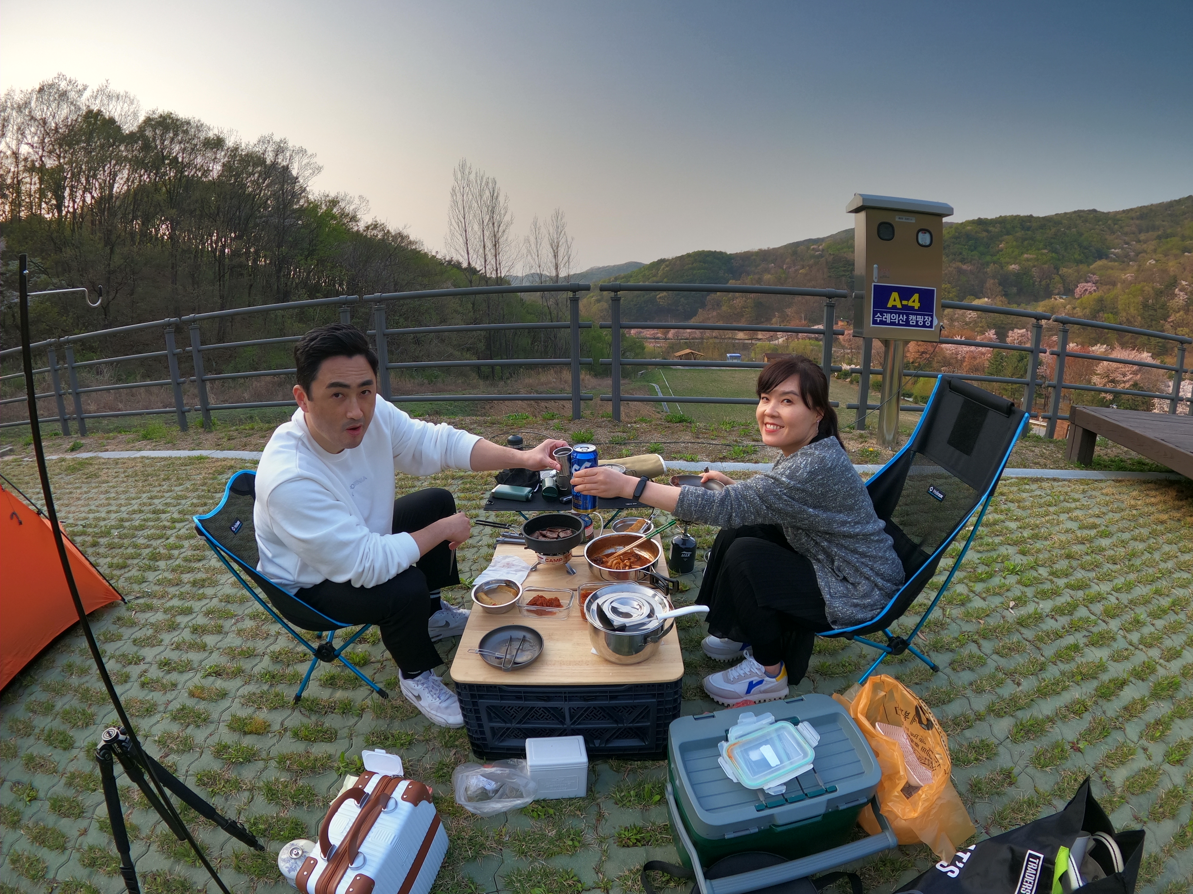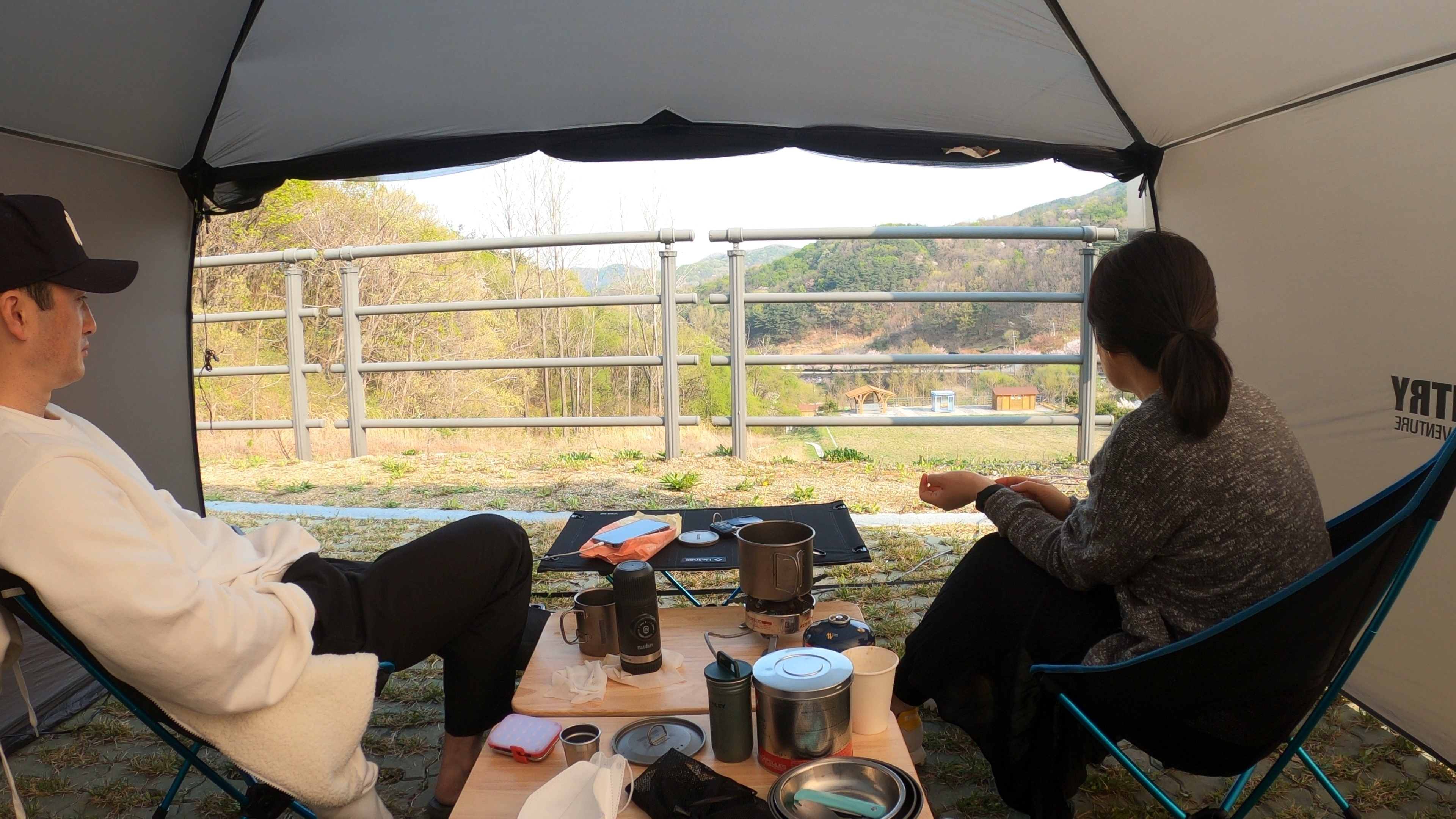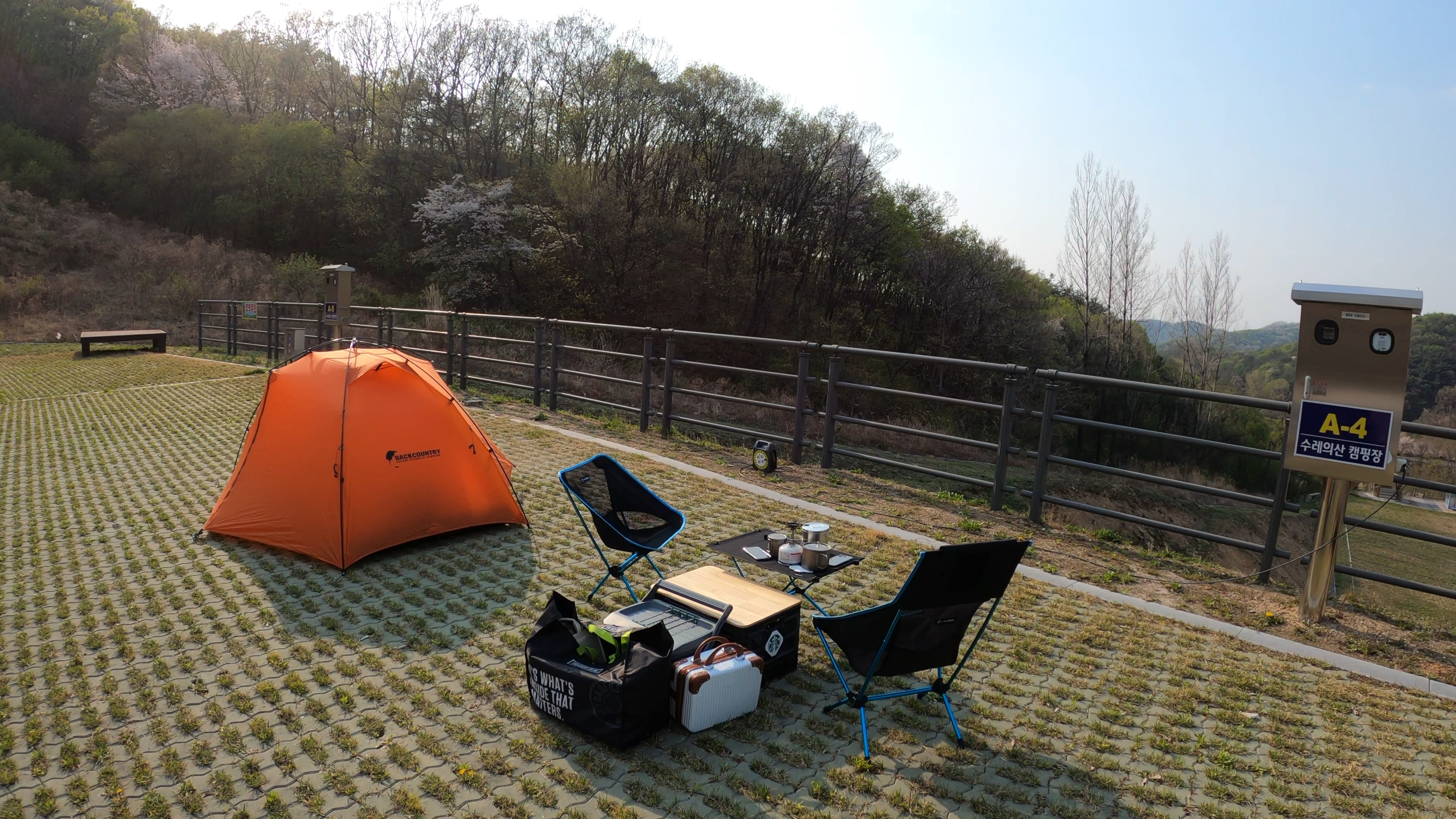 예약한 곳은 A구역 4번 사이트. 사이트 넓이가 너무 넓어서 당황. 바로 앞 난간으로 내려다 보이는 풍경이 제법 이뻤다. 일단 텐트 치기 전에 커피 한잔.