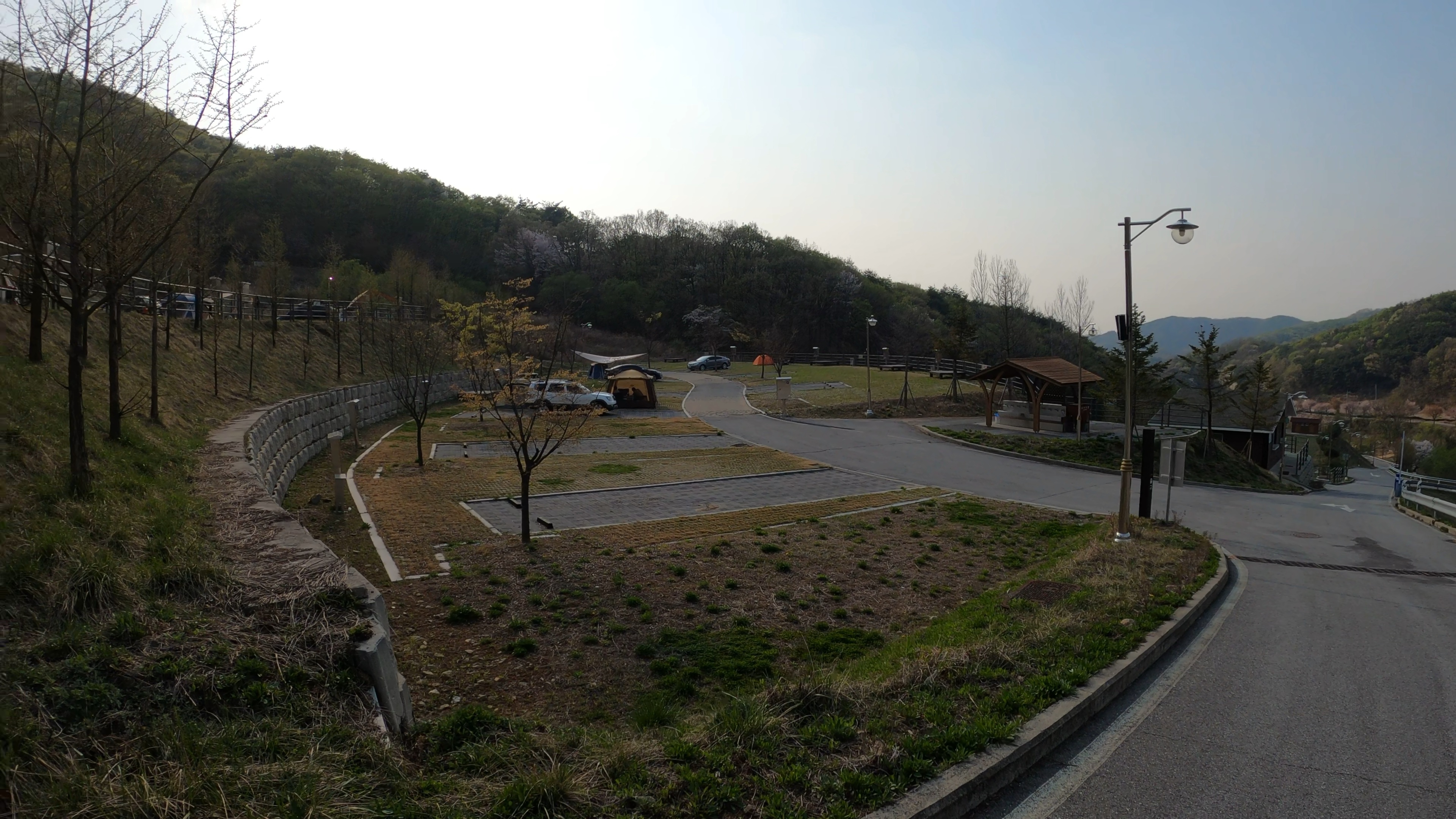 우리 텐트가 위치한 A구역. 차를 바로 옆에 주차해 놓을수 있고 무엇보다 앞으로 내려다 보이는 풍경에 뻥 뚫여 있는게 이 휴양림 야영장의 장점이다. 반면 여름에 오면 땡볕에 더울것 같긴 하다.