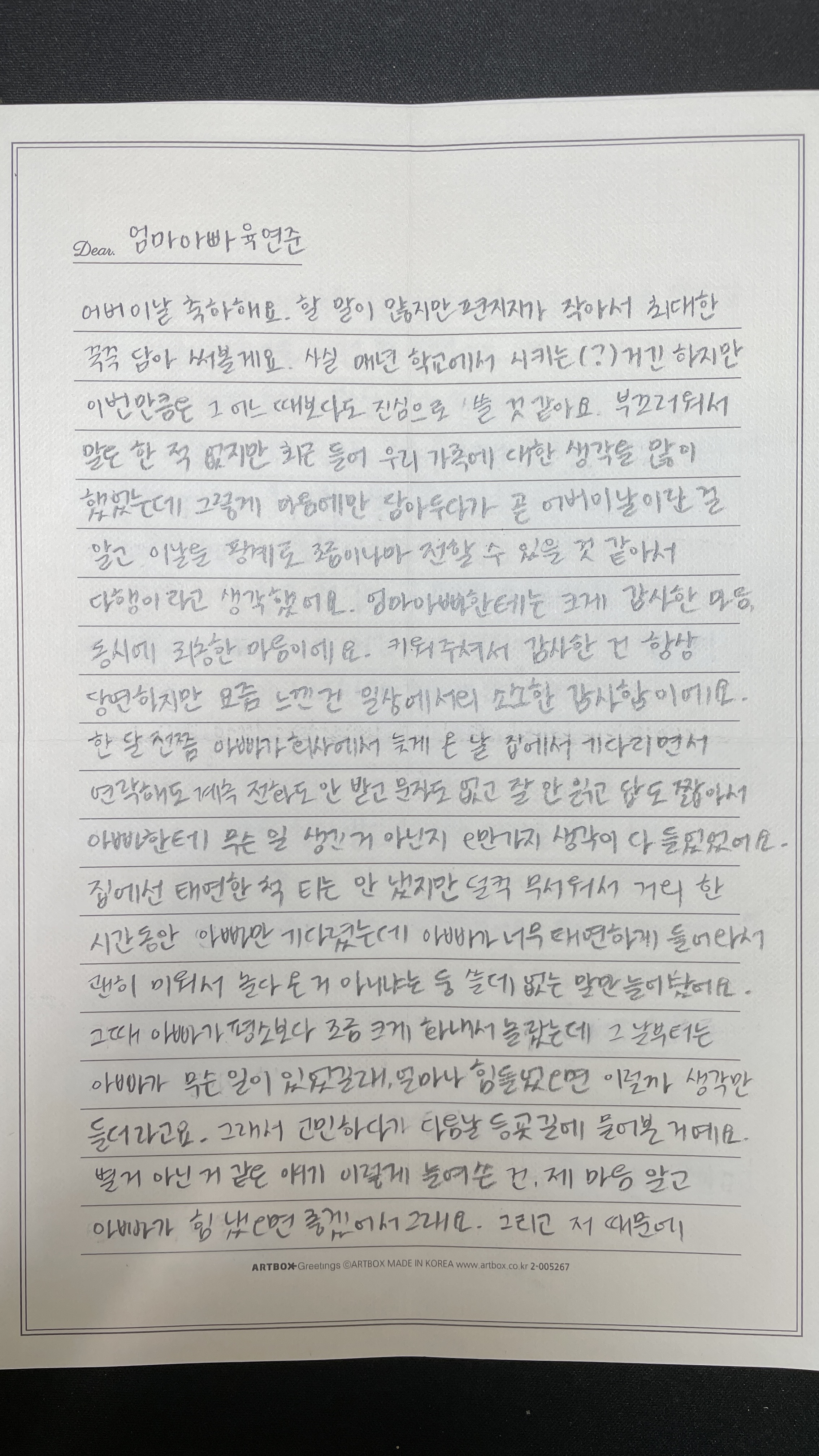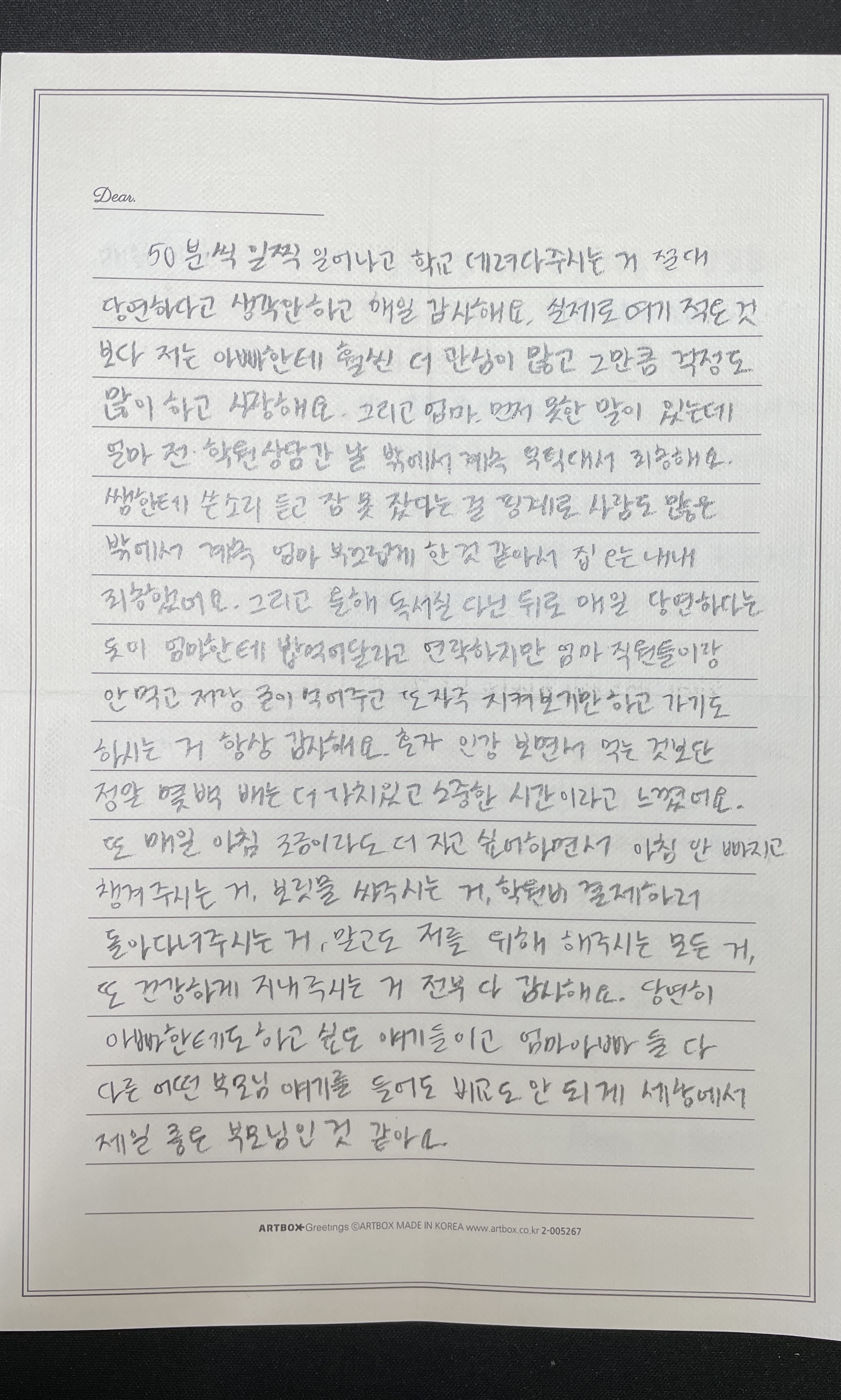 고3인데 집에 오면 그냥 막 퍼질러 자기도 하고, 동생한테 꽥꽥 소리지르고, 천방지축 자기 하고싶은대로 다 하고 다니는 철없는 고등학생이라 생각한 딸이 어버이날을 맞이하여 쓴 편지