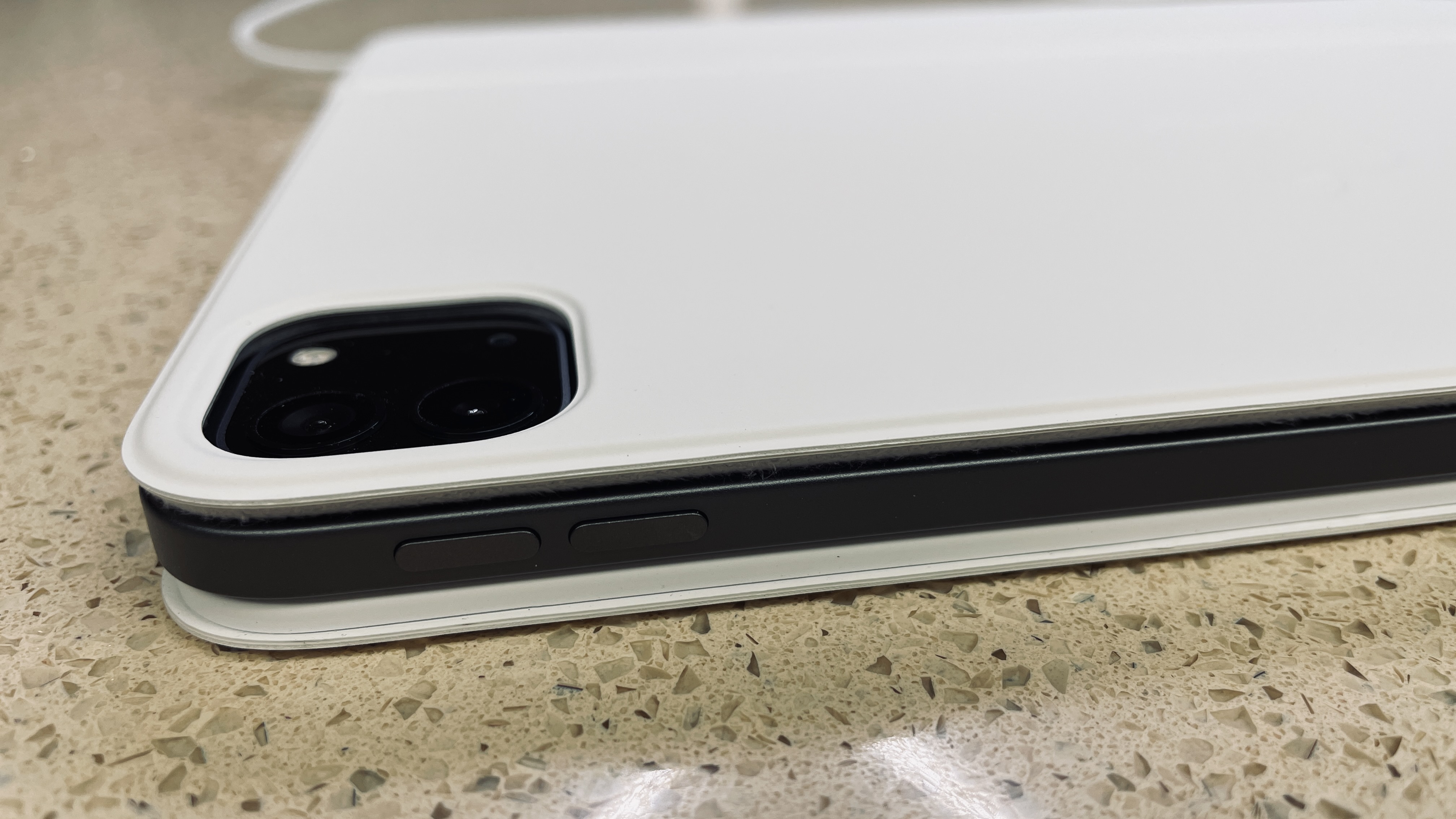 이렇게 장착시 아이패드 프로와 뒷판을 결합한 상태의 두께는 9mm 아주 약간 안된다.