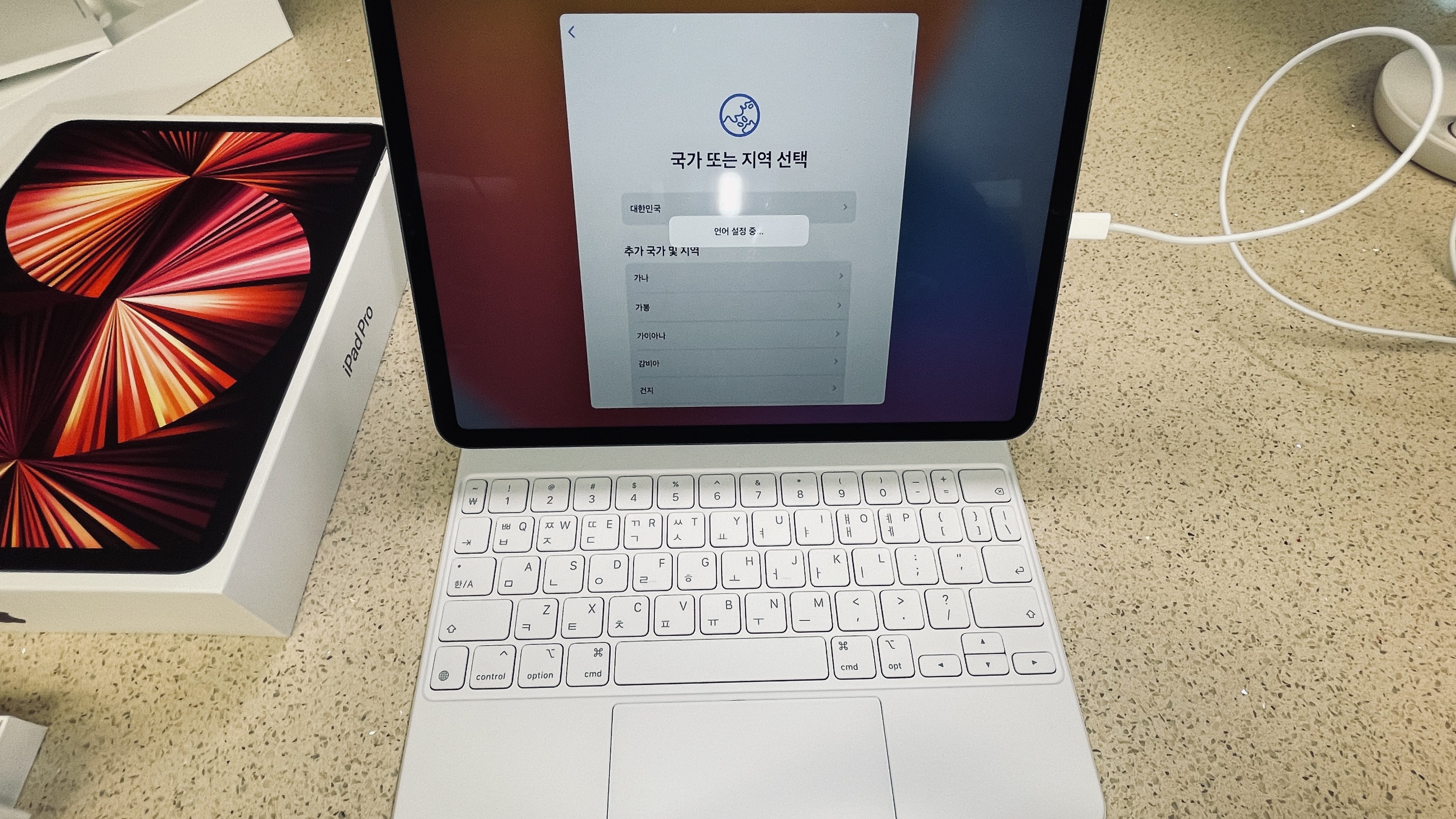화이트 매직키보드와 스페이스그레이 아이패드프로의 조합.