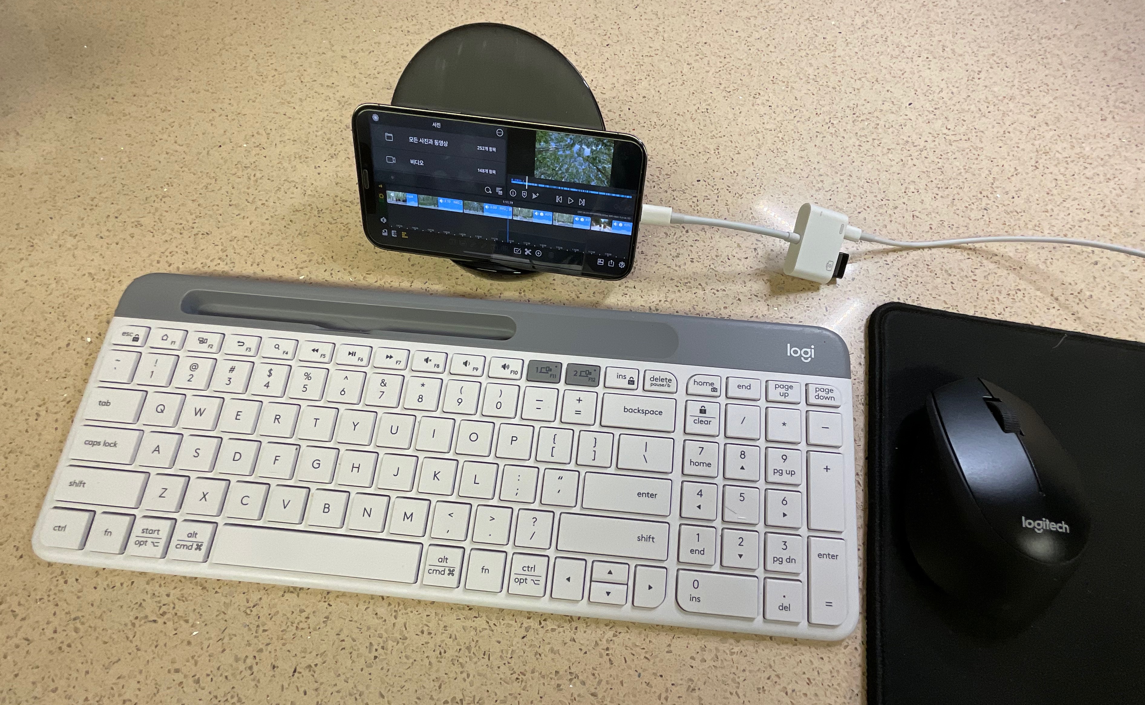 아이폰으로 영상 편집할때 세팅. 마우스와 키보드를 연결해서 조그만 화면에서 작업을 해야 했다. 폰으로 영상 편집하는게 그냥 한달에 한두번 영상 올릴때에는 가능했으나, 3-4번 올릴수 있는 컨텐츠들이 만들어 지면서 생산성이 낮다 보니 그 한계를 느끼고 결국 아이패드 프로를 질렀다.
