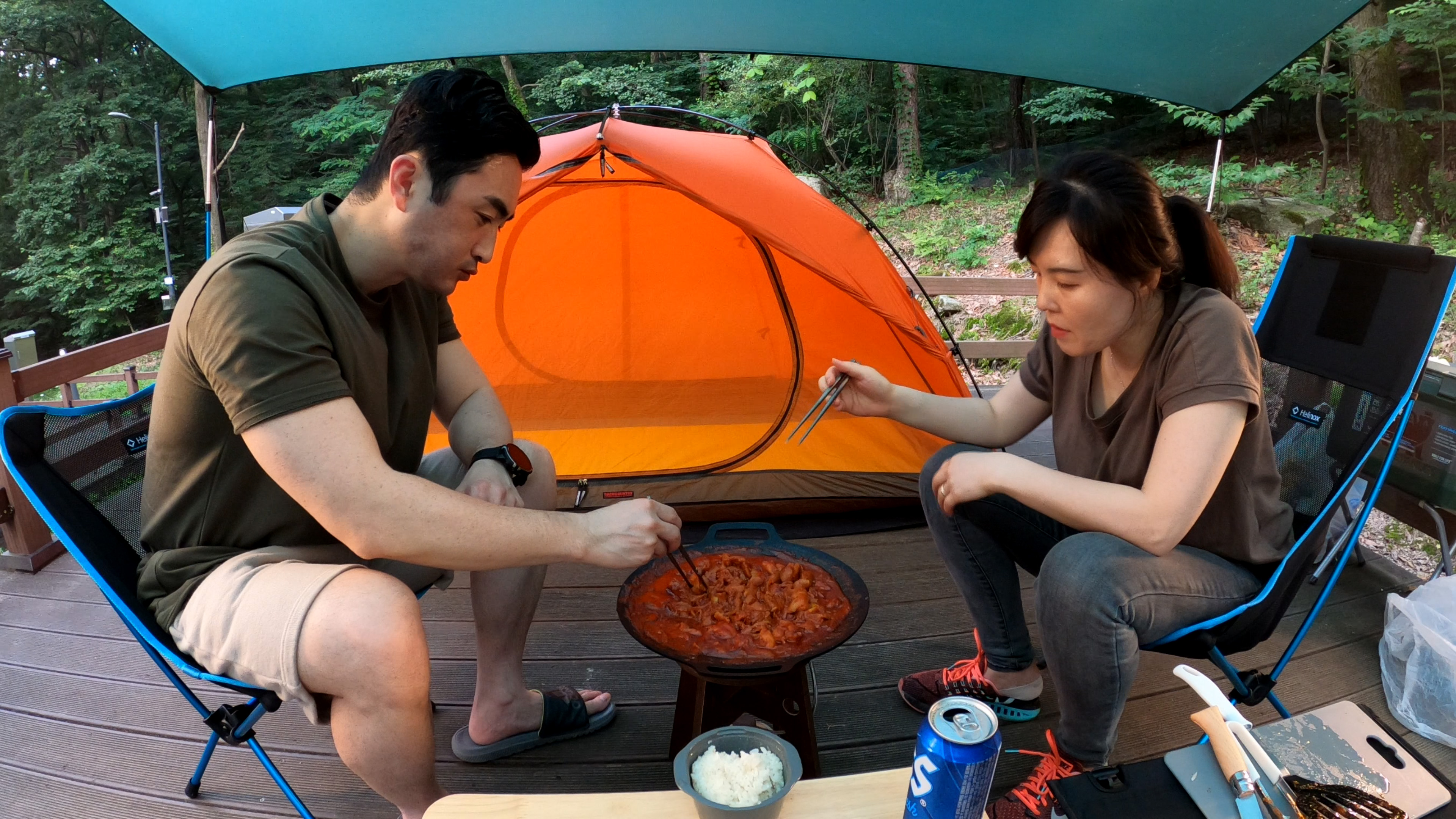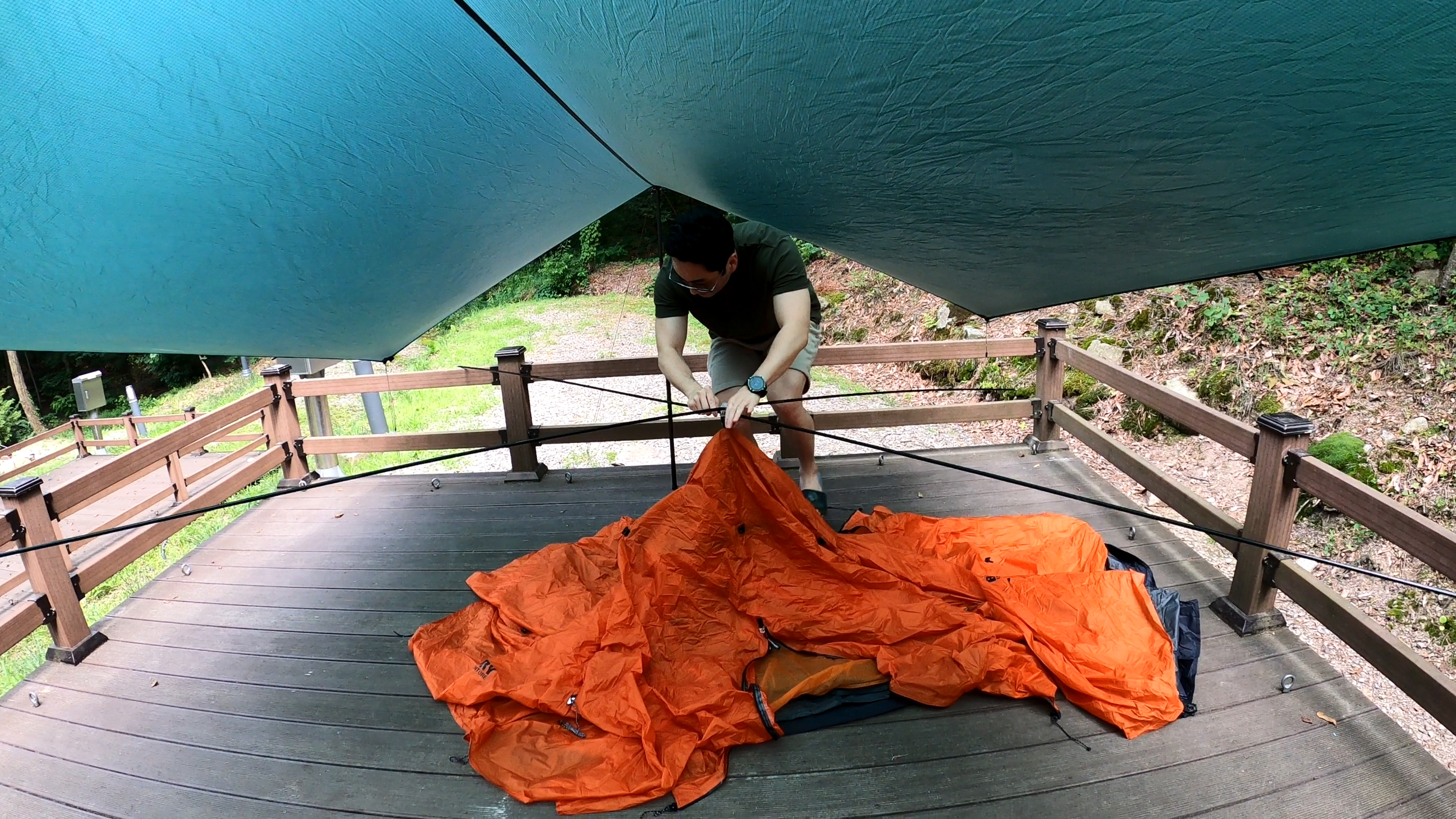 타프와 텐트의 조합으로 구성하려고 열심히 타프를 쳤으나, 오랜만에 치는 타프가 오히려 큰 쉘터 치는것보다 더 오래 걸렸다.