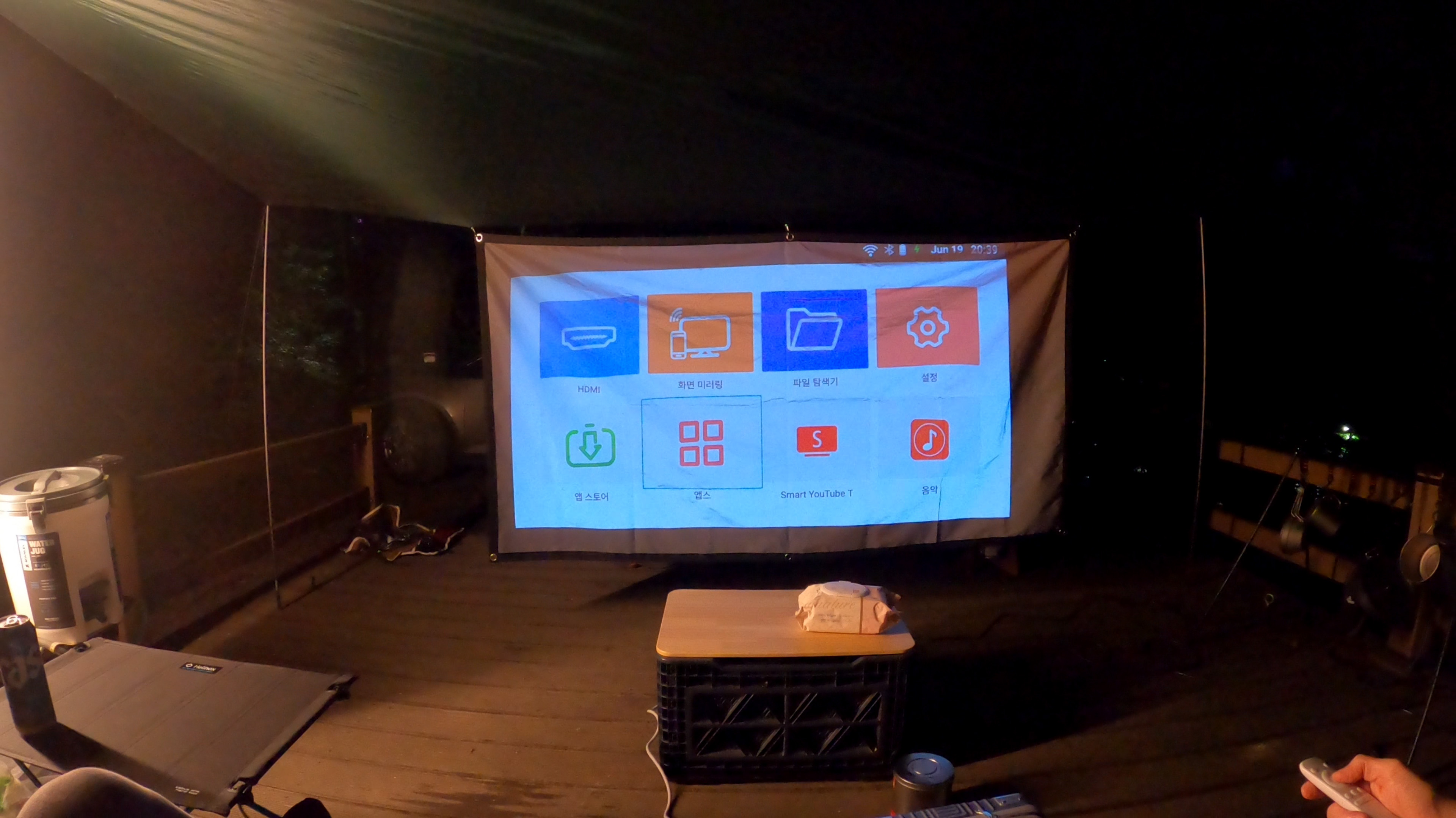 그리고 첫 개시하는 빔 프로젝터. 타이어 교체후 경품으로 받은 것인데, 사이즈가 작아서 캠핑장에서 쓰기 딱 좋은 사이즈다.