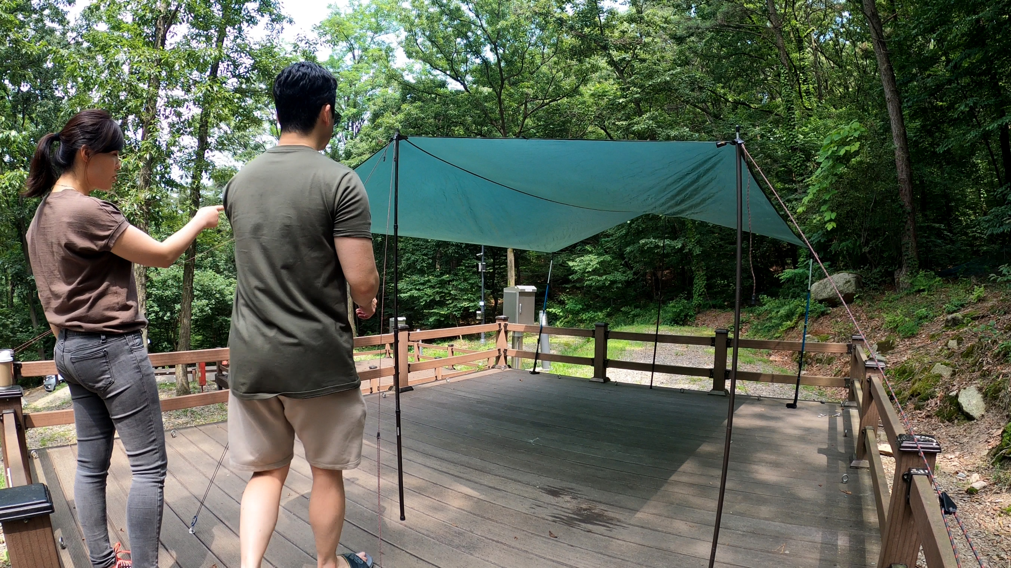 이렇게 길게 구성을 하였으나 타프 아래공간이 적어 보여 다시 가로로 재설치