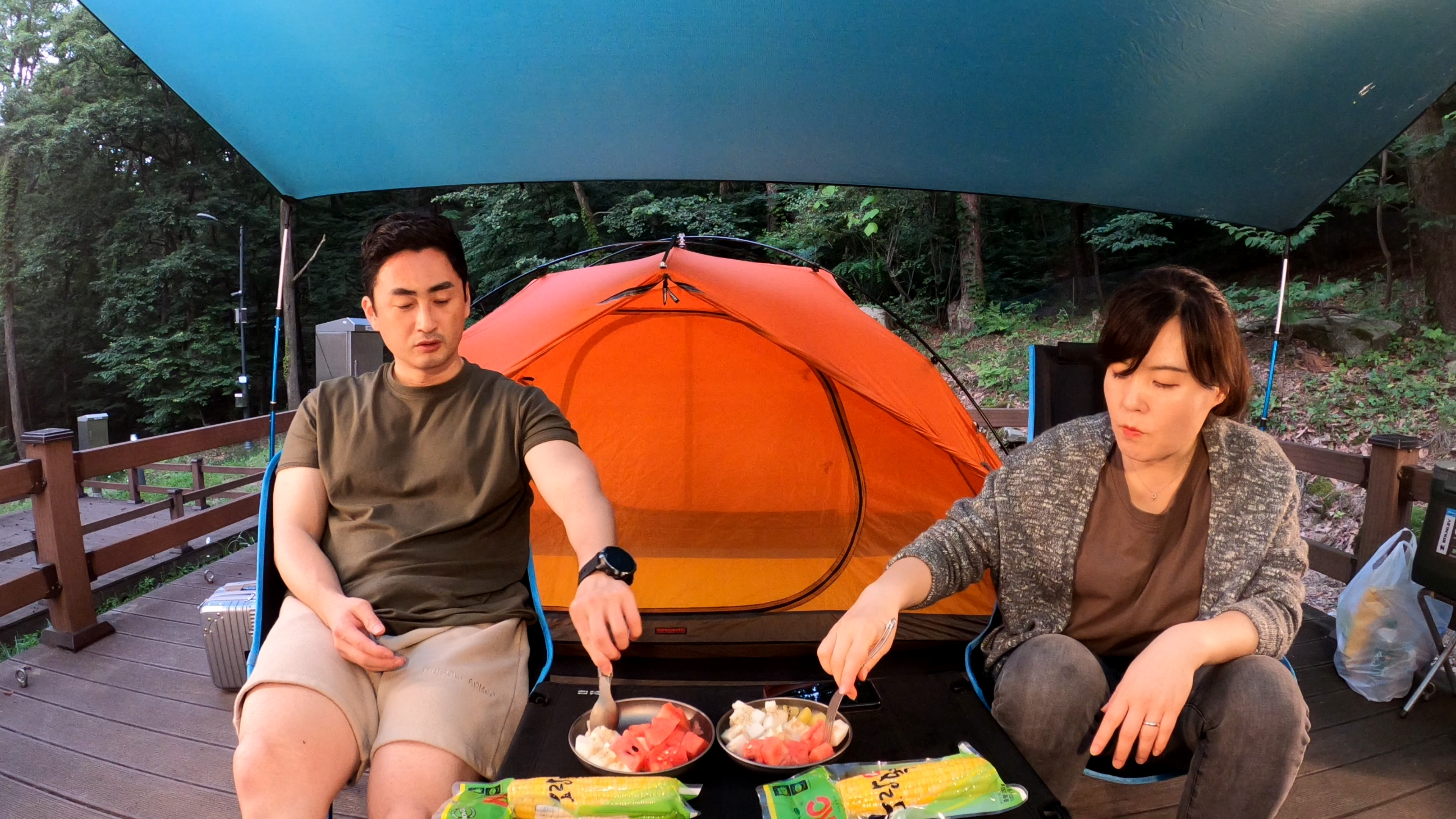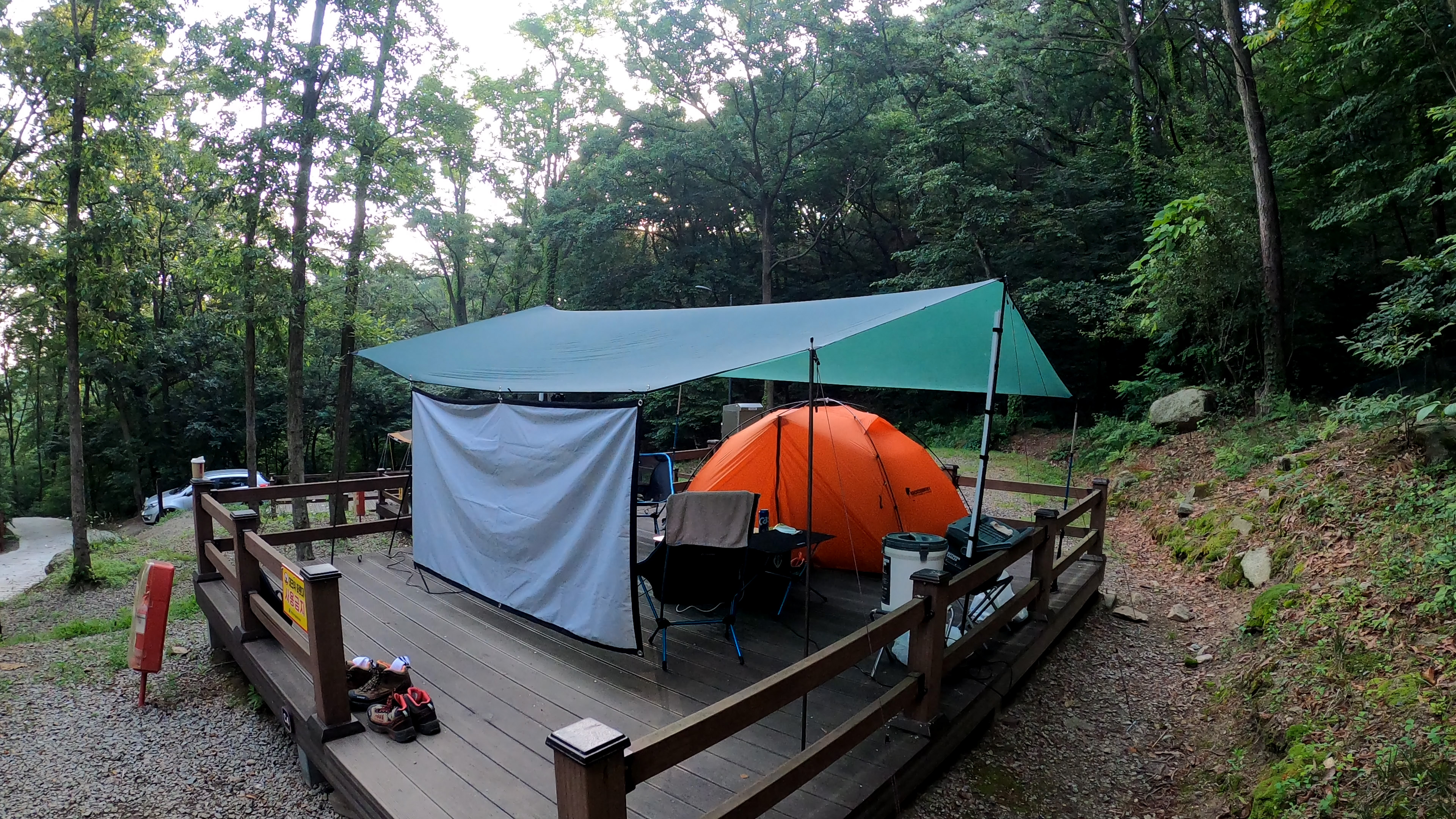타프와 텐트의 조합으로 구성하려고 열심히 타프를 쳤으나, 오랜만에 치는 타프가 오히려 큰 쉘터 치는것보다 더 오래 걸렸다.