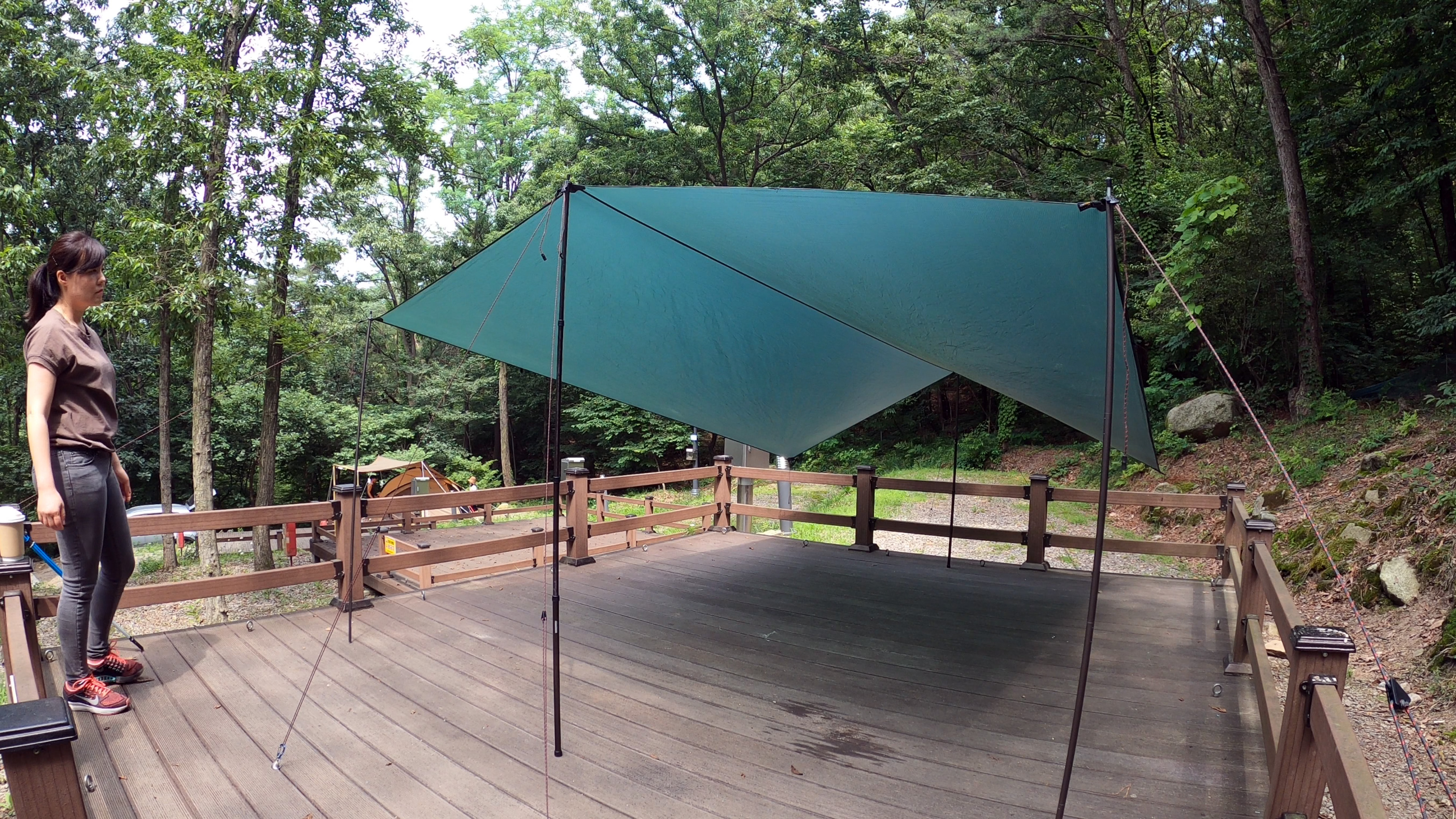 이렇게 길게 구성을 하였으나 타프 아래공간이 적어 보여 다시 가로로 재설치