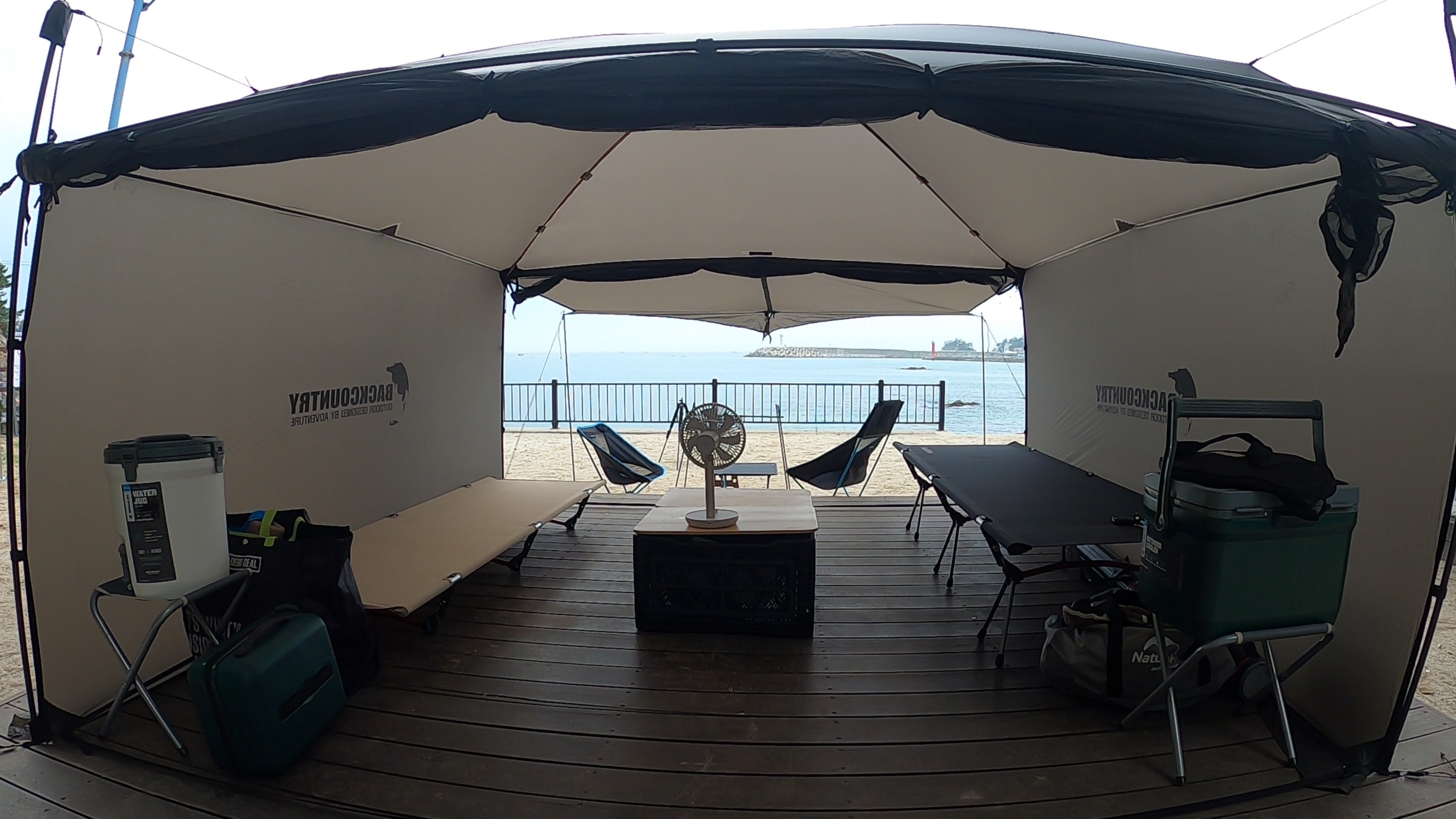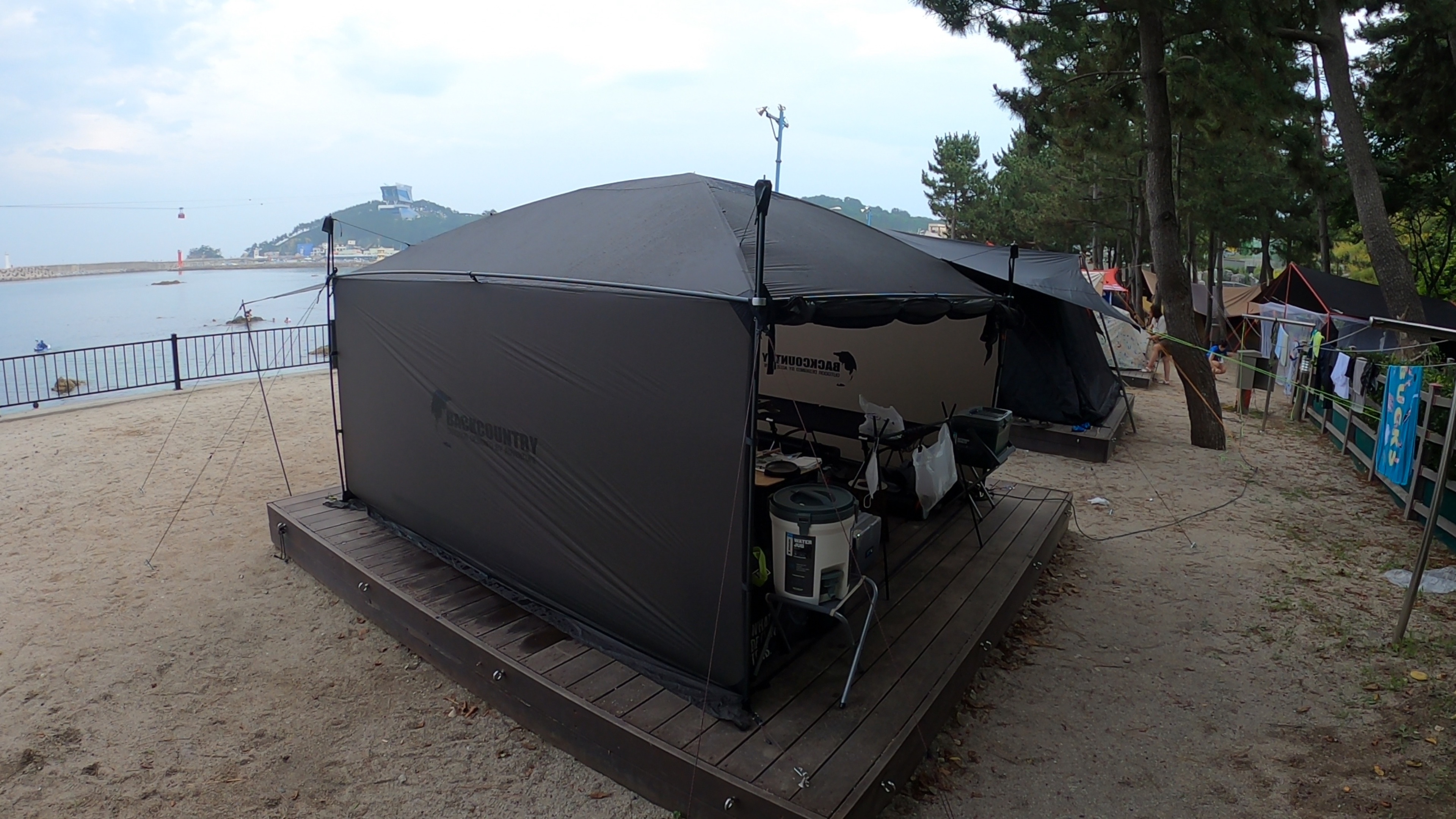 데크사이즈가 마침 3.6m * 3.6m 여서 백컨트리 280 쉘터를 치는데 문제가 없었다.