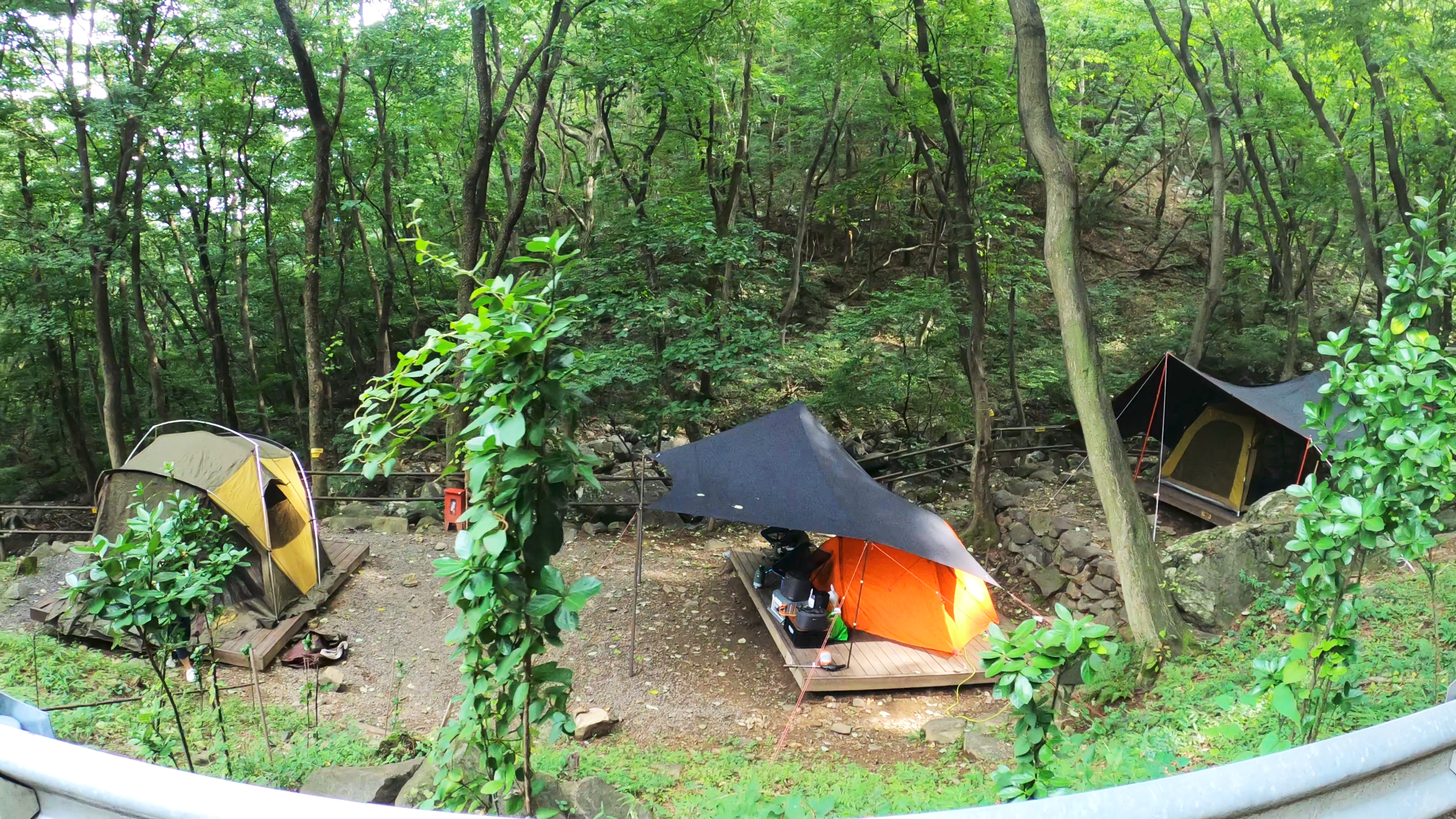다른 사이트들은 사진에서 처럼 일정한 간격으로 인접해있다. 하지만 계곡을 끼로 경사로를 따라서 하나씩 위치하고 있어 모든 사이트들이 나쁘지 않다. 그리고 특히 1.2.3번은 주차장과 워낙 가깝고 차를 근처에 댈수 있어 오토캠핑장이면서 숲속 느낌을 즐길수 있어 좋다.