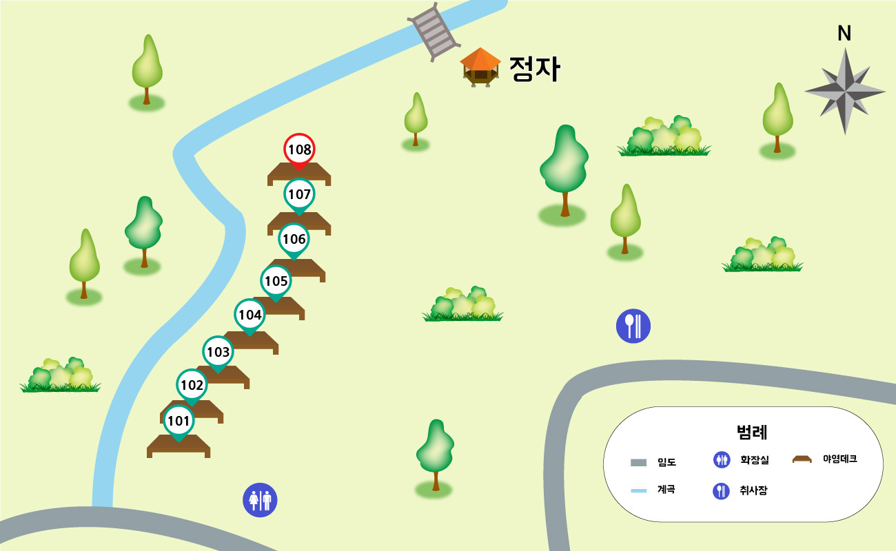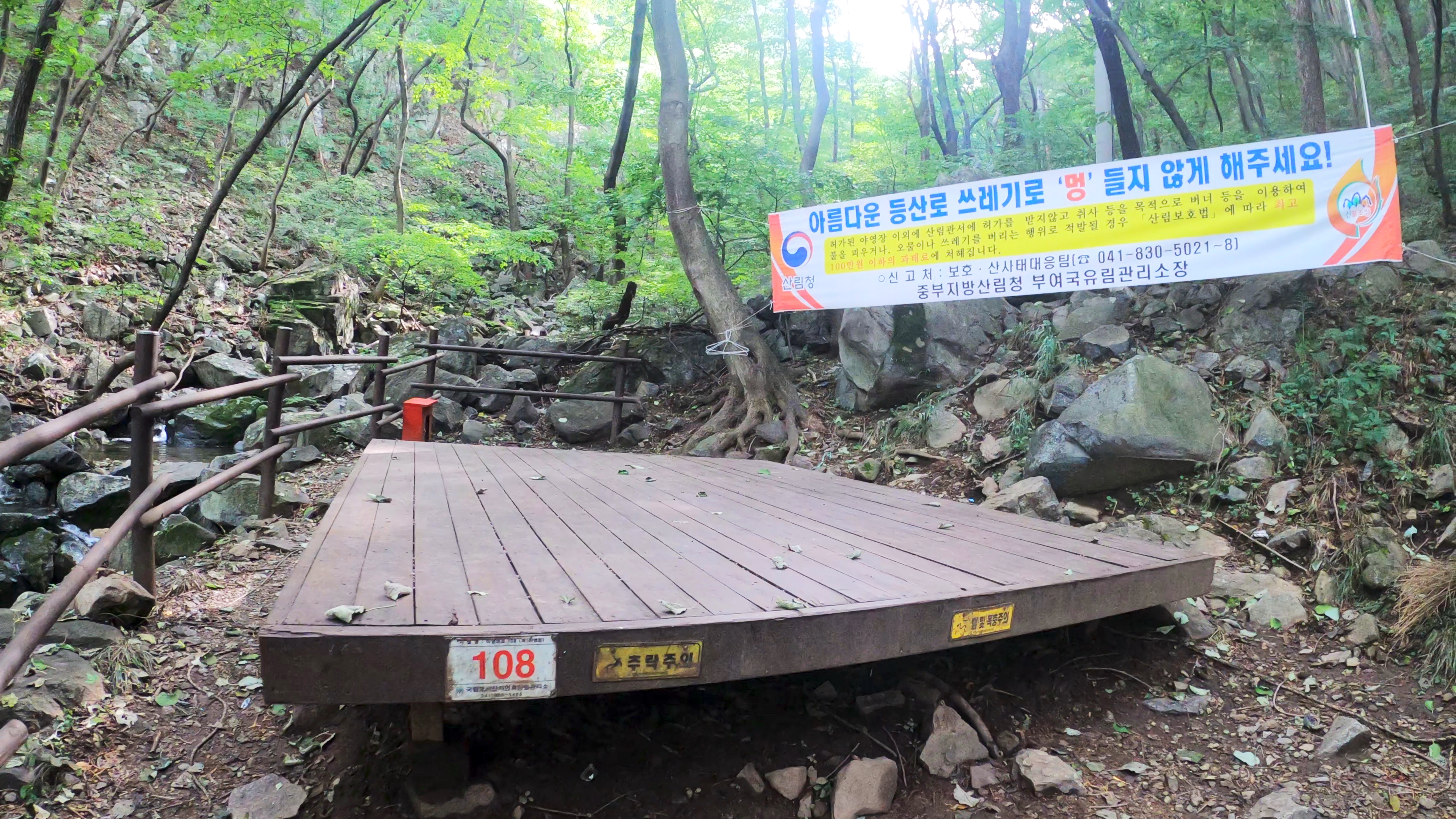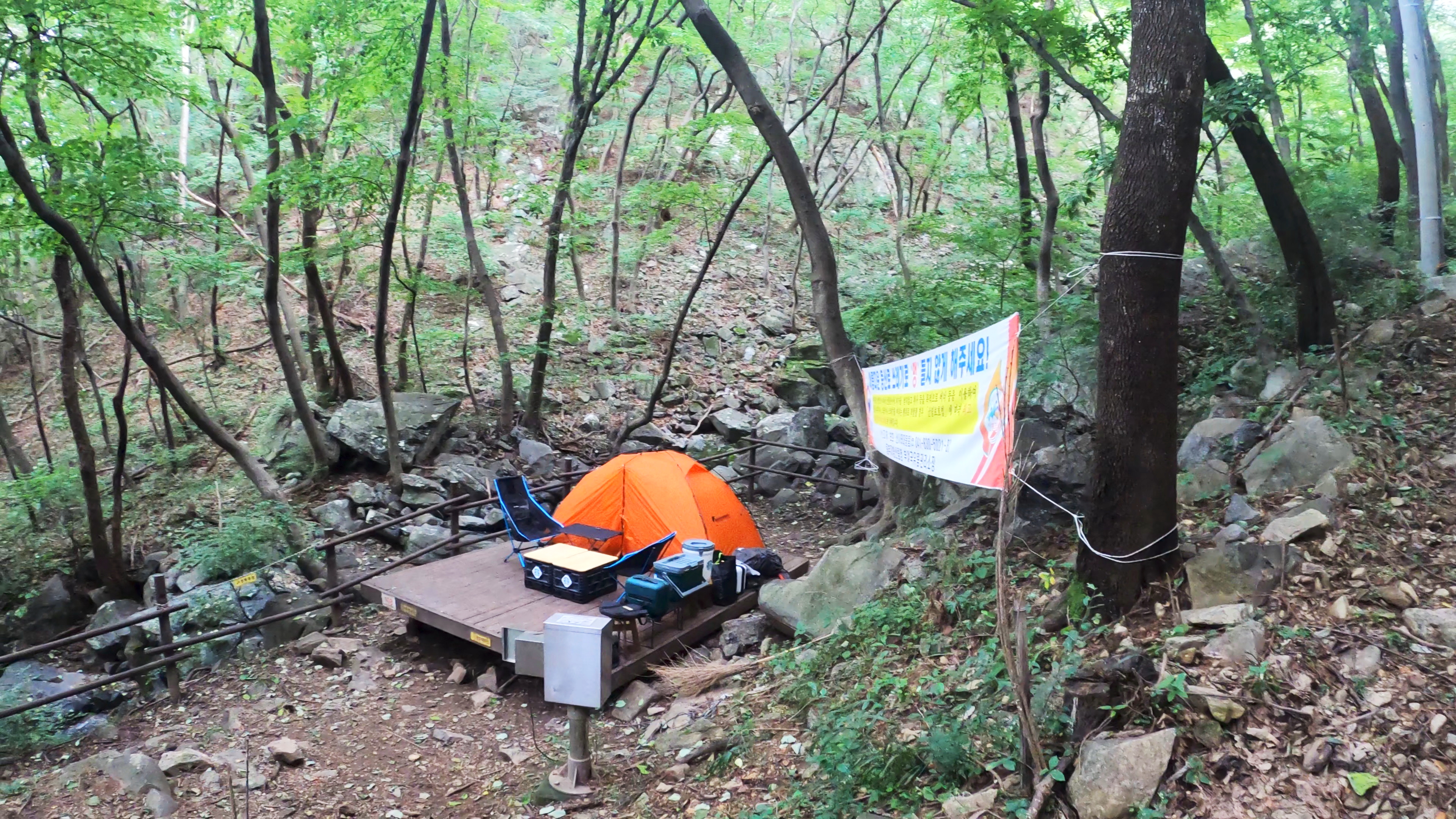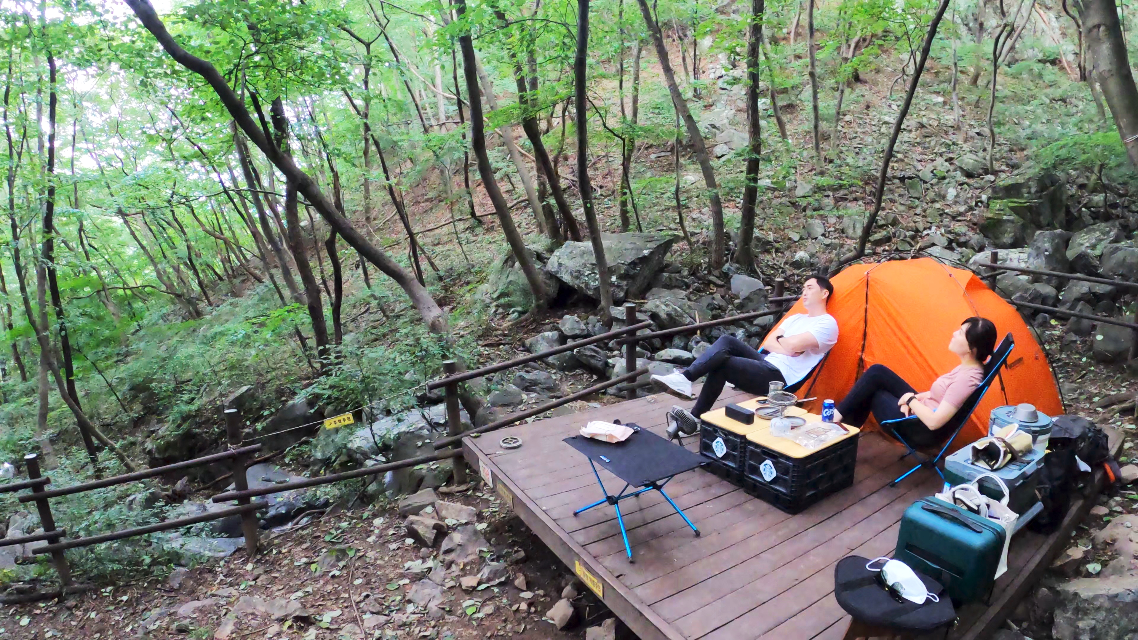 휴양림 도착. 예약한 곳은 108번 데크로, 이 곳 야영장 총 8개의 데크중에서 가장 안쪽에 독립적으로 위치한 사이트로 명당이다.