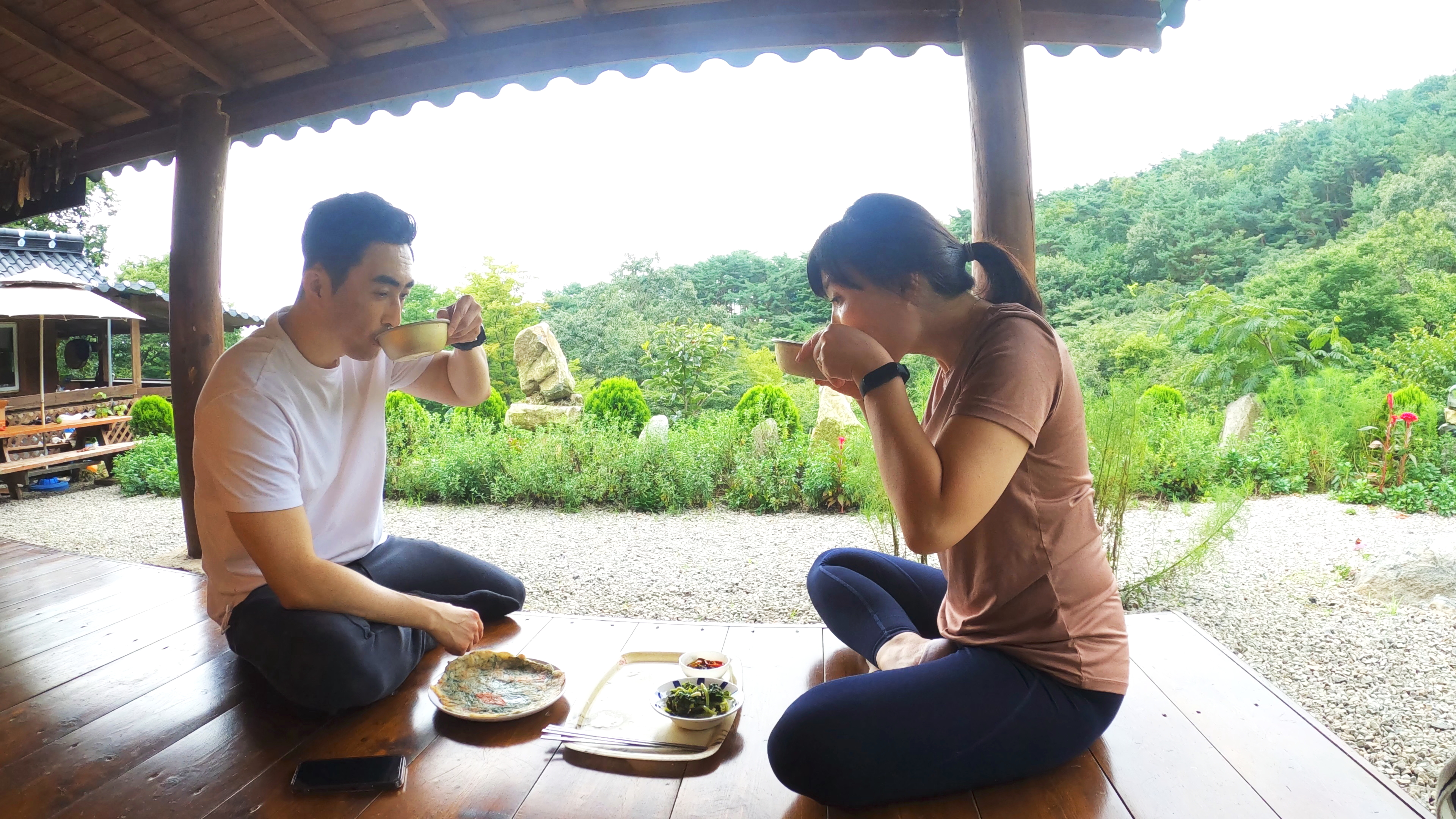 꿀맛 같았던 전과 막걸리. 아마도 막걸리 마셔본 경험이 손에 꼽을 정도로 거의 없긴 하지만 이때 공복 상태에서 약간의 산행후 먹었던 파전과 막걸리는 최고의 맛 이었다. 같이 주셨던 파김치도 맛 있었고