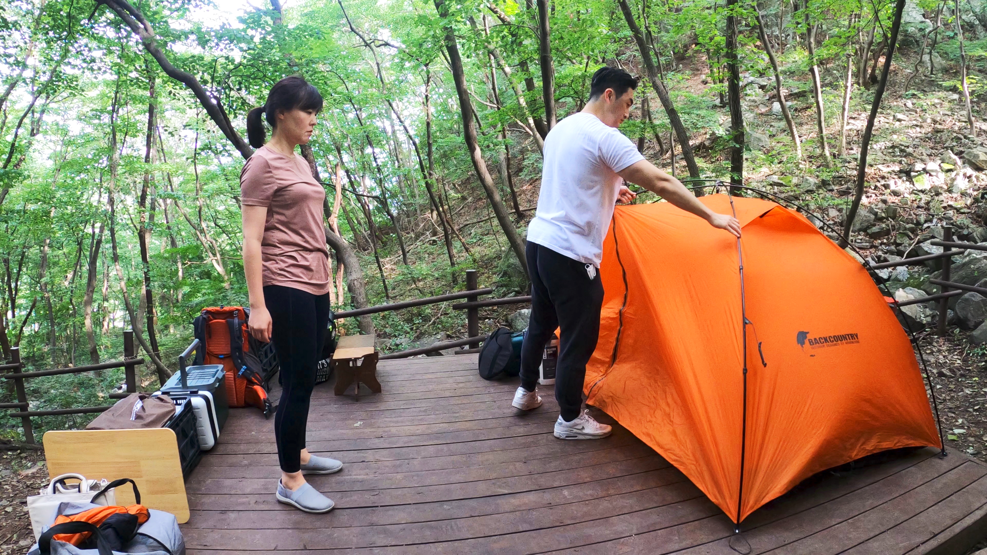 휴양림 도착. 예약한 곳은 108번 데크로, 이 곳 야영장 총 8개의 데크중에서 가장 안쪽에 독립적으로 위치한 사이트로 명당이다.
