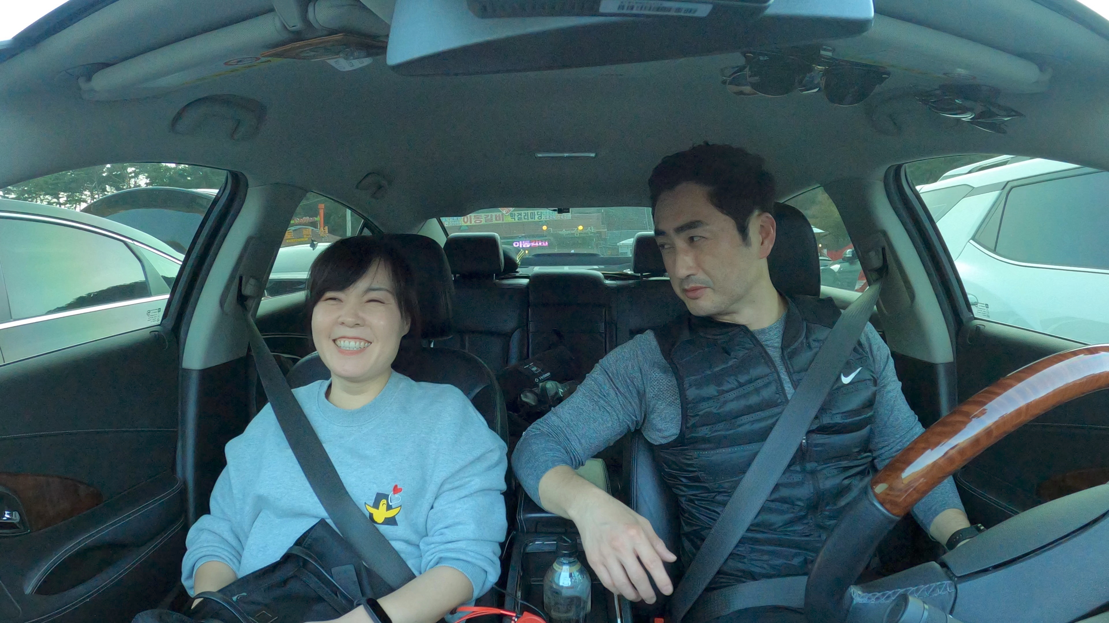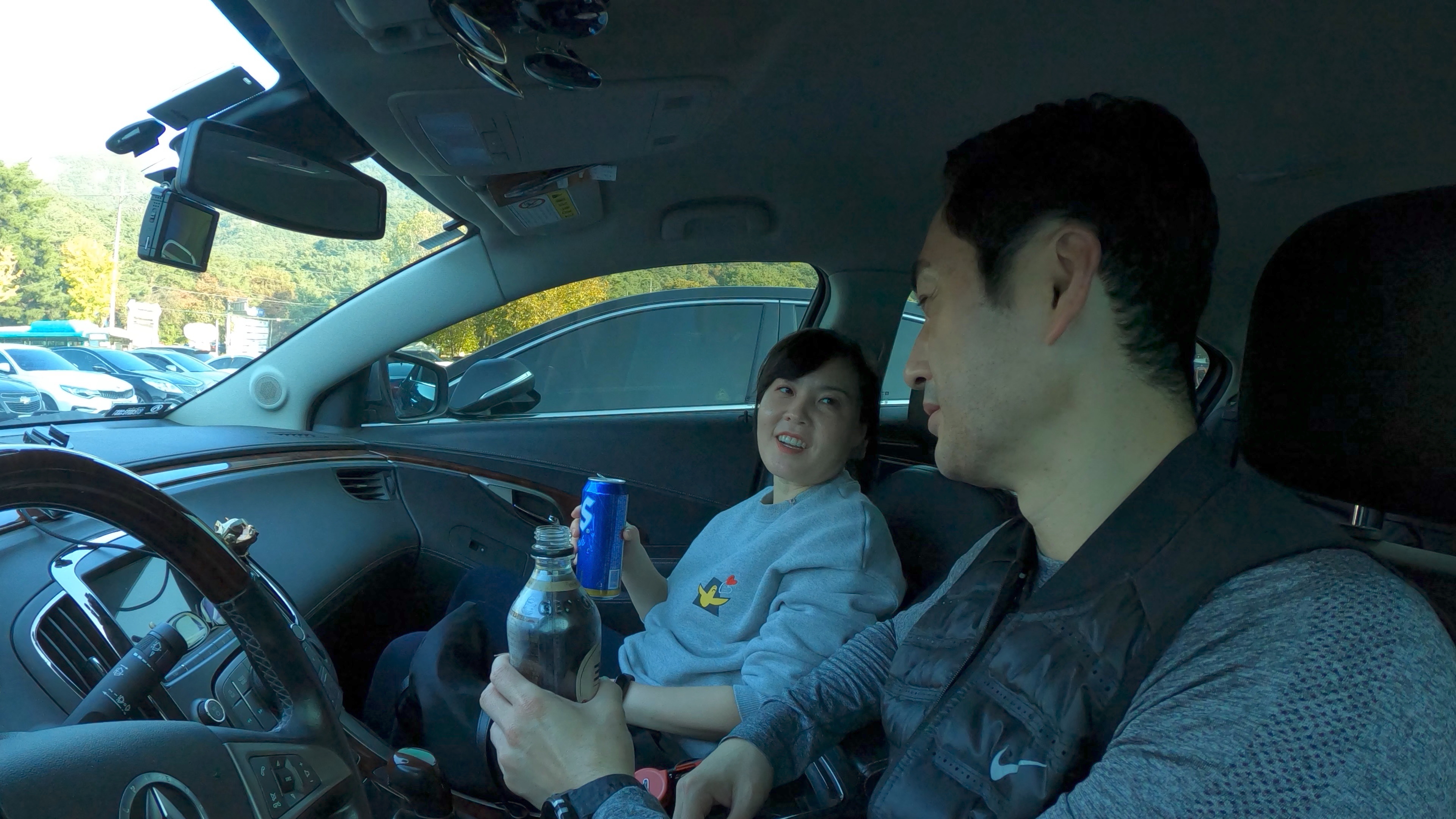 산에서 음주를 자제하라는 표지판에, 맥주를 마시지 않고 꾹 참았던 와이프. 결국 차에서 미리 준비했던 맥주를 들이킨다.