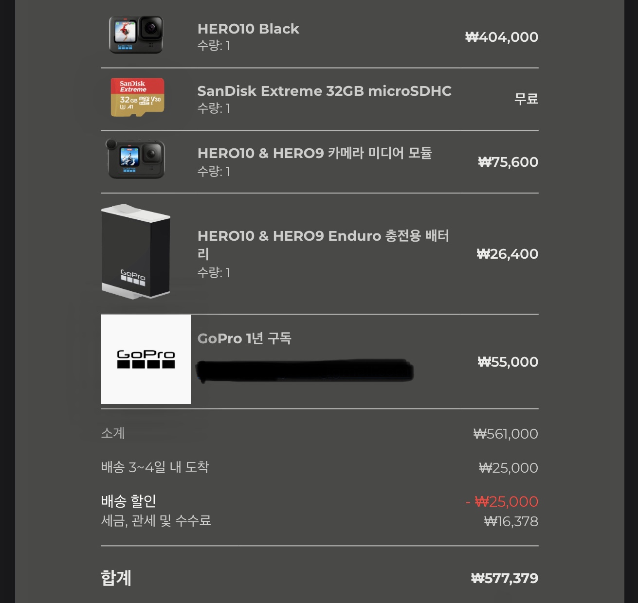 본인은 GoPro.com의 GoPlus 구독서비스를 사용중이었으나, 구독하지 않는 계정으로 사는것이 유리하여 다른 계정으로 1년구독과 함께 구입하였다.