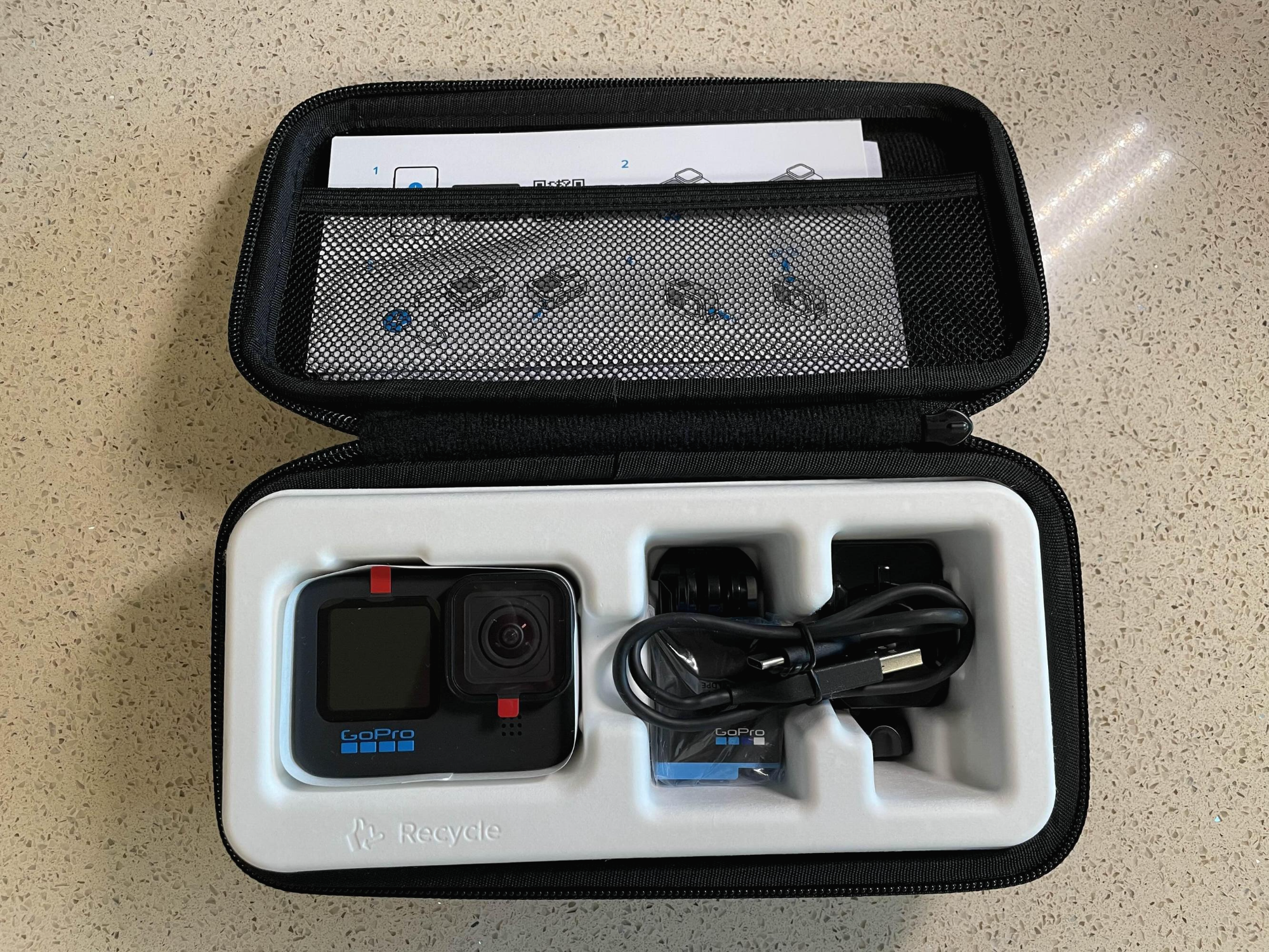 별도의 케이스에 수납되어 배송이 되었다. 구성품은 본체, 메모리, 케이블, 배터리1개, 고프로 마운트