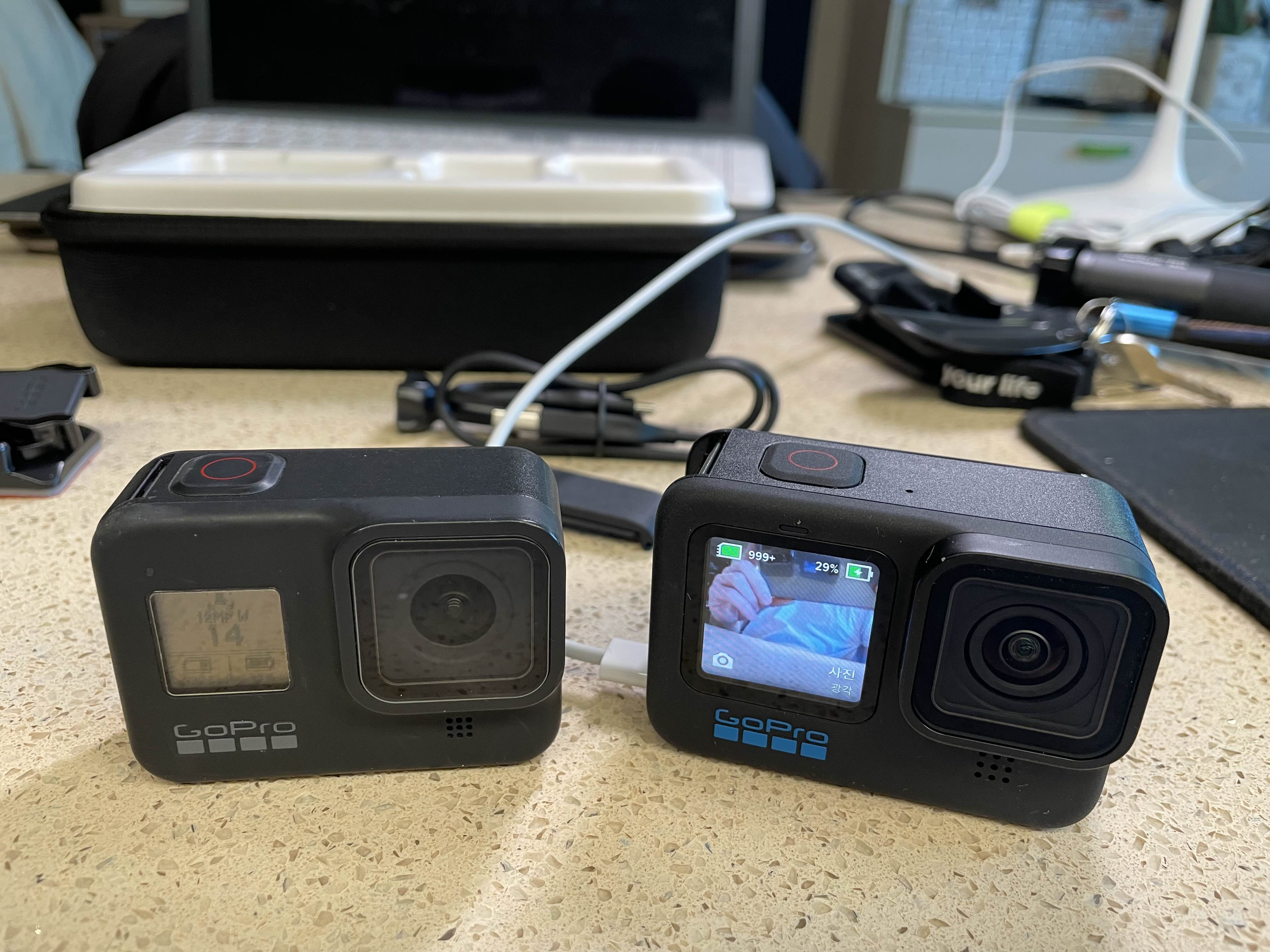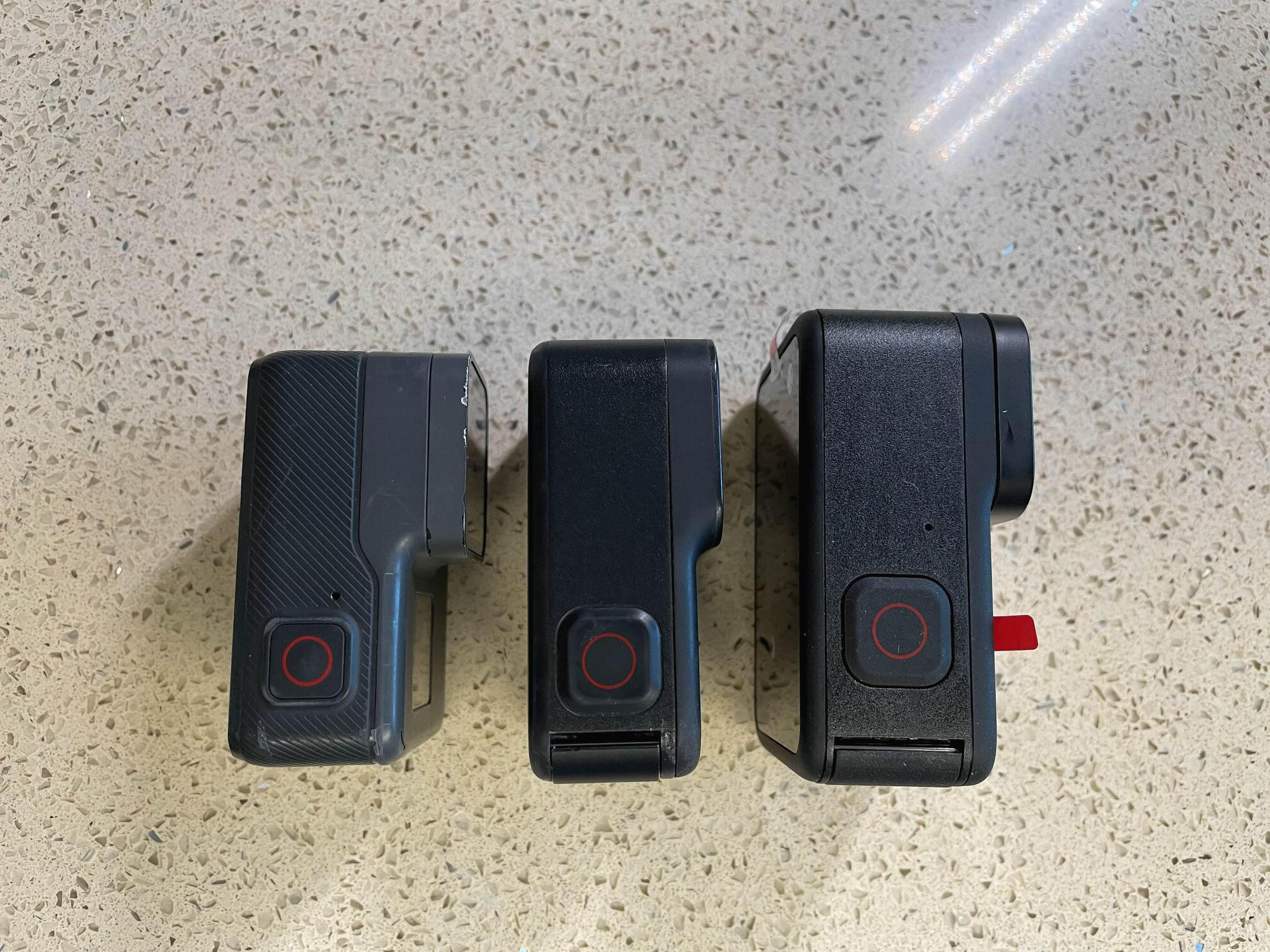 고프로5, 고프로8, 그리고 고프로10. 신제품으로 갈수록 점점 커진다. 5 (16년구입) -> 8 (19년구입) > 11로 갔었어야 하는데, 1년 당겼다.