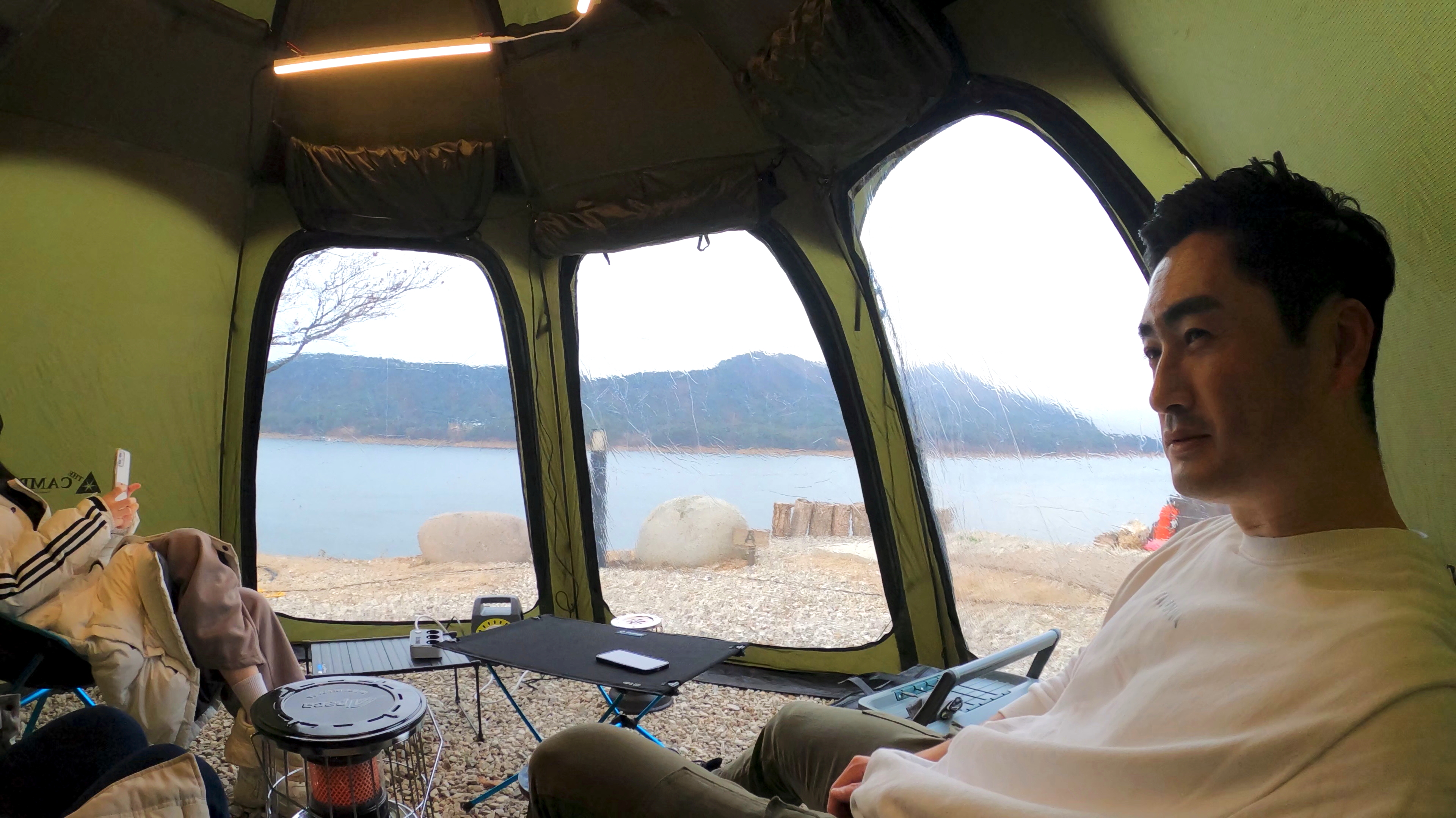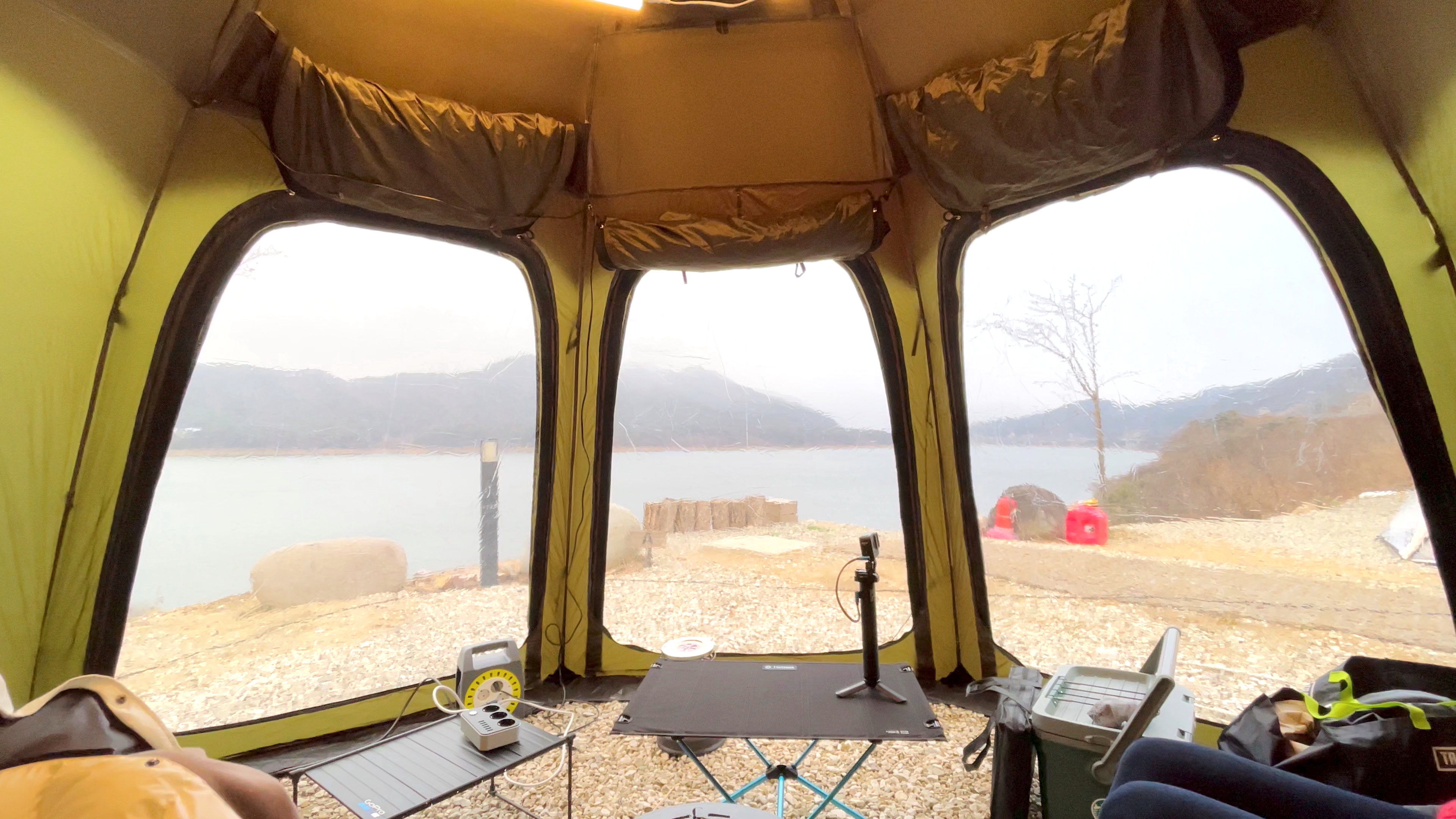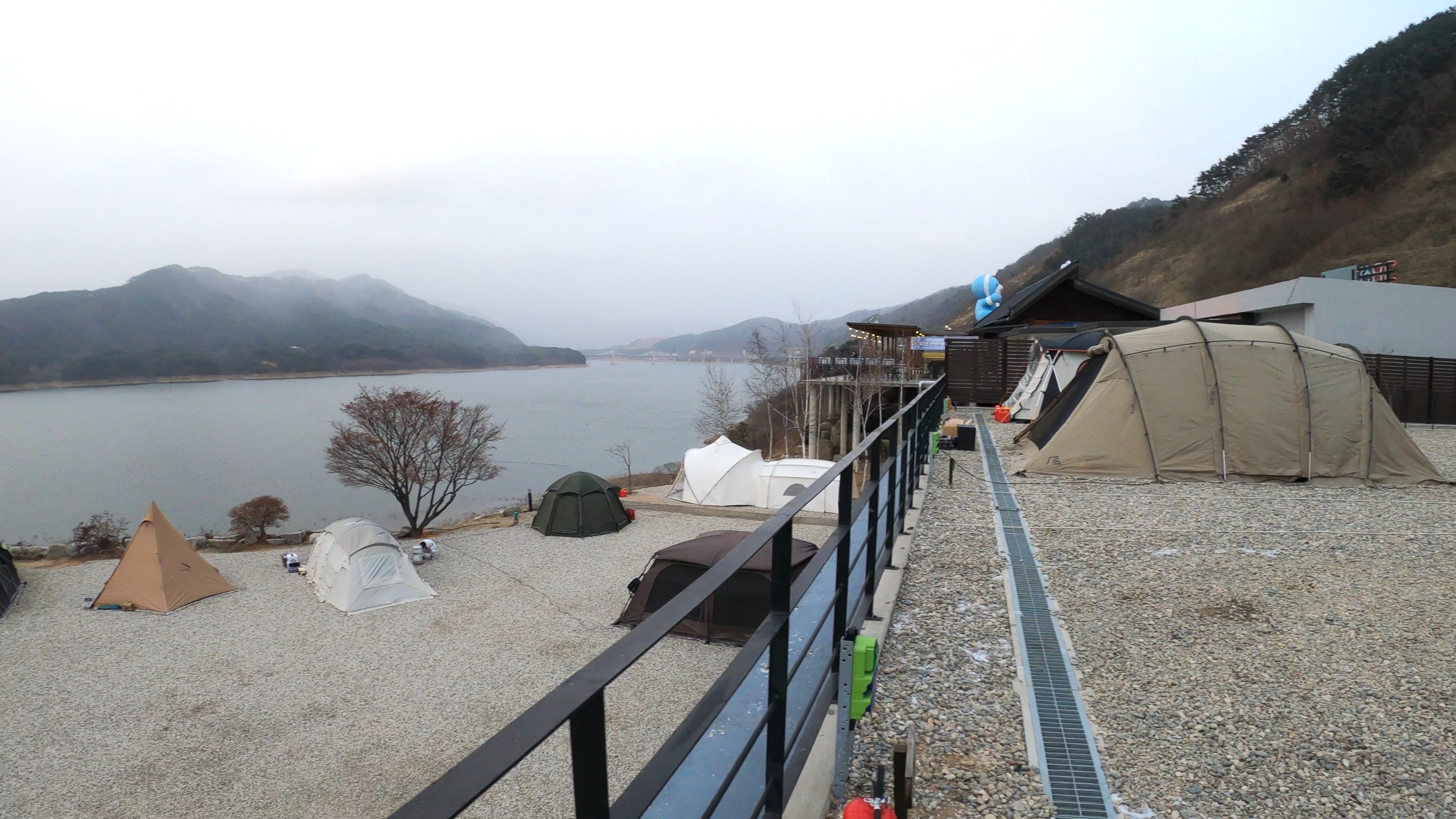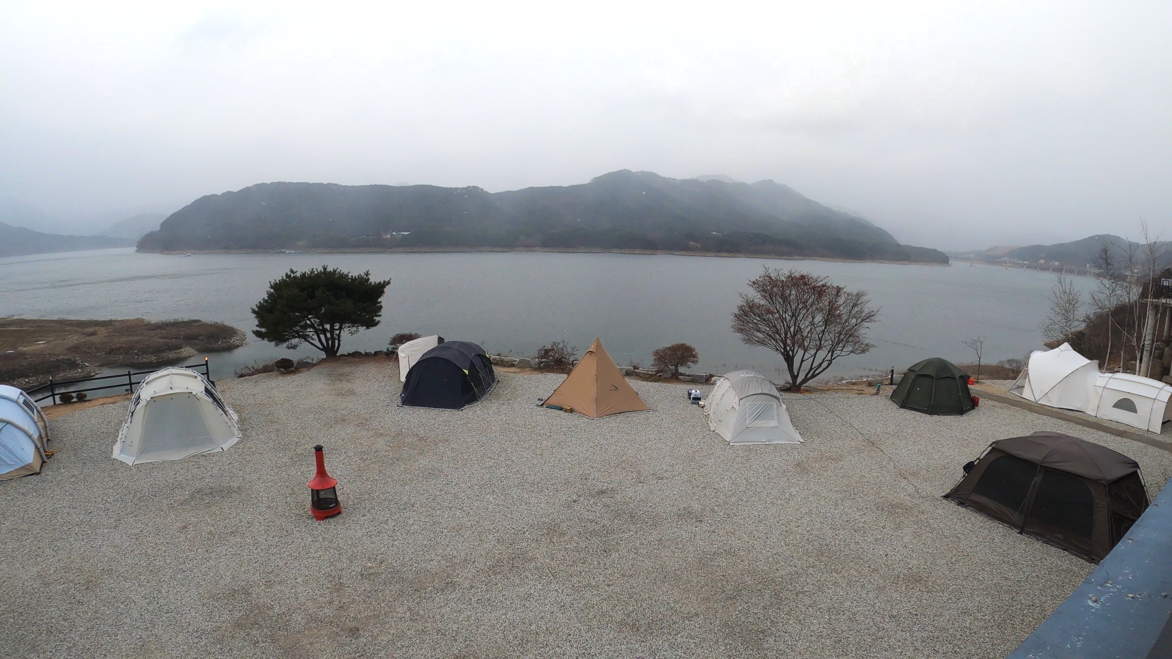 강이 보이는 곳에 바짝 붙여서 텐트를 설치하였다.