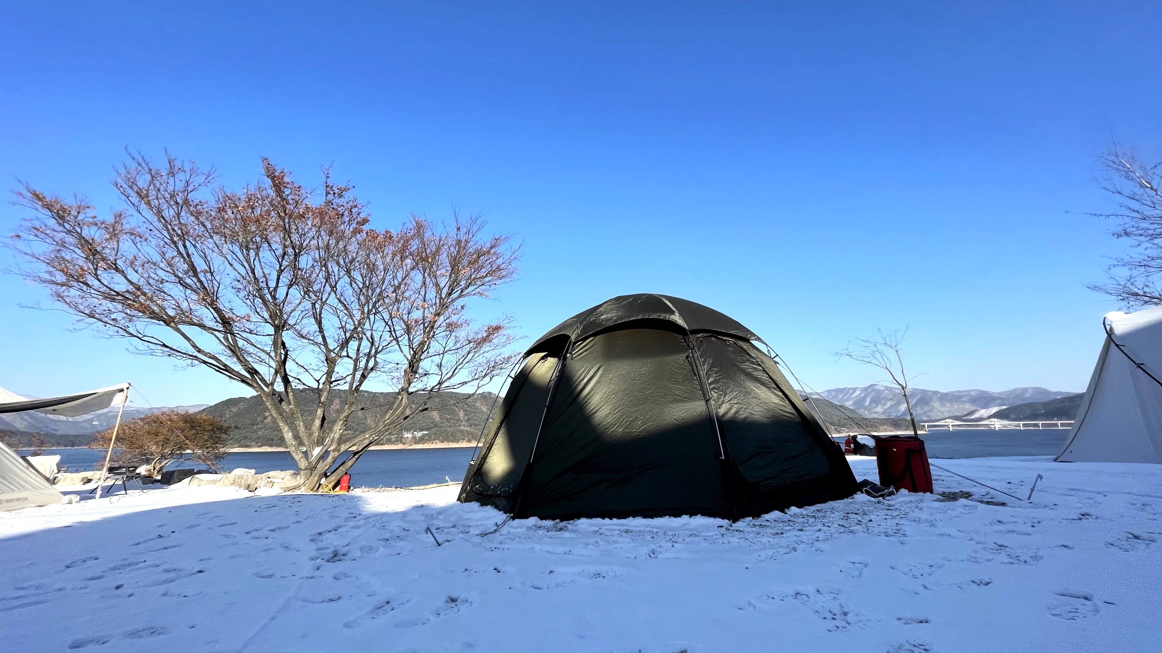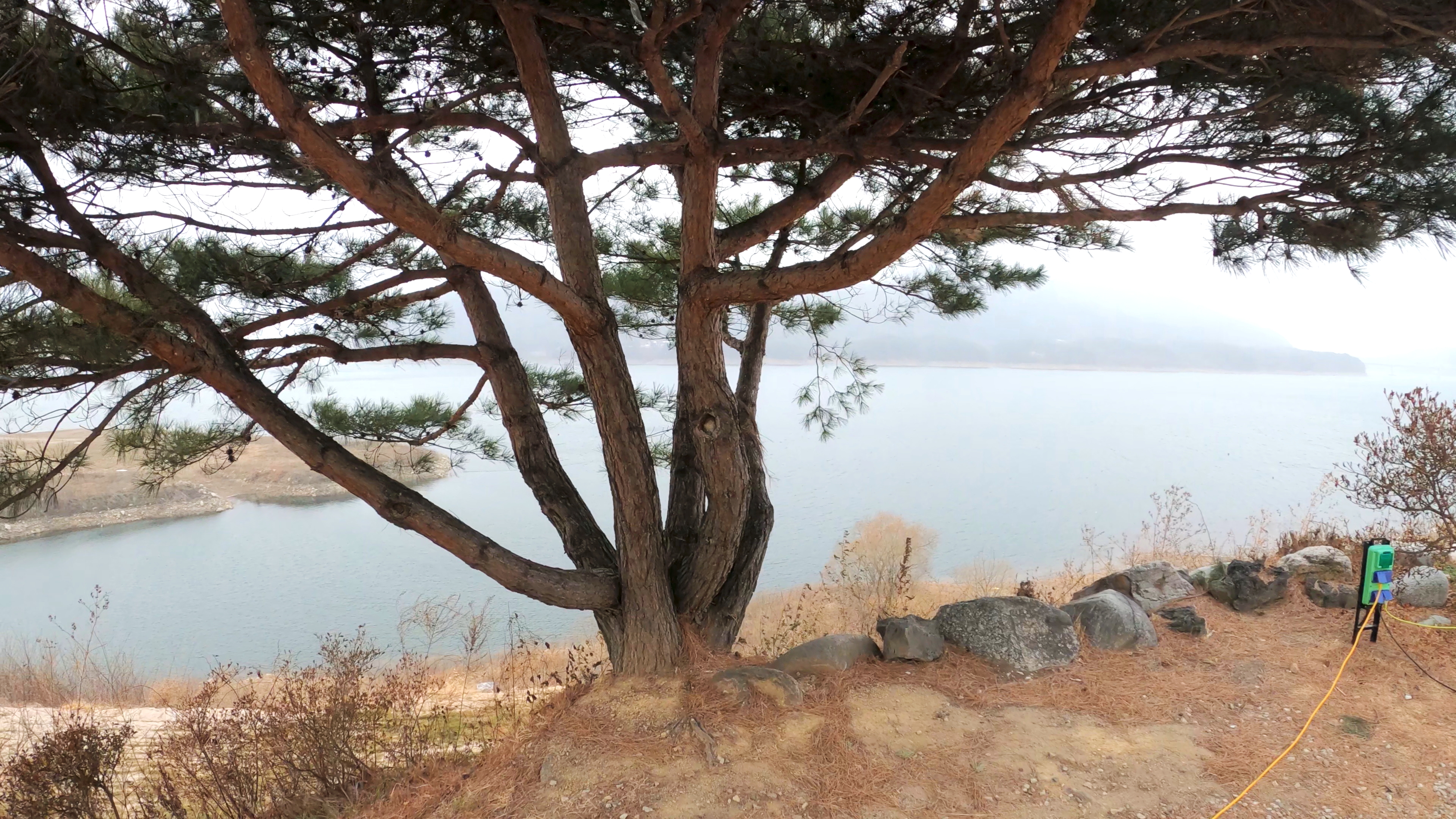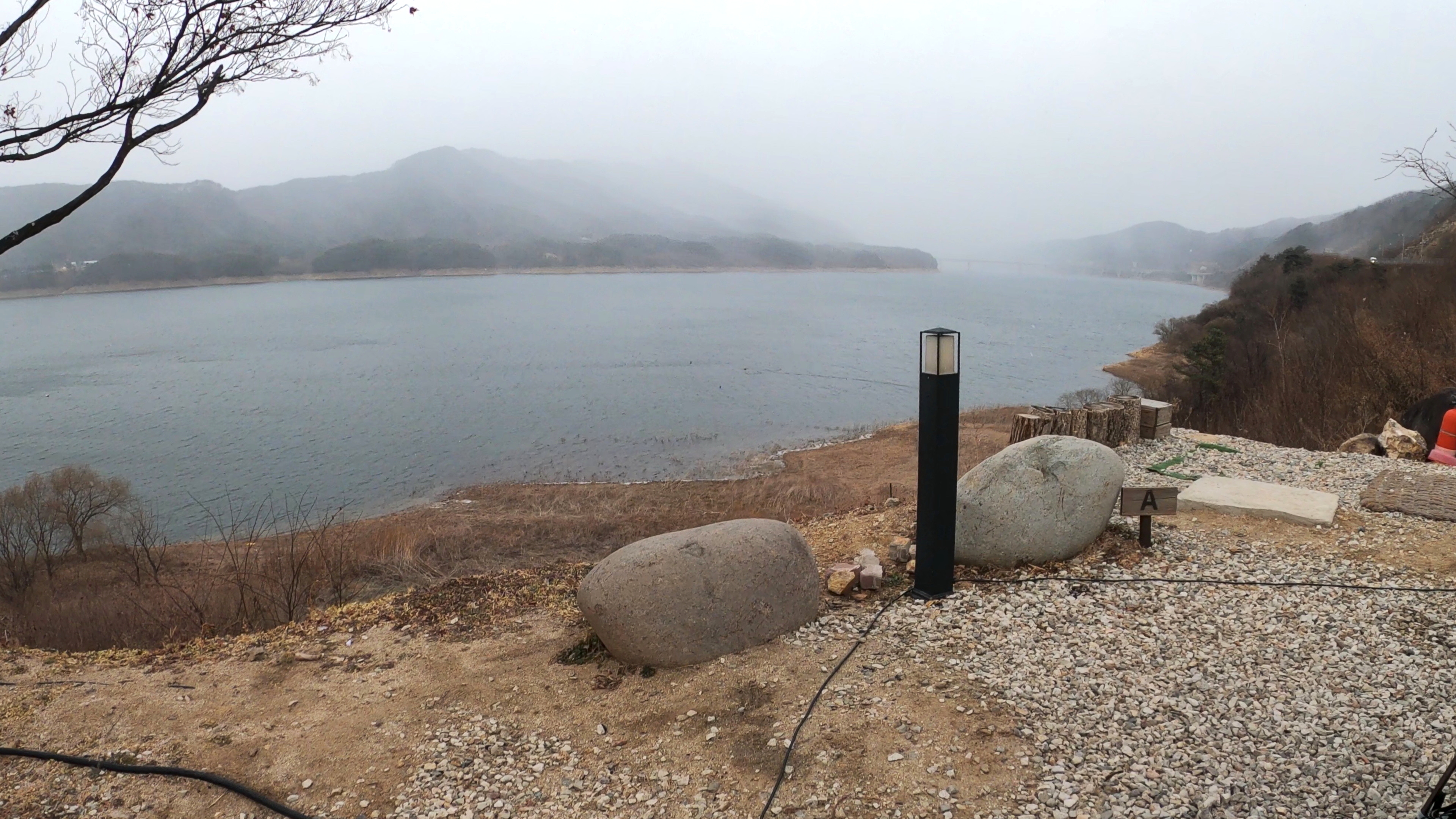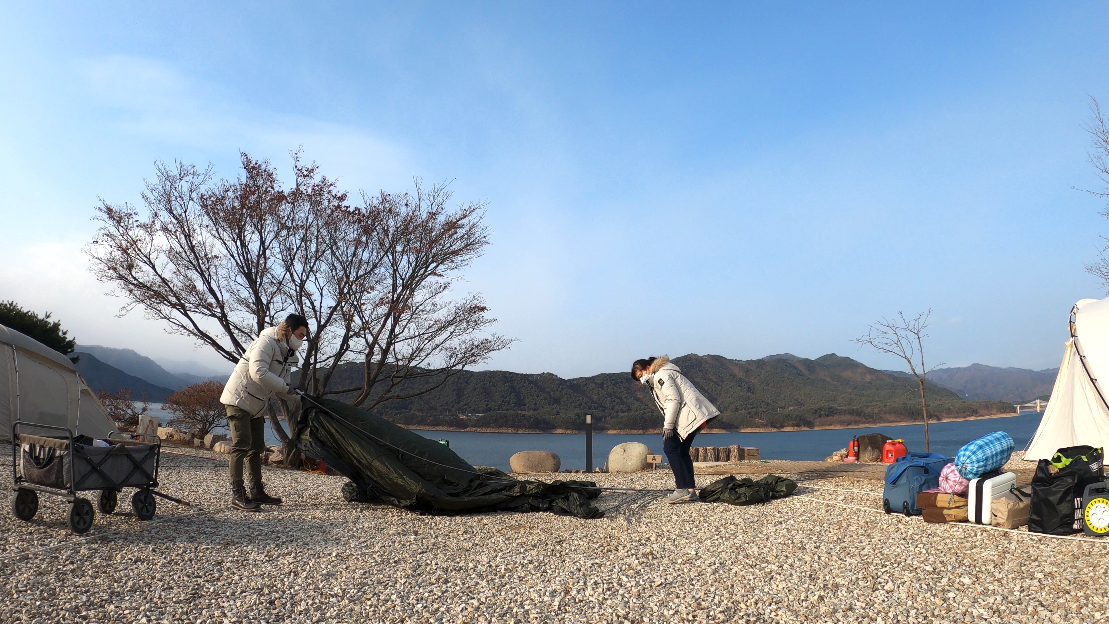 강이 보이는 곳에 바짝 붙여서 텐트를 설치하였다.