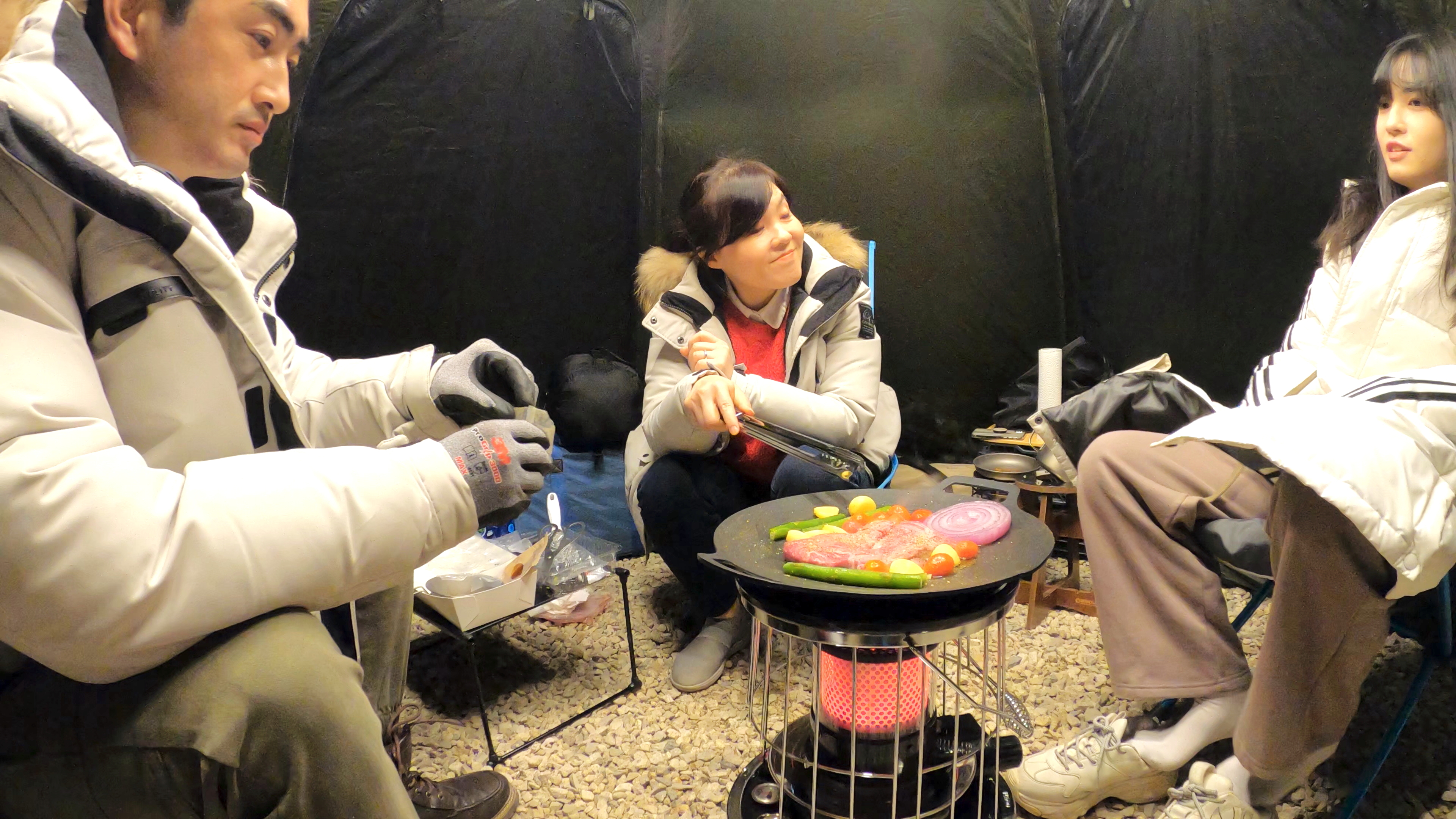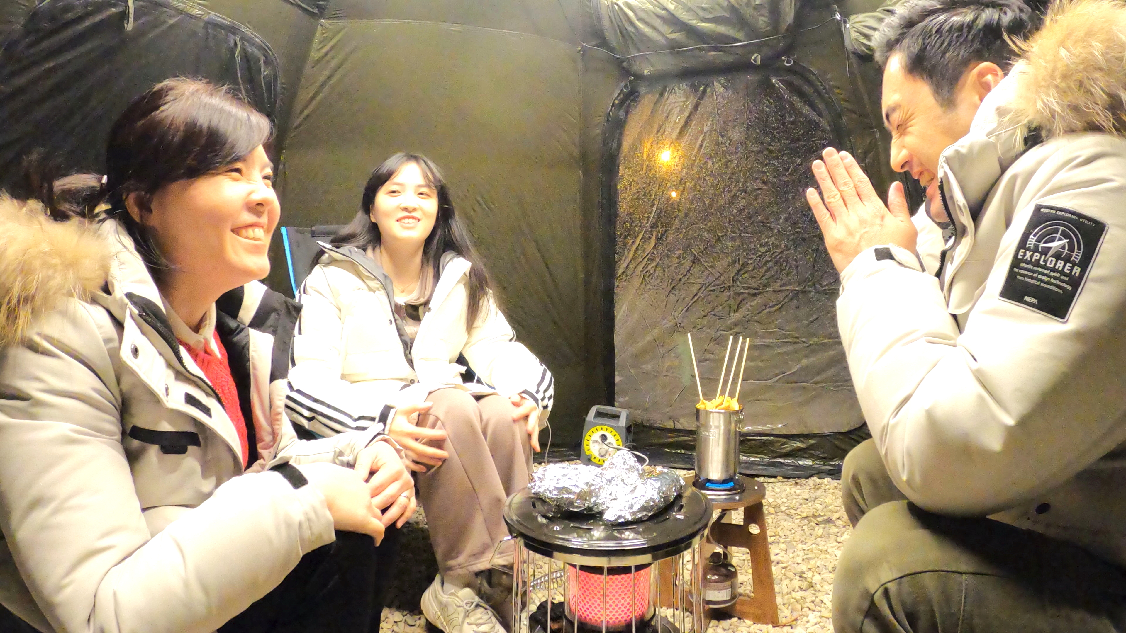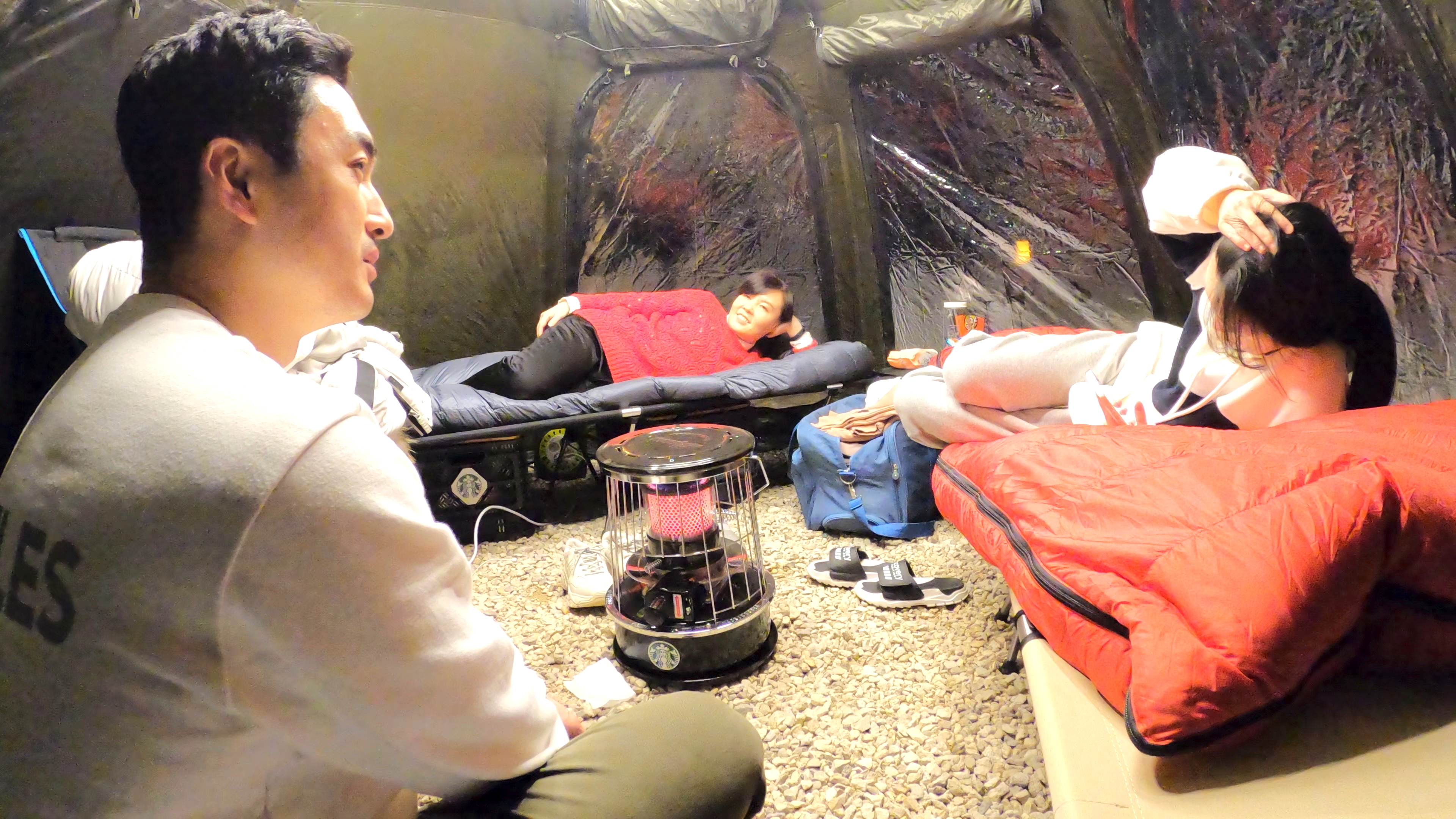 잠을 자기 위해 이그니스L쉘터에 야전침대를 3개를 설치하니 꽉 찬다. 모든 짐이 쉘터 안에 있고 야전침대 까지 하니 상당히 비좁았다. 2인이상 숙박을 할 경우 쉘터를 두동을 치던, 쉘터+텐트도킹을 해서 공간을 확보해야 할것으로 보인다.