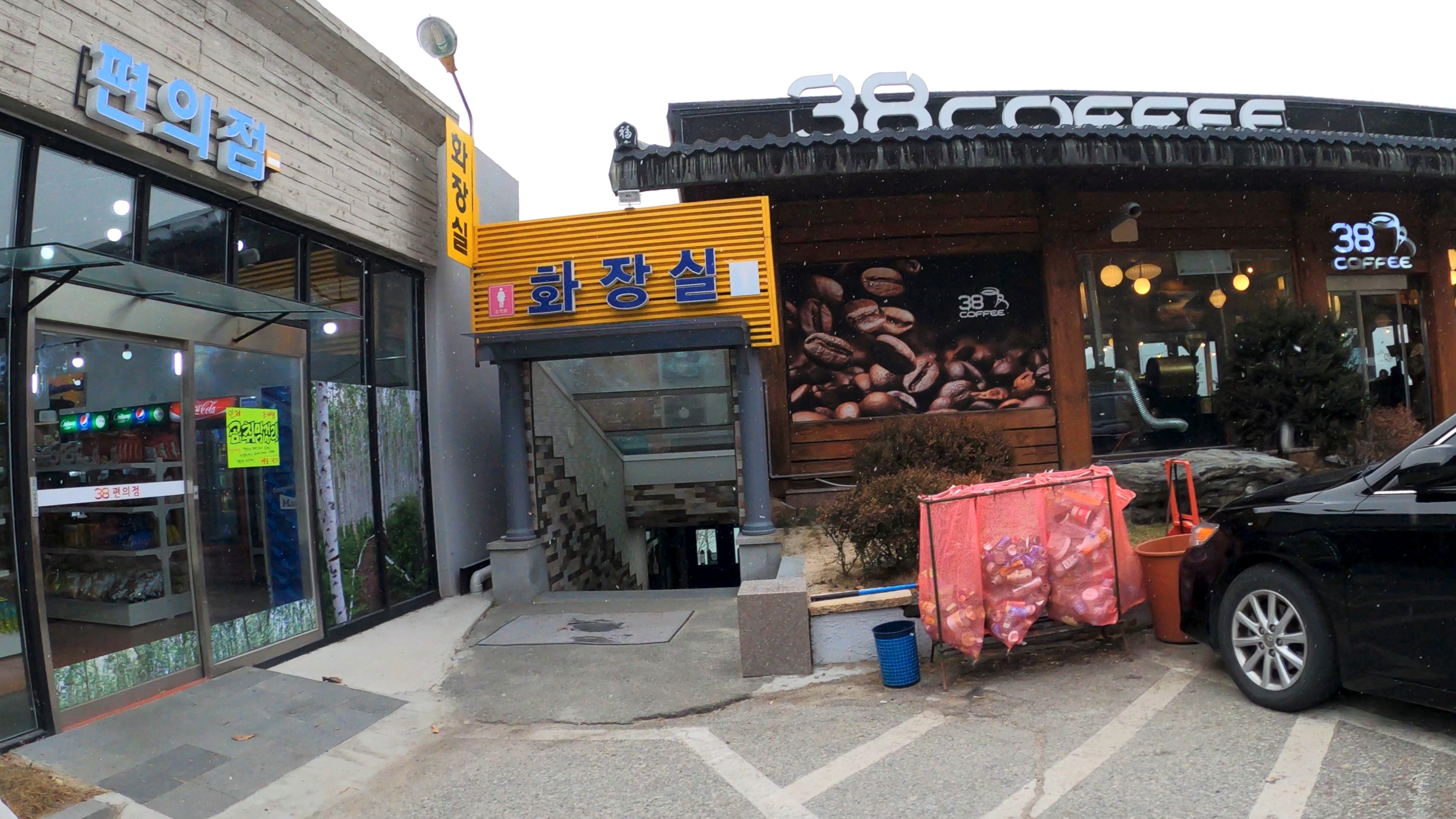 위쪽으로 올라가면 휴게소인데, 편의점과 카페가 있다. 화장실은 캠핑장에서도 연결이 되고, 카페/편의점이 같이 쓰는 공간으로 보였다.