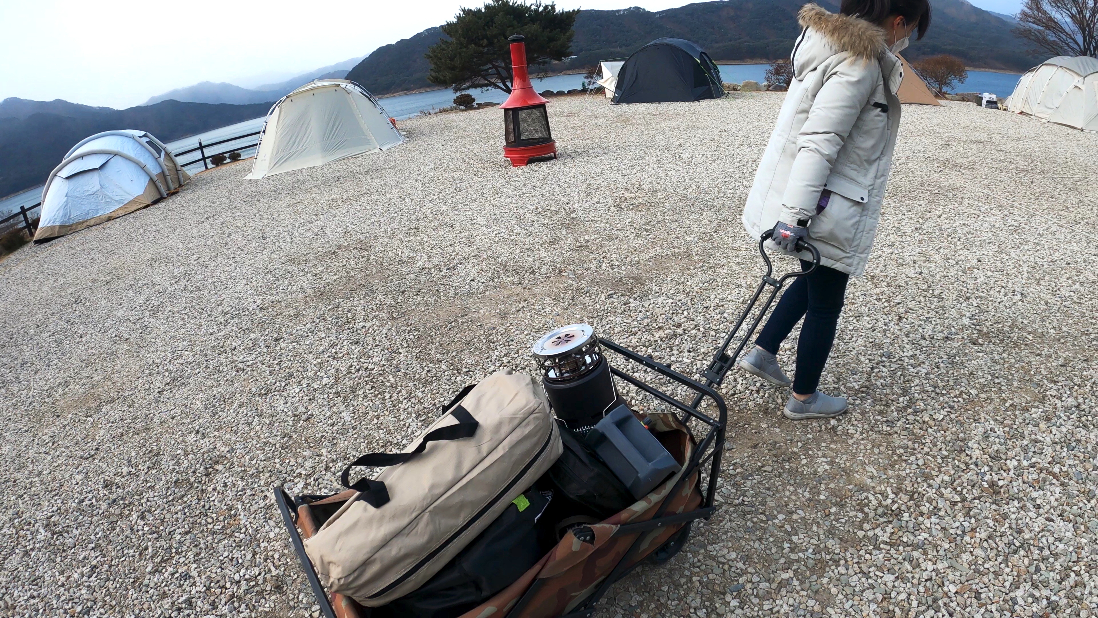 짐은 캠핑장 입구에 잠시 대 놓고 짐을 캠핑장에 비치된 카트를 이용해서 옮기는 형태. 차는 다시 위의 휴게소 주차장에 주차해두면 된다. 이미 많은 자리들에 텐트가 쳐 있었던 걸로 보아 다들 장박하는 사람들로 보였다.