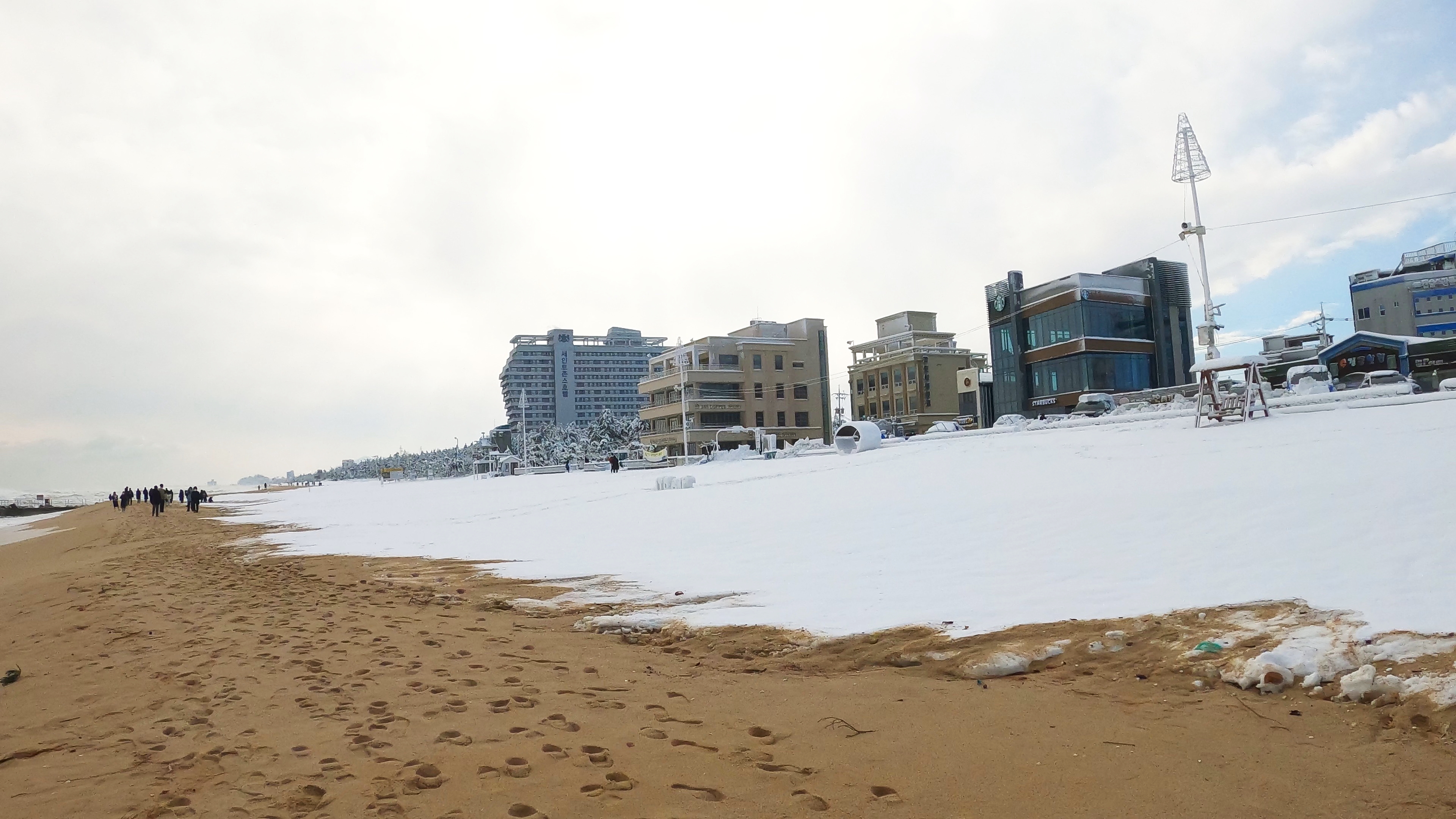 이미 많은 사람들이 여기저기서 이름 아침 눈 쌓인 해변을 즐기고 있었다.