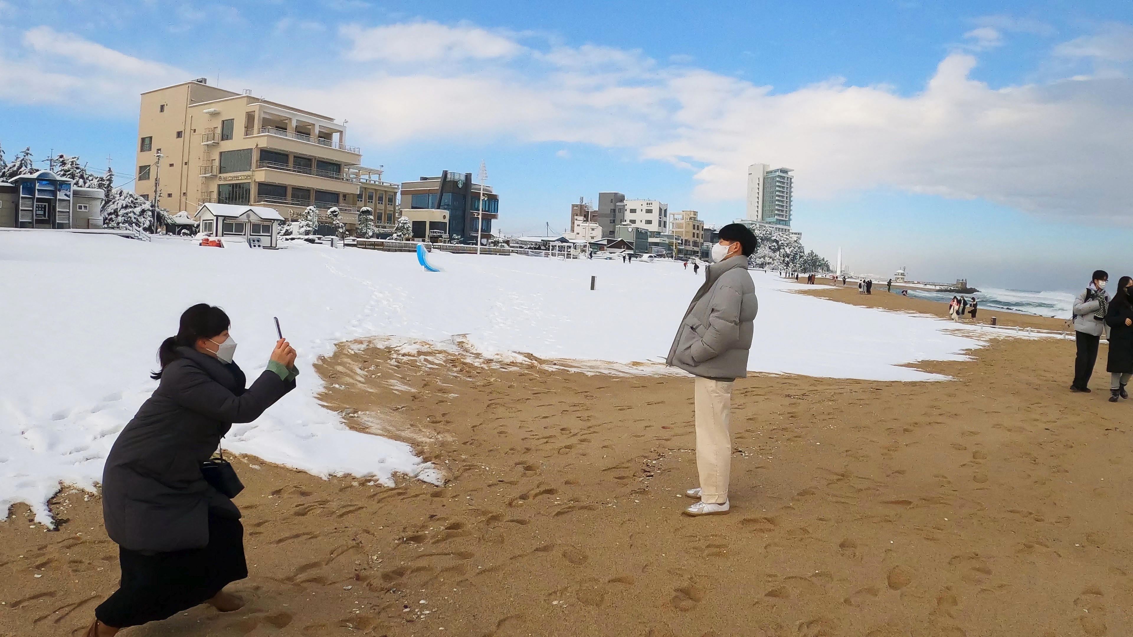 이미 많은 사람들이 여기저기서 이름 아침 눈 쌓인 해변을 즐기고 있었다.