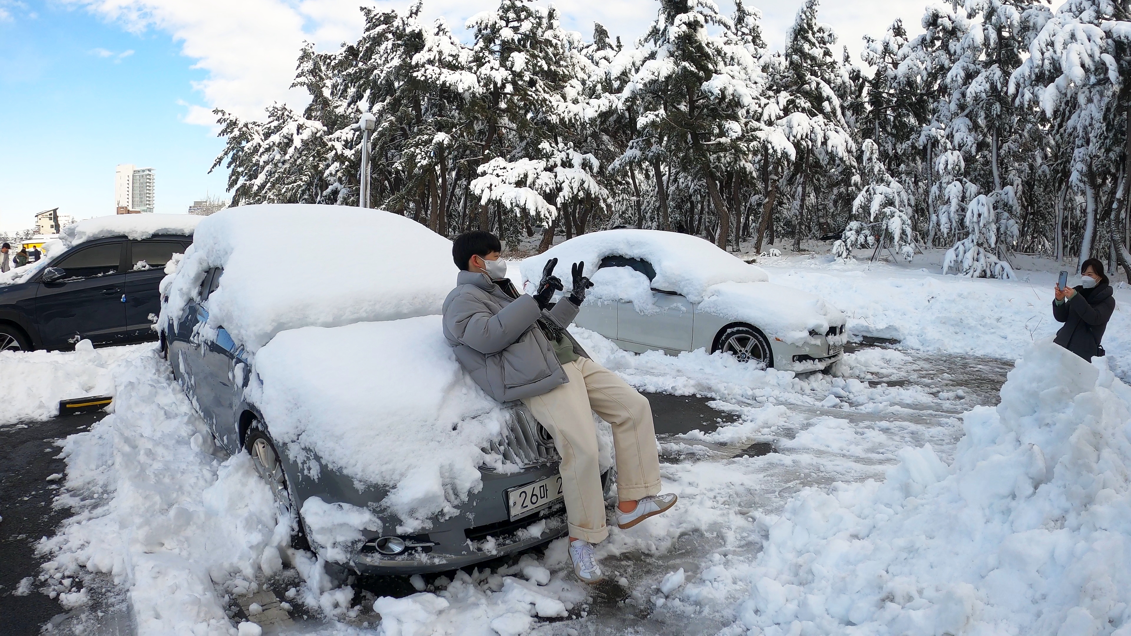 주차장으로 왔더니, 차 위로 눈이 엄청나게 쌓여 있고 차를 뺄수도 없는 상황.