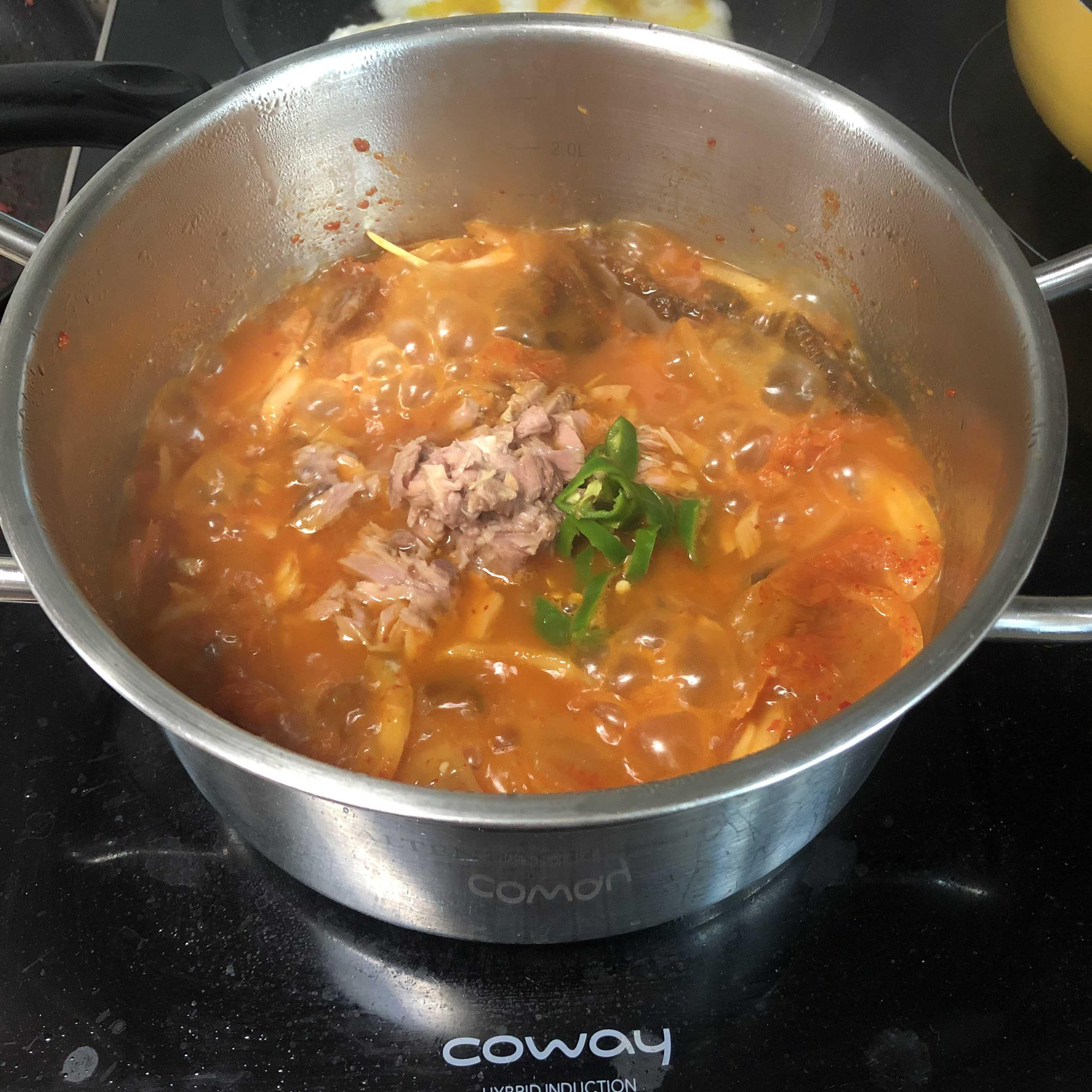 어느정도 보글보글 끓으면 참치와 두부, 대파, 청양고추를 넣고 폭 끓인다.