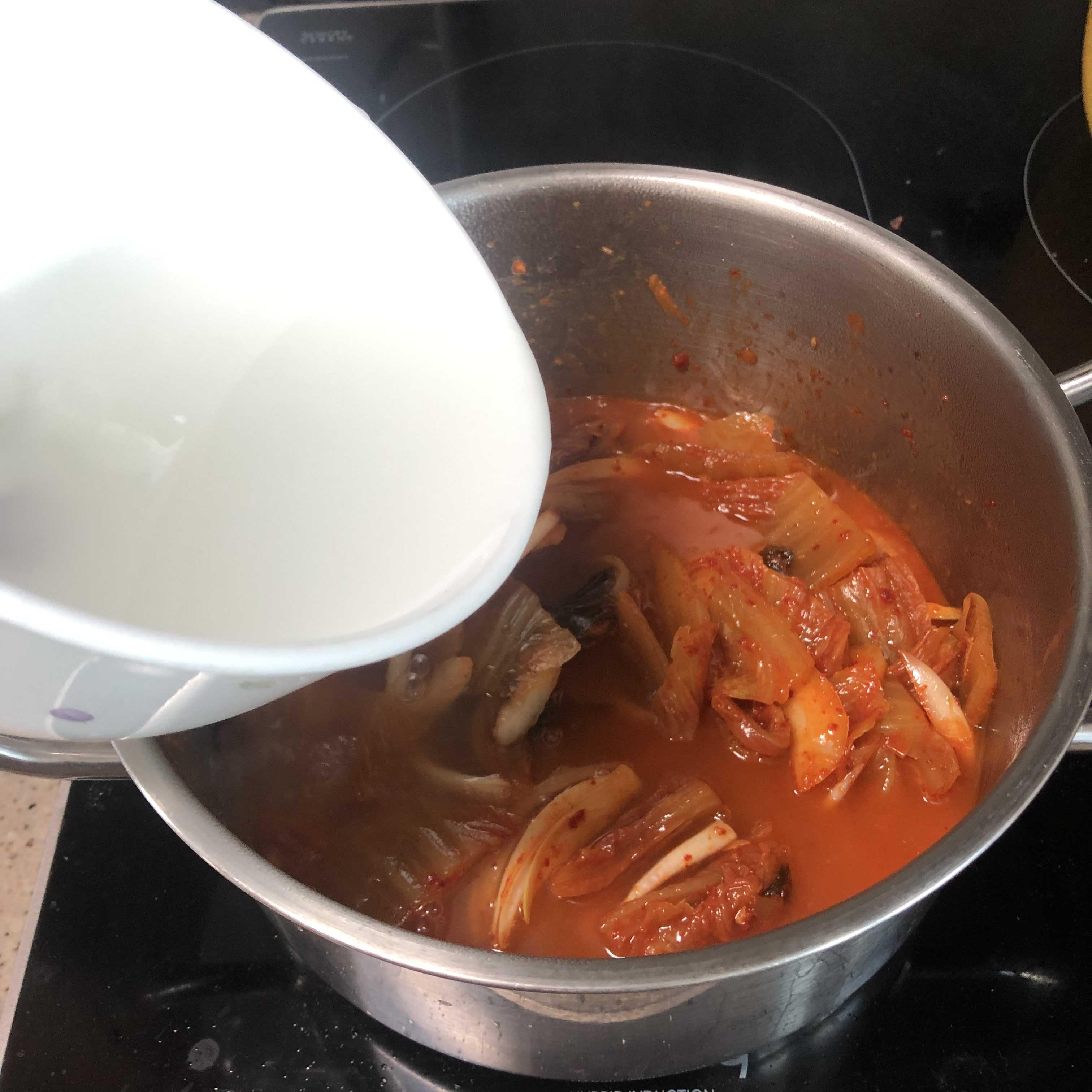 쌀뜨물을 붓고 끓인다. 국간장, 고춧가루로 밑간을 잡아준다.