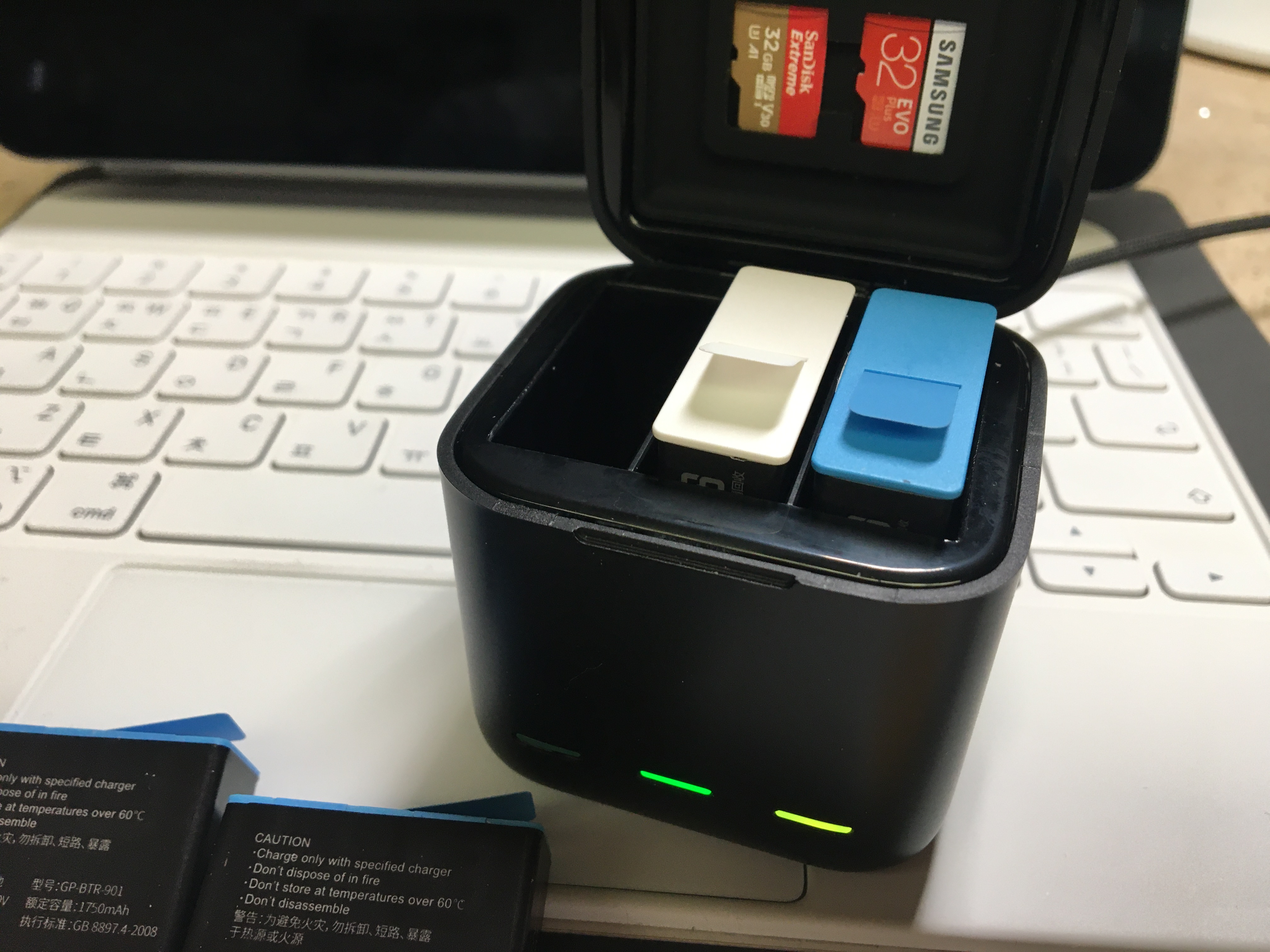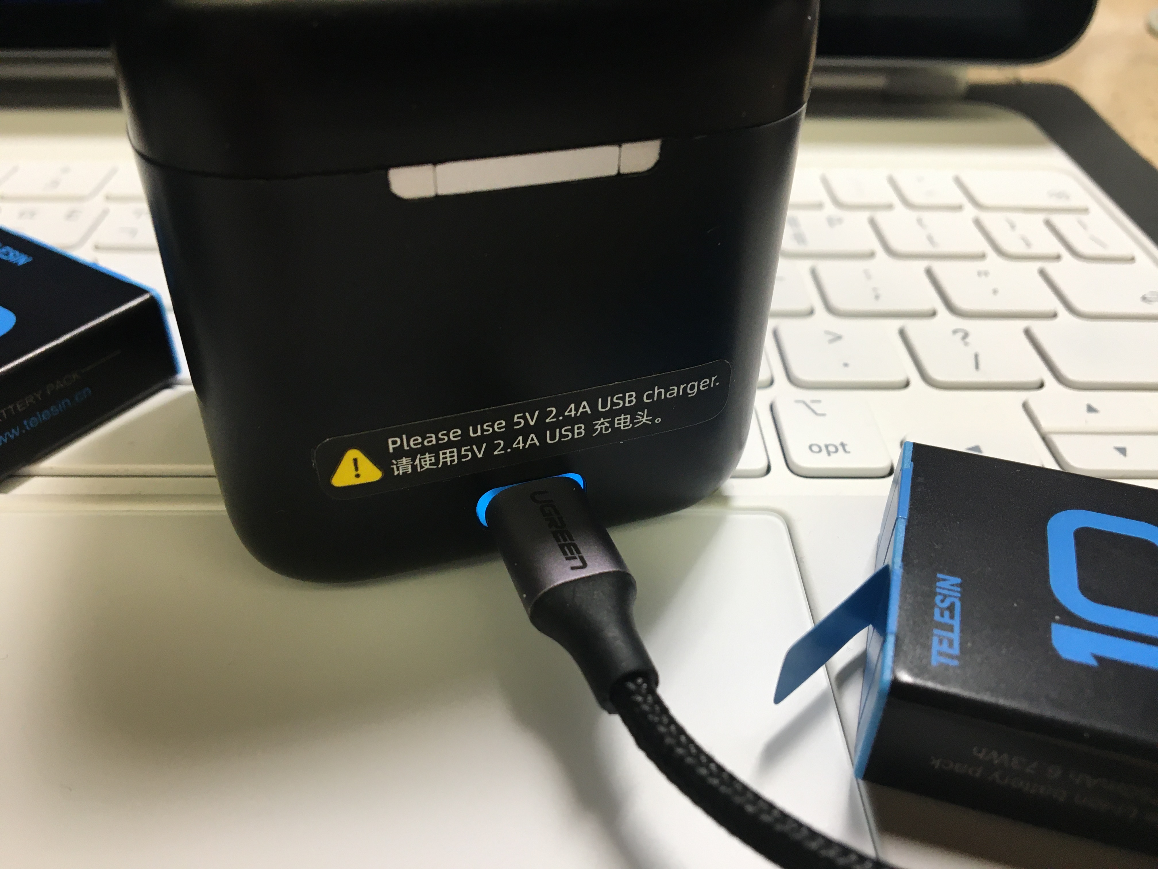 사이즈가 아담하고 ( 5.7cm * 5.1cm * 5.9cm) USB-C 충전으로 3개 배터리를 동시 충전이 가능한 제품이다. 뚜껑에 TELESIN (알리에서는 고프로 호환 배터리 브랜드로 꽤 유명) 마크가 찍혀 있는데, 고프로10 살때 받은 스티커로 가려 버렸다.