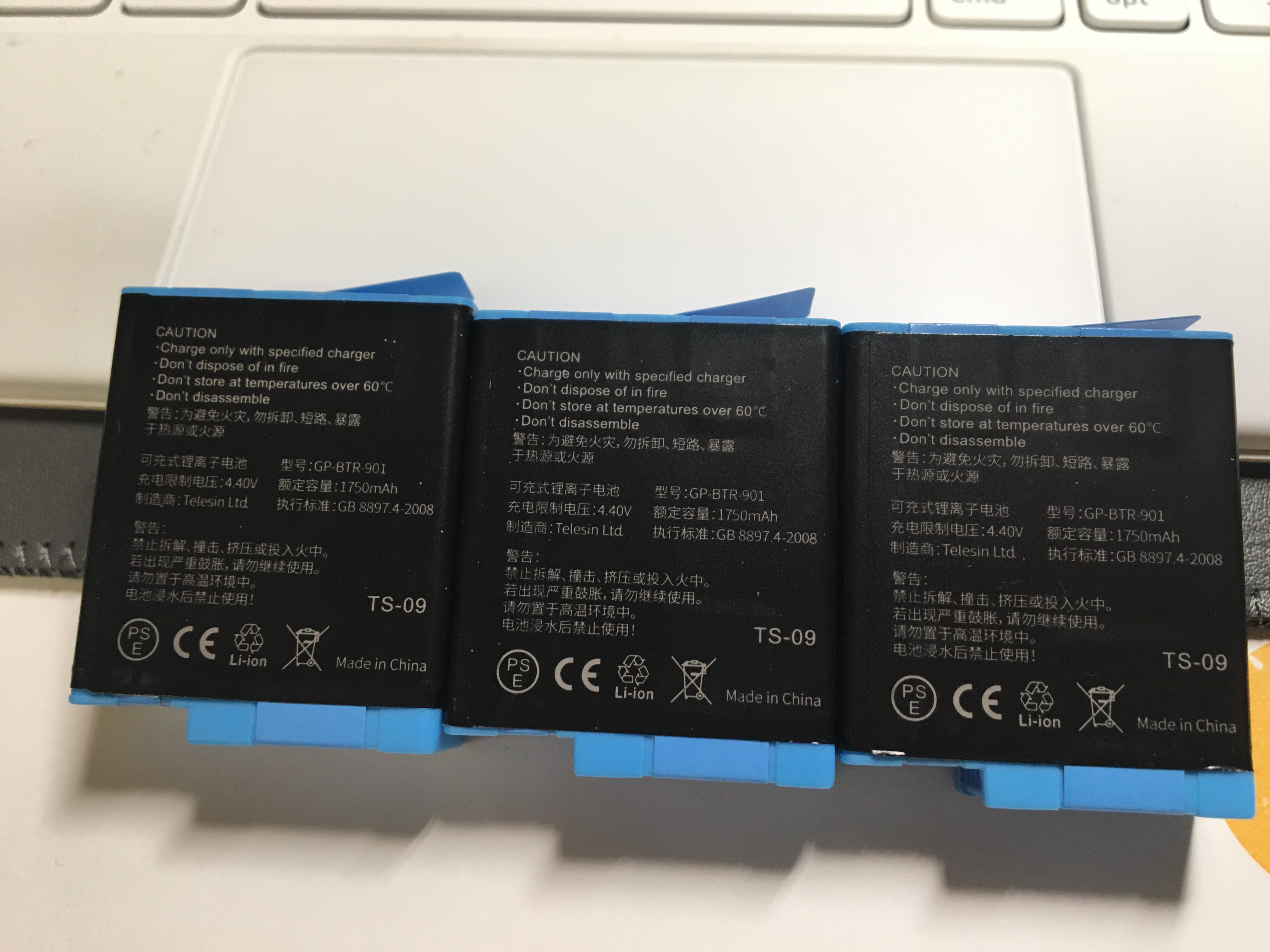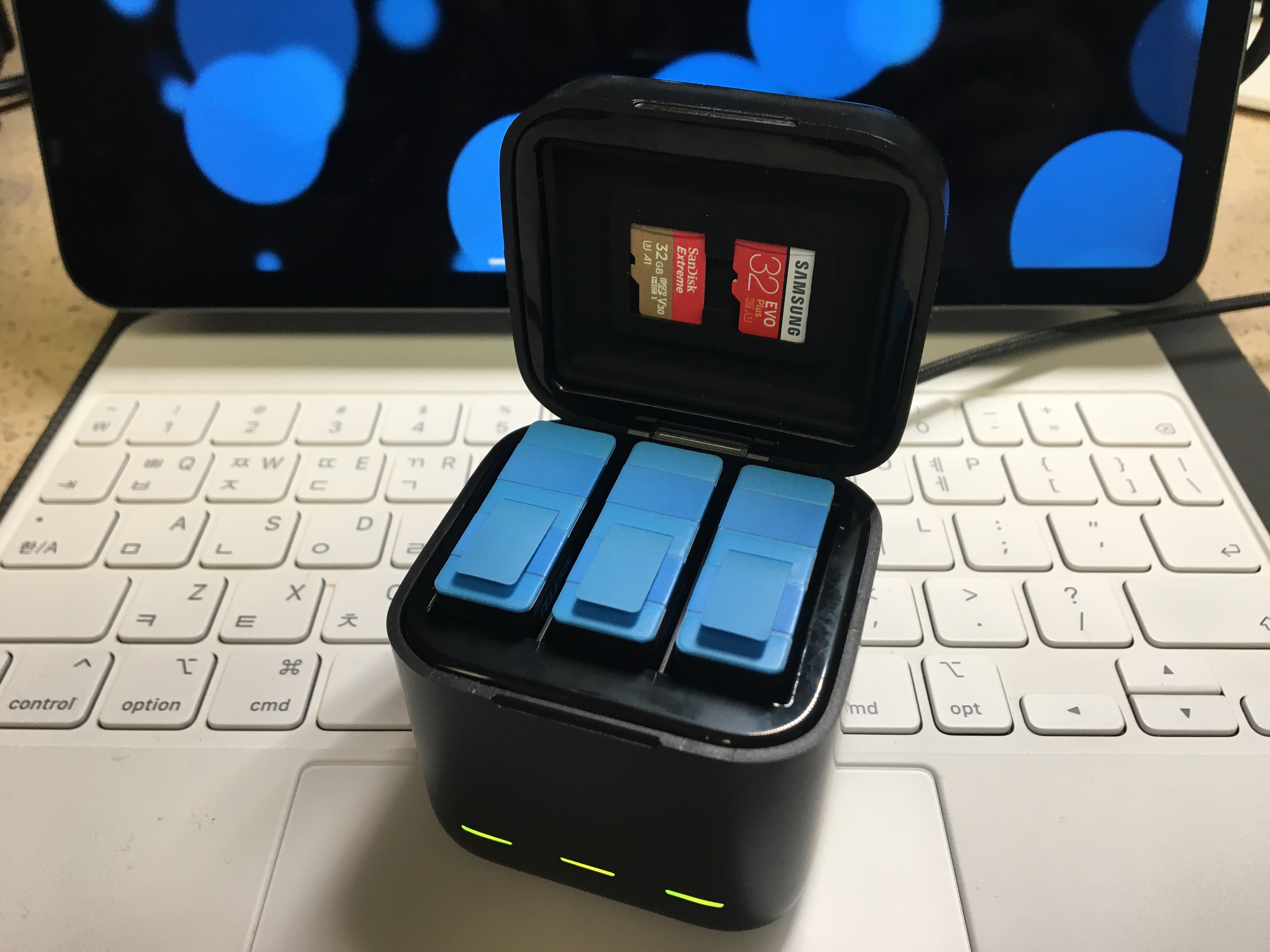 사이즈가 아담하고 ( 5.7cm * 5.1cm * 5.9cm) USB-C 충전으로 3개 배터리를 동시 충전이 가능한 제품이다. 뚜껑에 TELESIN (알리에서는 고프로 호환 배터리 브랜드로 꽤 유명) 마크가 찍혀 있는데, 고프로10 살때 받은 스티커로 가려 버렸다.