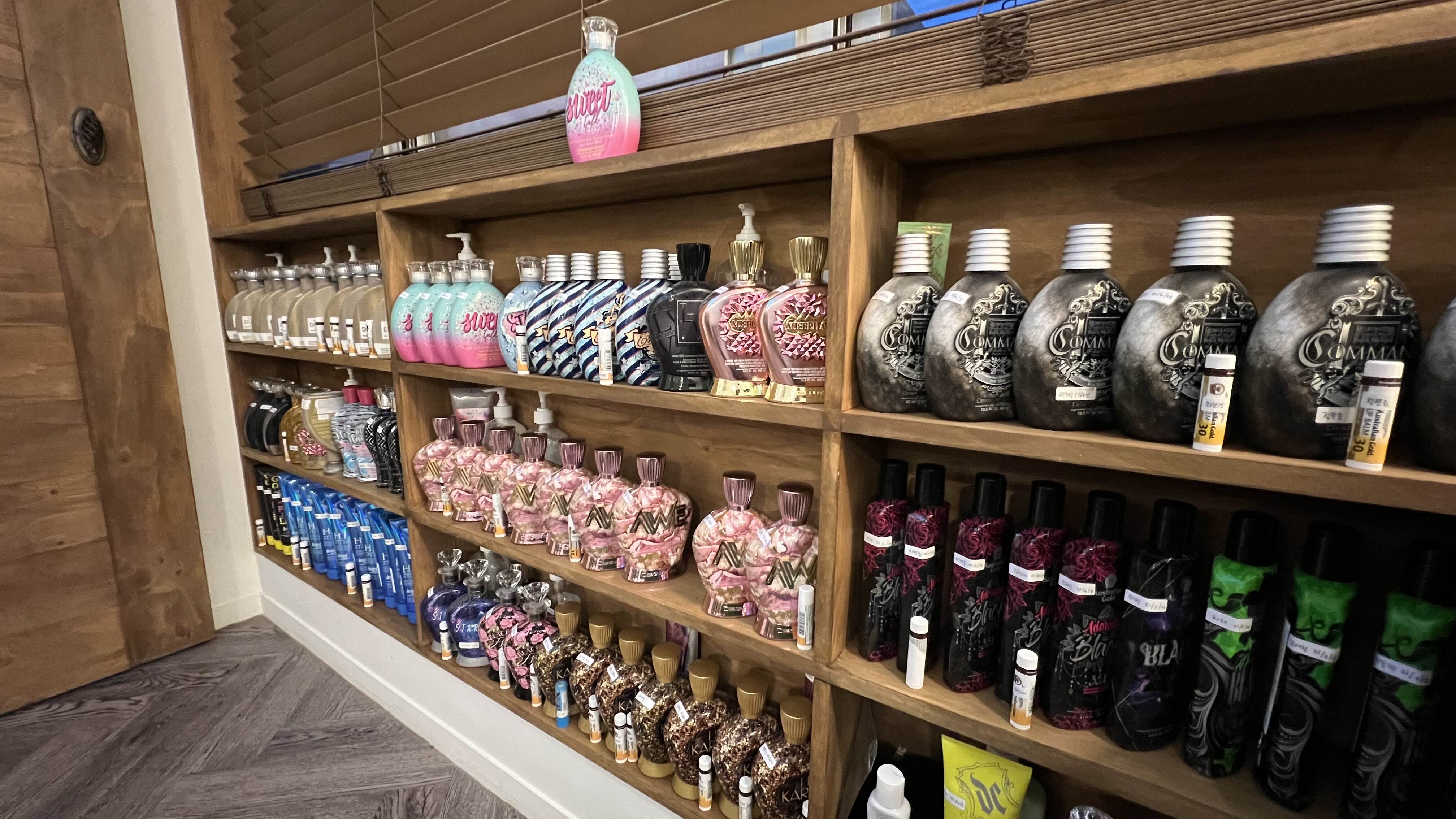 회원들의 키핑된 태닝 크림들. 위에 올려져 있는 제품이 샵에서 14만원에 구매한 제품.