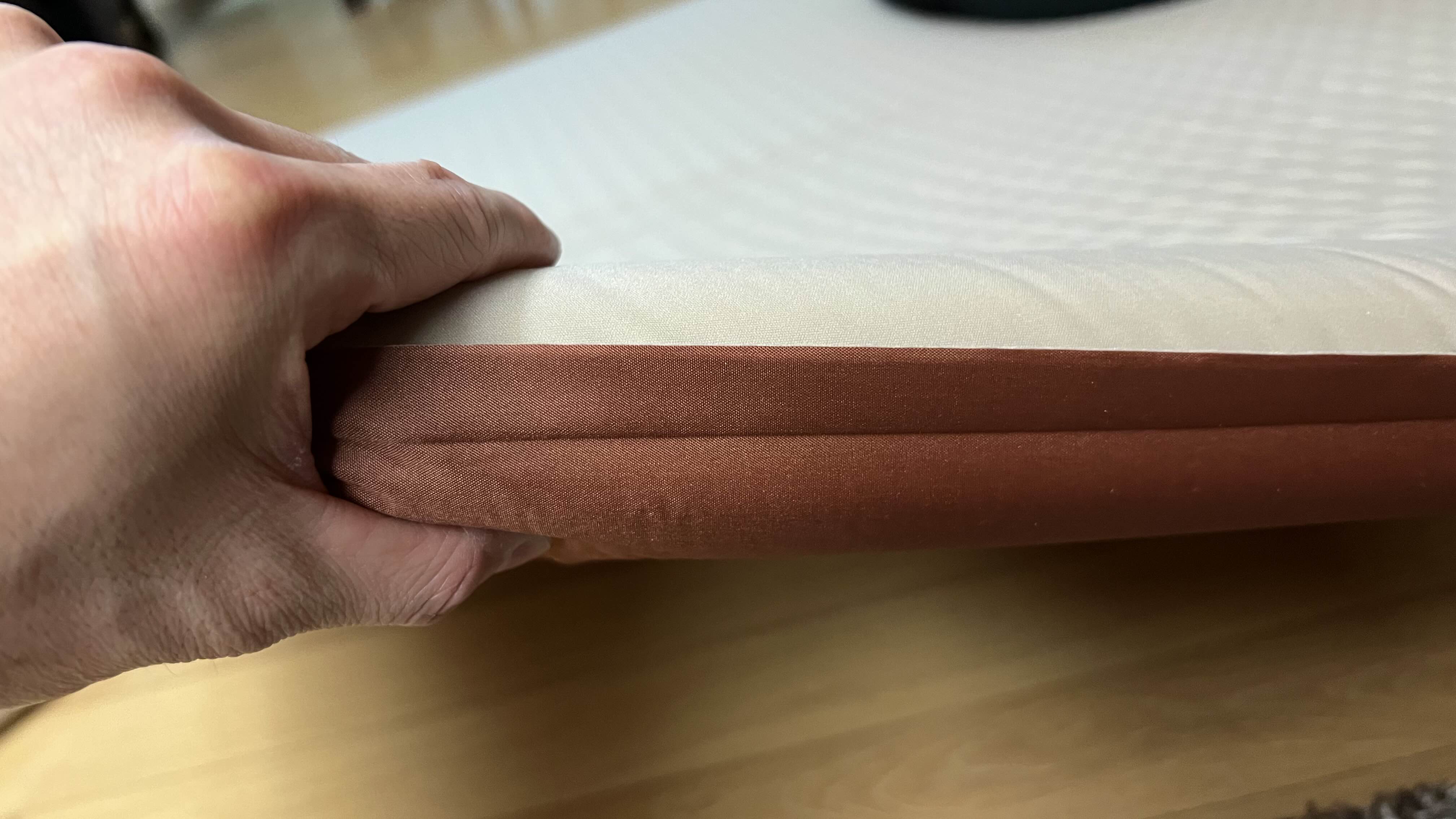 펌프로 빵빵하게 주입했을때 두께. 푹신하게 10cm 사려다가 패킹사이즈의 부담때문에 6cm 로 샀는데, 이 정도 사이즈면 충분하다. 사실 생각보다 더 두꺼운 느낌이다.