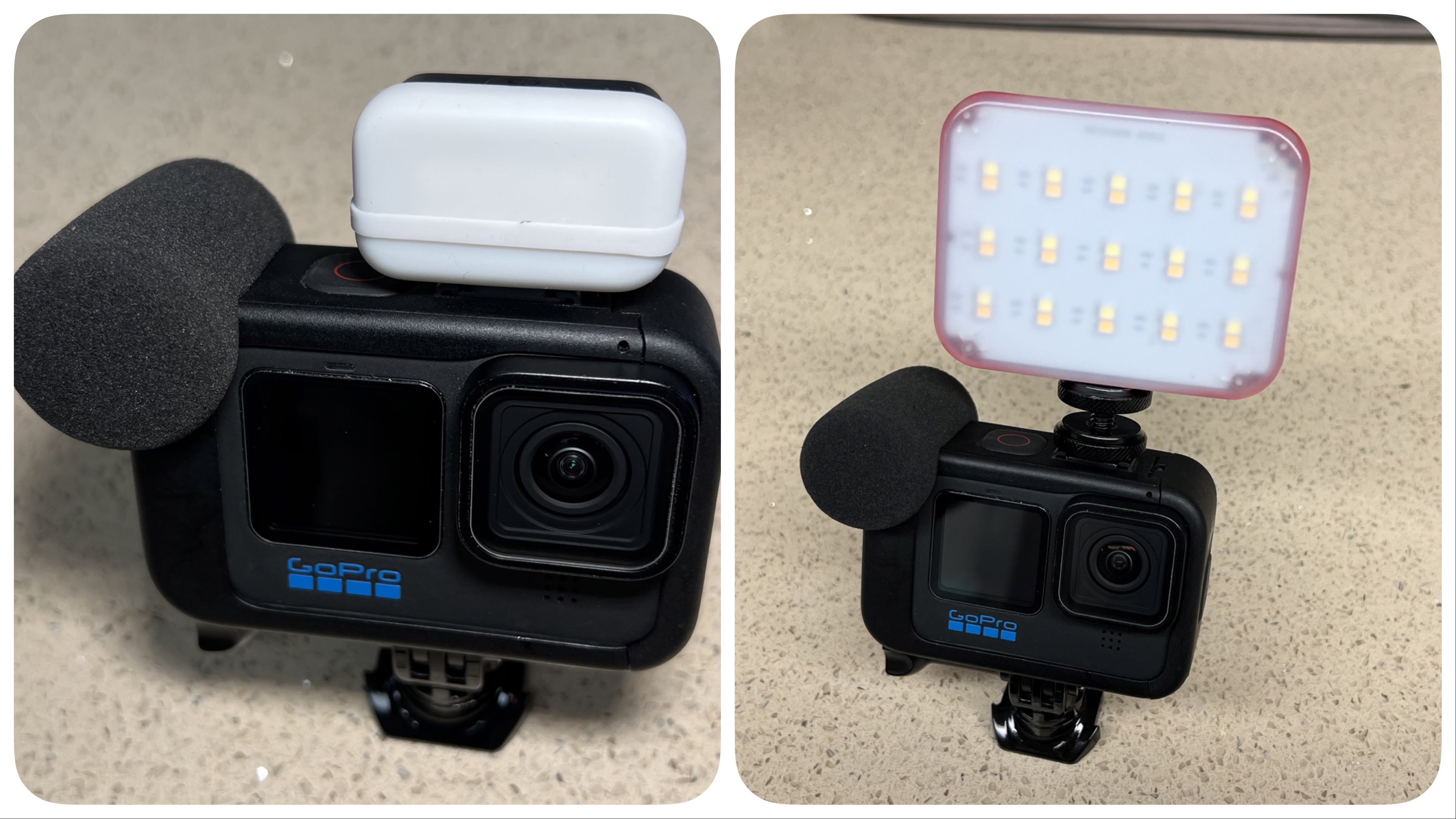 GoPro 정품 악세사리중에 Light Mod 제품이 휴대가 간편한 조명으로 디퓨저까지 제공되나 사용시간이 짧고 광량이 작아서 비상용으로 구비하면 좋다.
