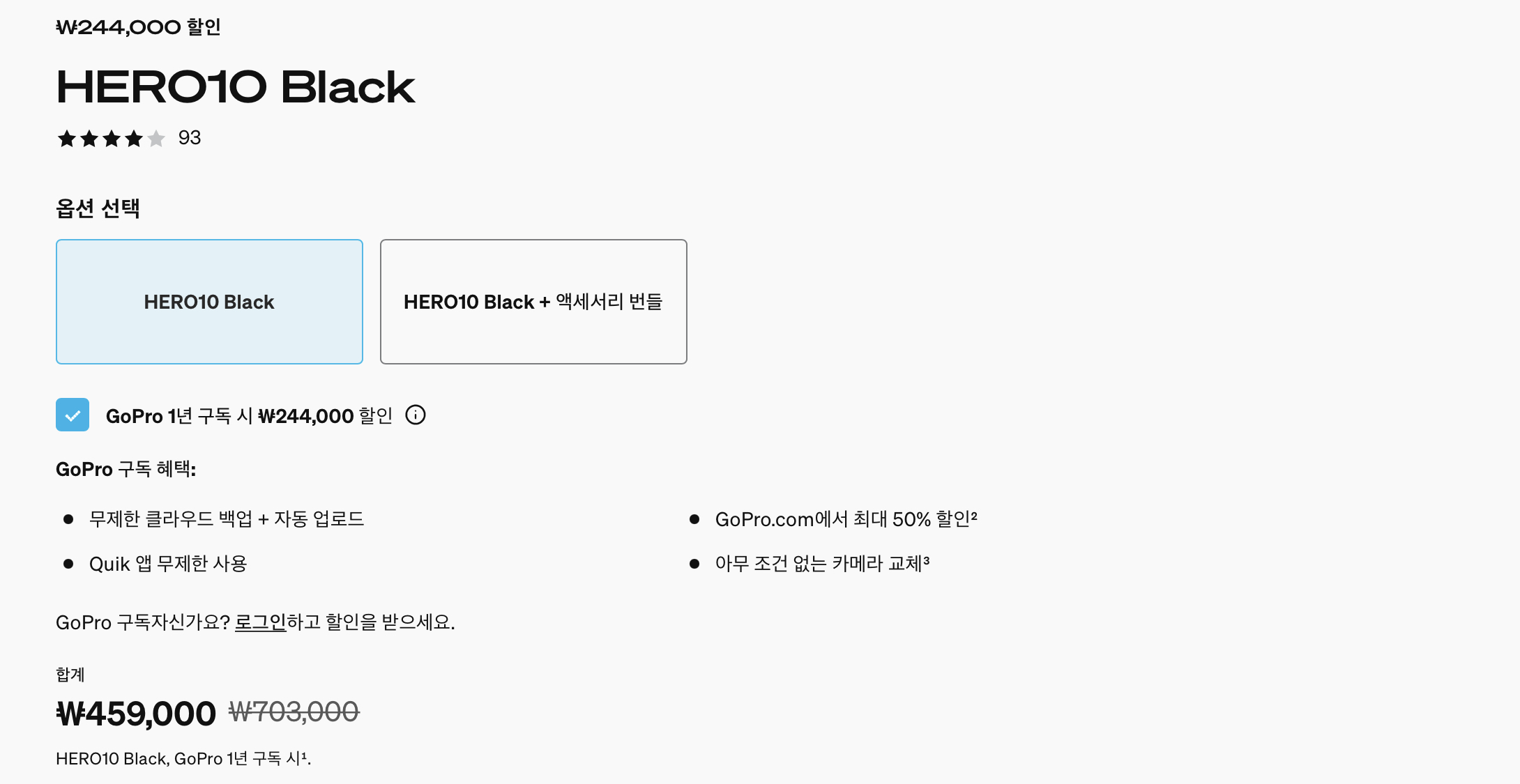- GoPro Hero10 의 경우 459,000원이 본체+배터리+1년구독과 함께 구매할 수 있는 공홈의 가장 저렴한 가격임