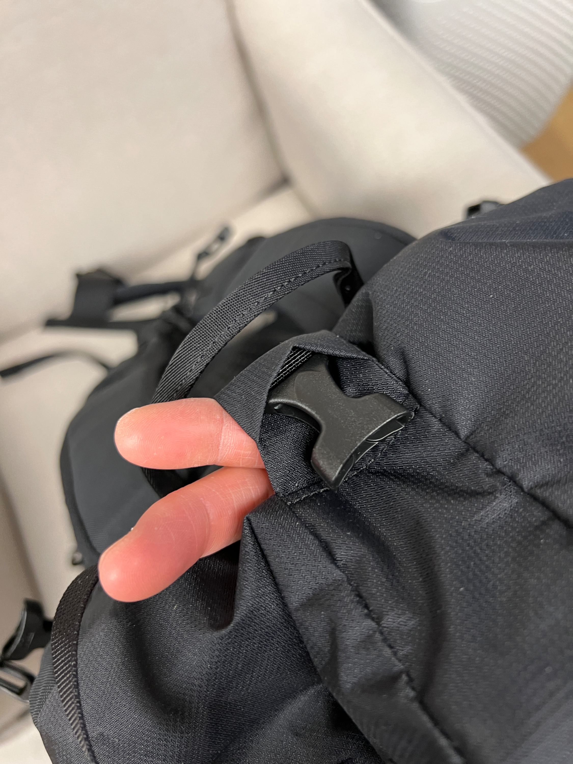 가슴 연결고리. 툴레 백패킹용 배낭에서 이 가슴 연결고리 결속부위가 헐렁해서 잃어버렸는데 이 배낭도 똑같은 구조로 생겼지만 헐렁하진 않아서 일반적인 경우엔 빠지진 않을것 처럼 보인다.