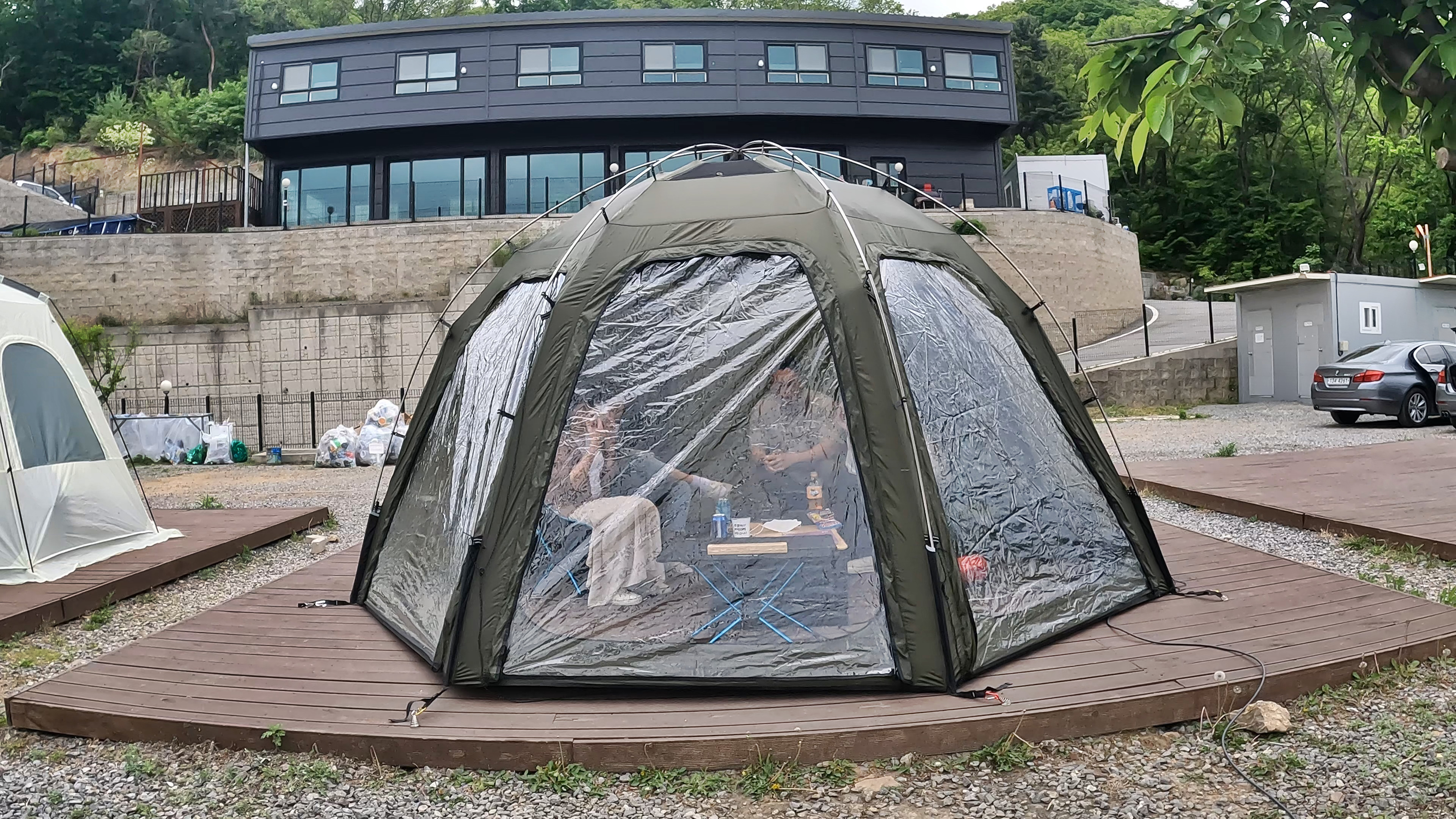 F구역에서 바라본 D구역. D구역은 5m*6m 의 데크로 총 5개의 사이트가 있다.