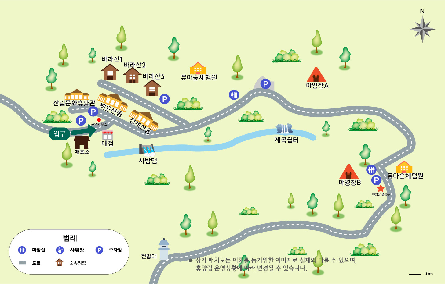자연휴양림 지도. 입구 근처에 매점도 있고, 차로 좀 올라가다 보면 A야영장이 있고, 더 올라가면 B야영장.