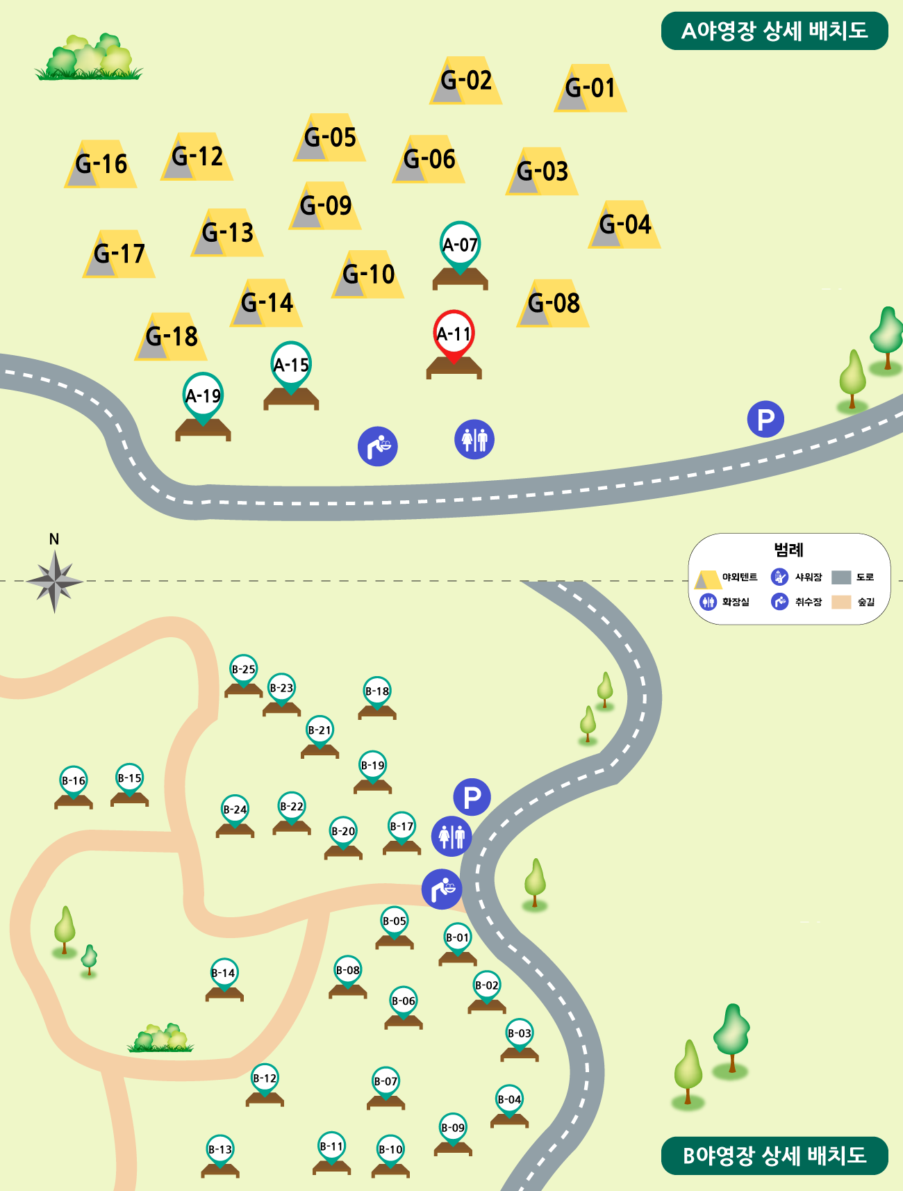 자연휴양림 지도. 입구 근처에 매점도 있고, 차로 좀 올라가다 보면 A야영장이 있고, 더 올라가면 B야영장.