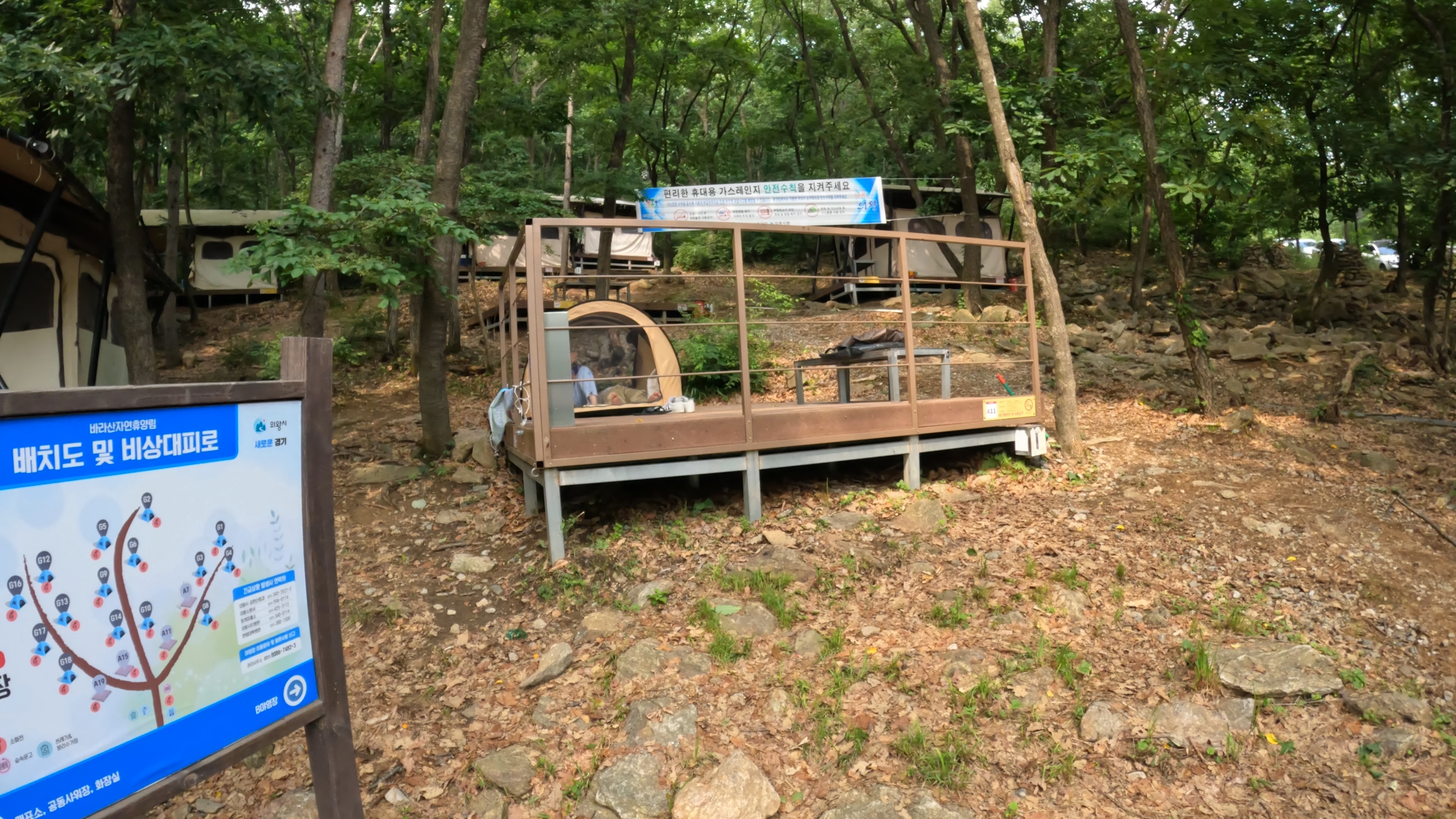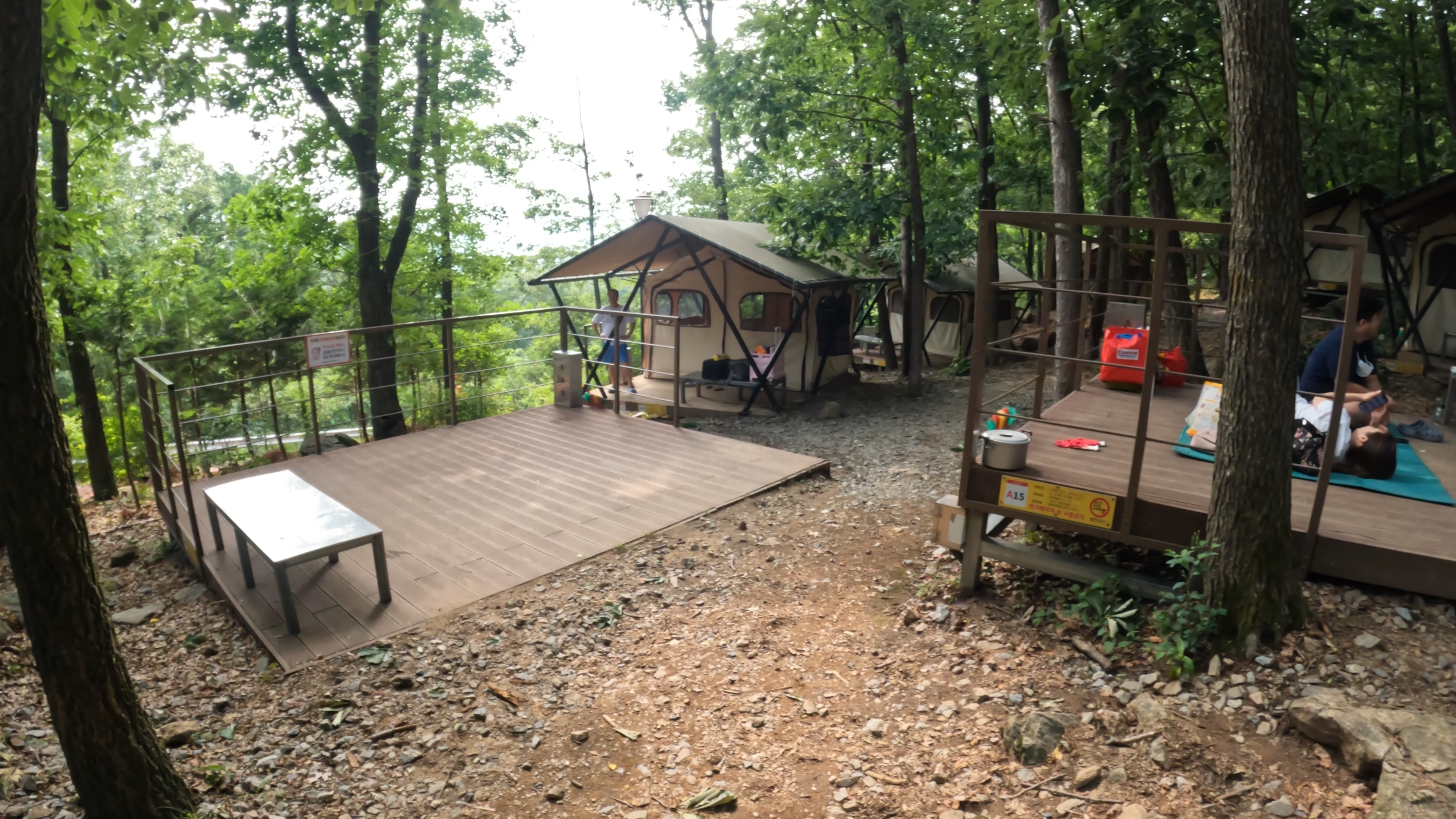 A 야영장에는 고정식 텐트라고 해서 이미 데크사이트에 텐트가 설치되어 있는 사이트가 많이 있는 형태이다. 참고로 고정식 텐트는 주말에 4만원.