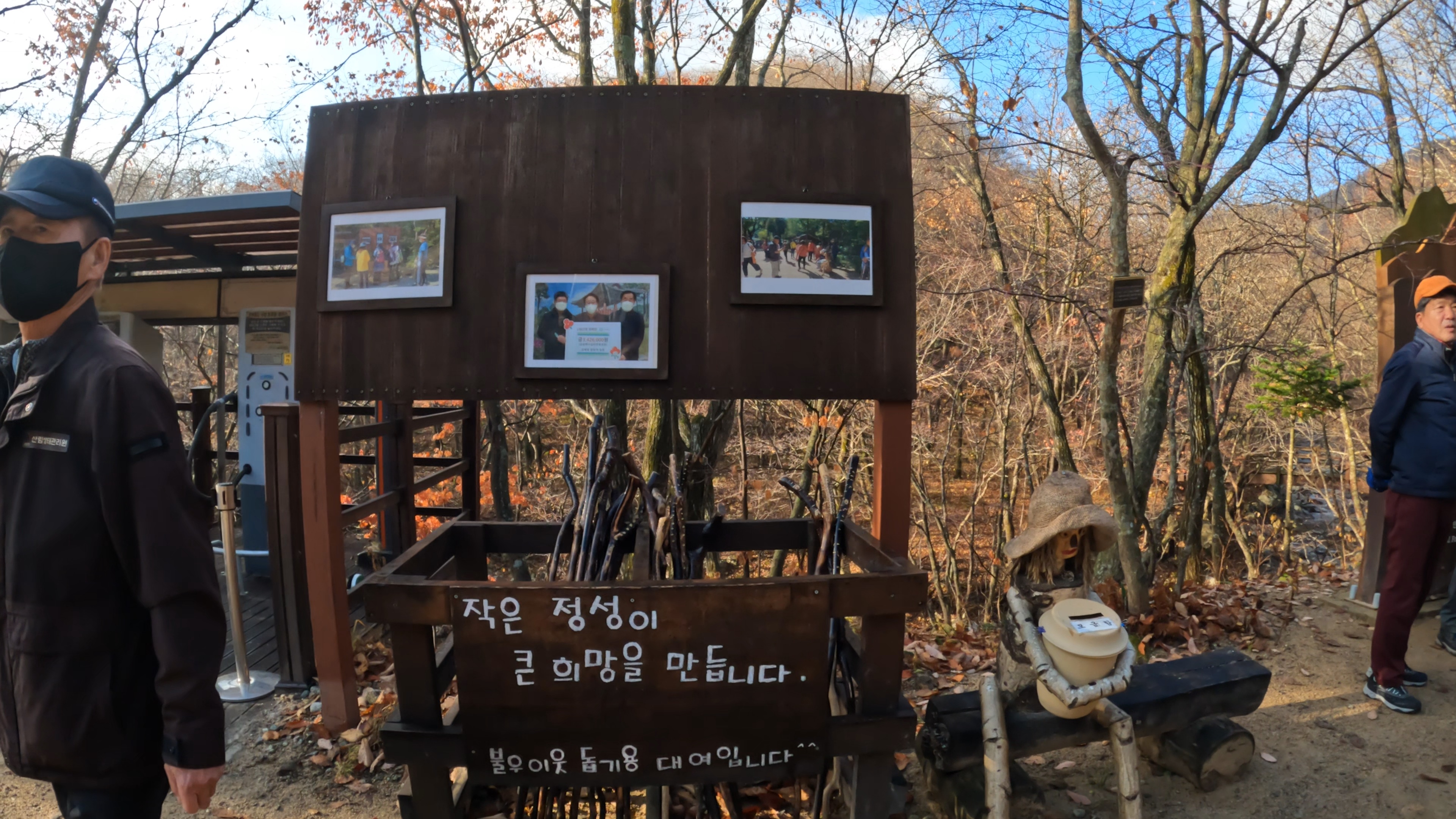 탐방객에게 불우이웃돕기 성금을 받고 제공되는 나무 지팡이. 나갈때 반납