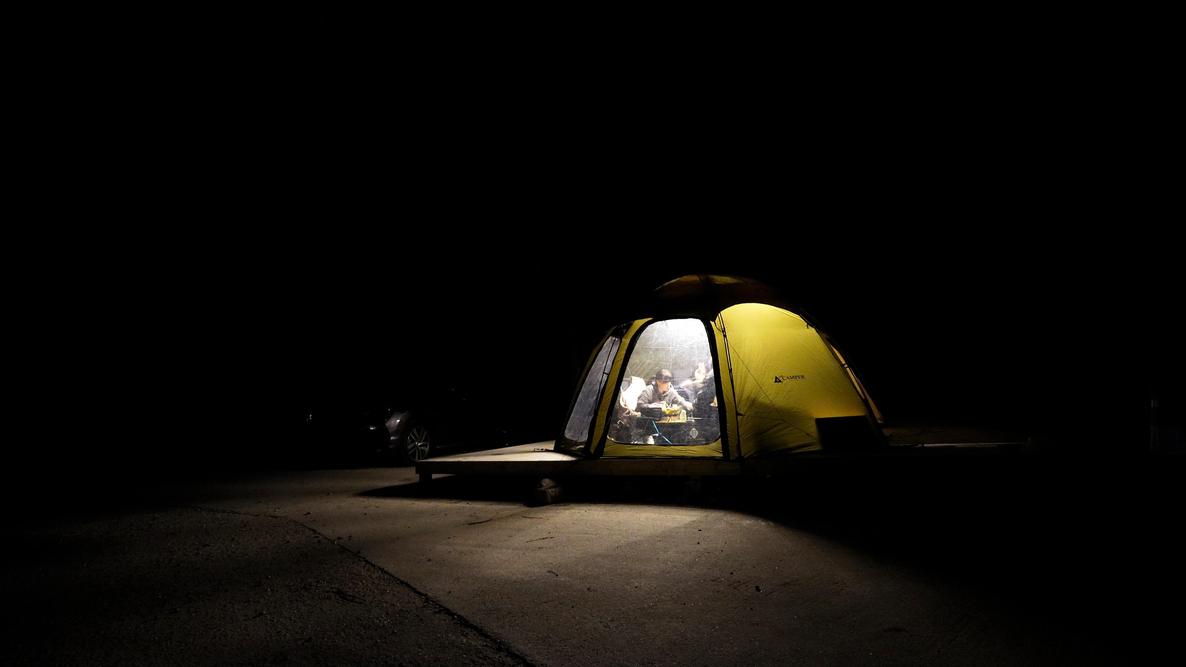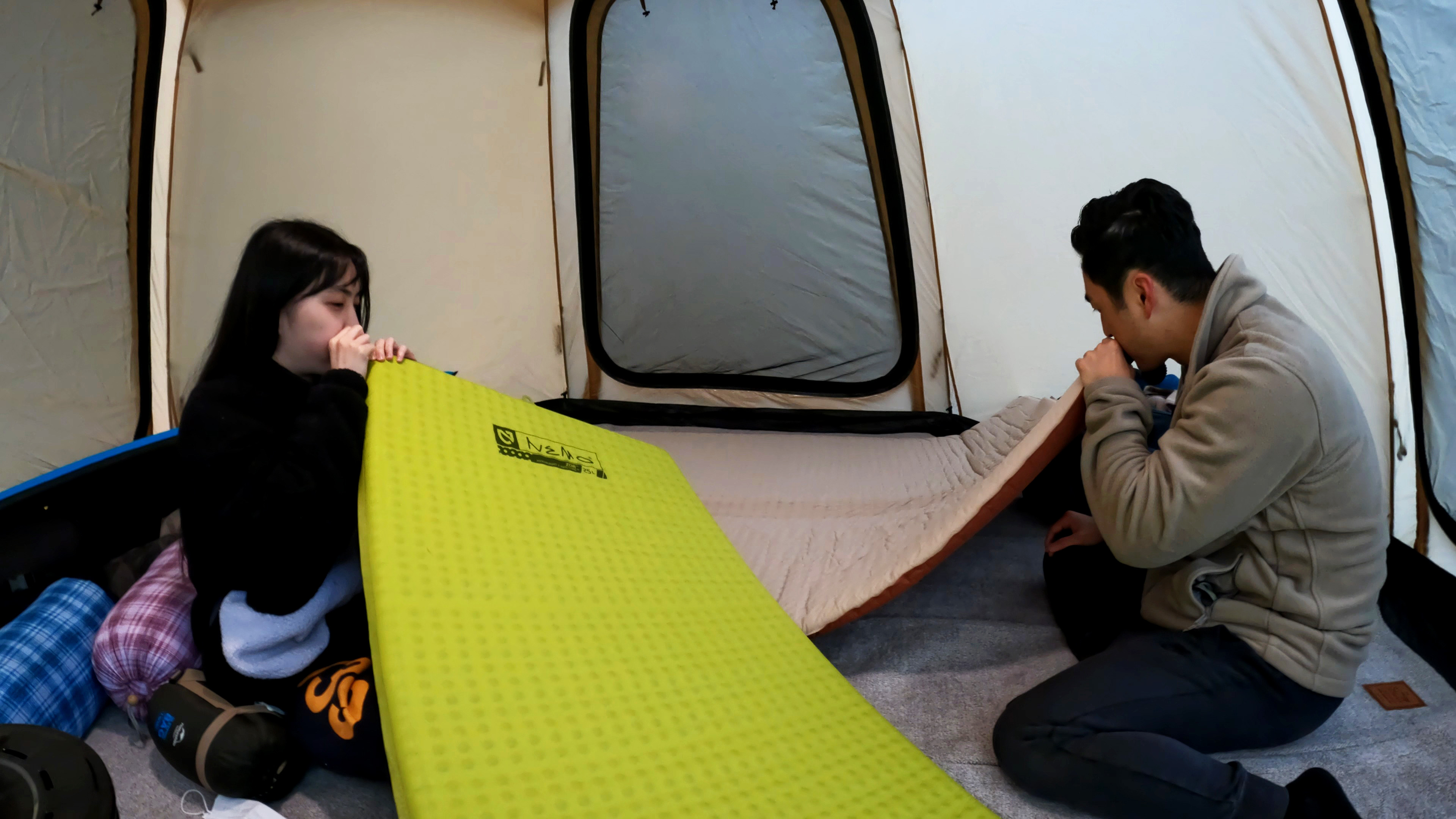 좌식 세팅 끝. 니모 조르25L 2개와 네이쳐하이크 6cm 자충매트로 바닥 매트를 해결했고, 베이스 프로캠핑800 3계절 침낭 2개와 네이쳐하이크 여름용 침낭 2개로 침실 세팅 완료.