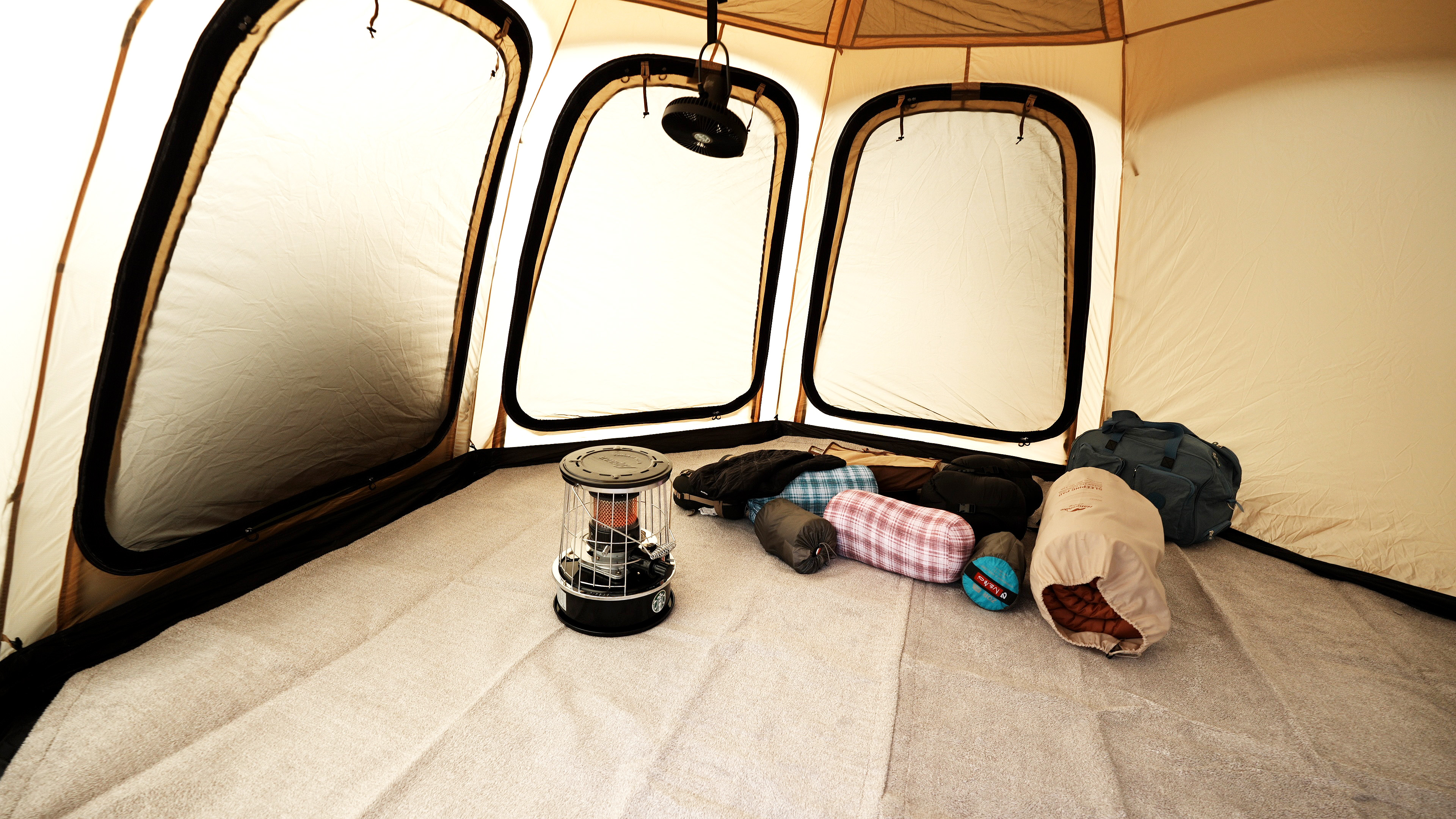 좌식 세팅의 이그니스L. 방수포 위에 그라운드시트 체결한 쉘터를 설치하고, 그 위에 비바돔용 8각 러그를 깔았다.