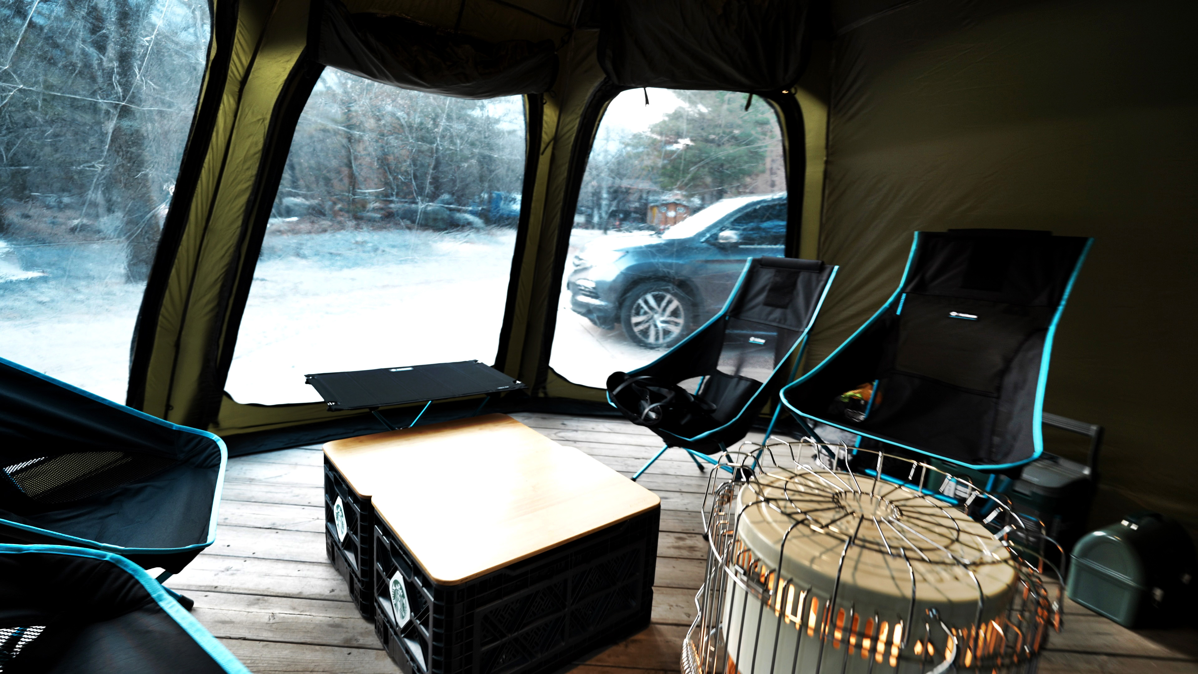 입식 세팅의 쉘터. 헬리녹스 의자 4개 (체어원, 체어원L, 체어투, 선셋체어) 와 빅앤트 캠핑박스2개, 그리고 헬리녹스 테이블 하나, 파세코 CAMP-25S 난로 하나로 세팅