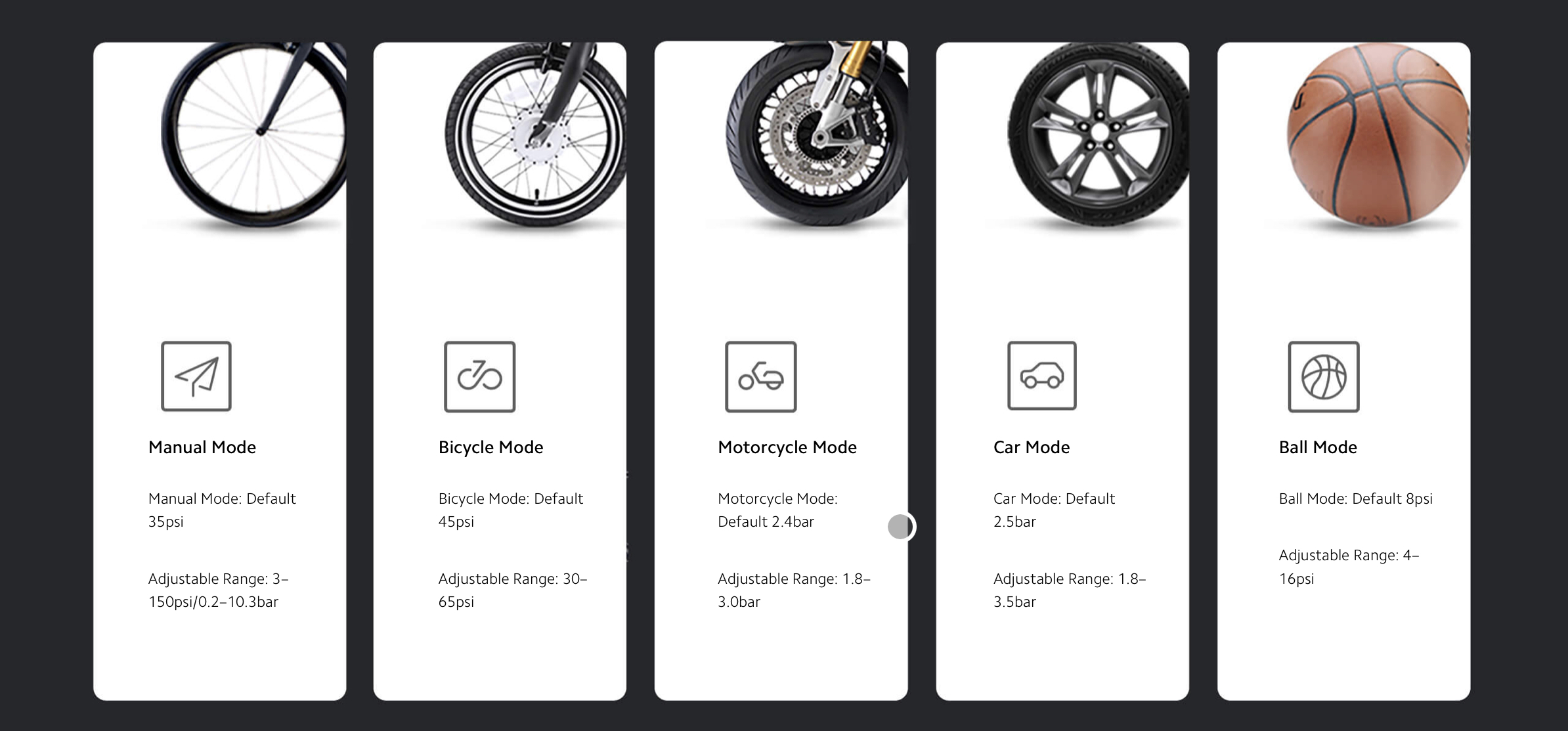 본인이 사용하는 로드자전거의 경우 보통 100~120psi 로 넣는데, 안내된 기본 압력은 45psi 인게, MTB 를 기준으로 한 듯 하다. 그냥 대상에 맞는 적정압력을 psi 로 계산해서 매뉴얼 모드에서 넣는게 편해 보인다.
