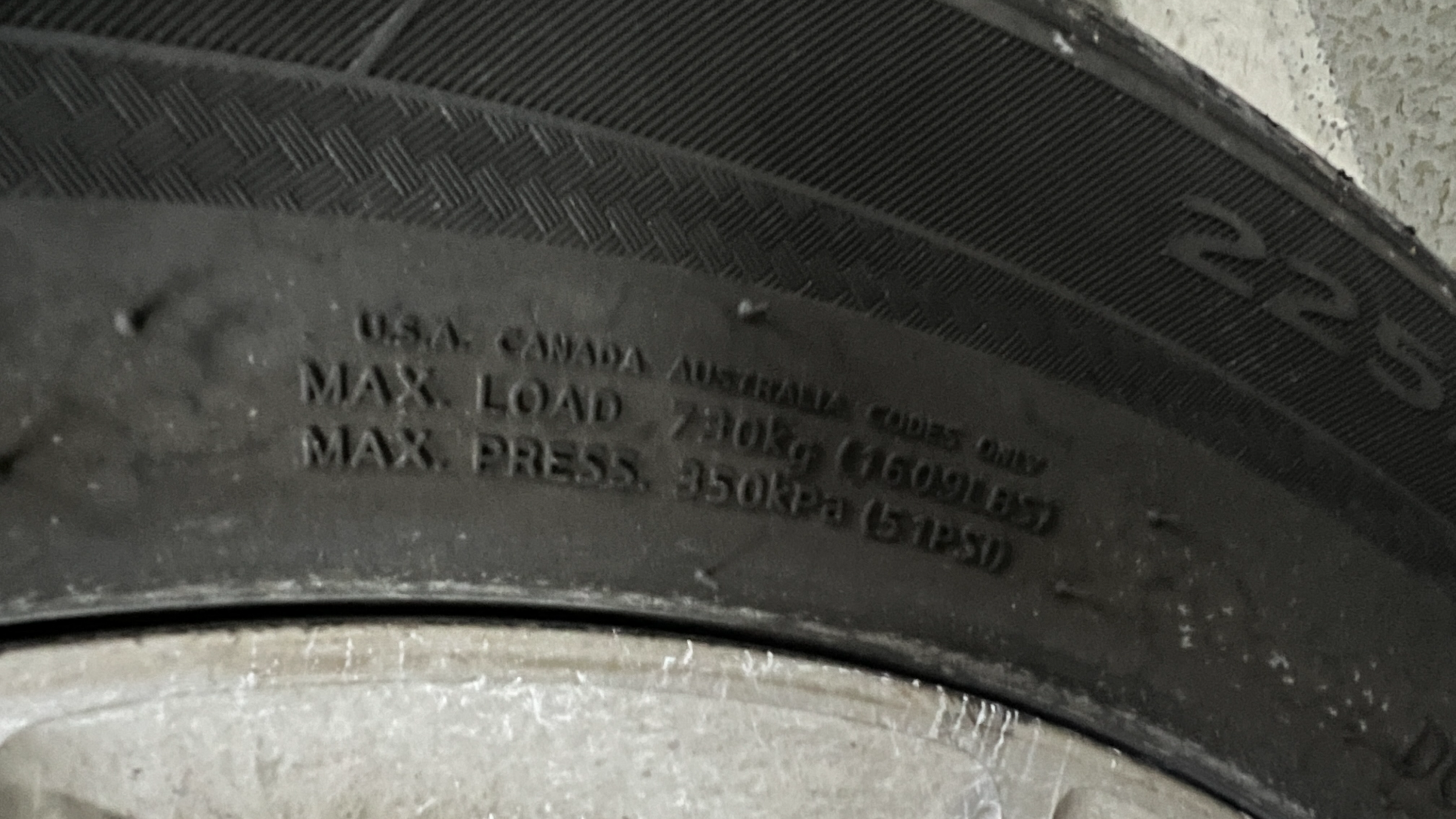경고등이 뜨고 있는 타이어에 표시된 안내를 보니, MAX PRESS 350kpa (51psi) 라고 되어 있다. 검색을 해 보면 이 MAX 수치의 80% 정도로 넣으라고 되어 있고 계산해보면 40 psi 정도로 275kpa 가 나온다. (1psi = 약 6.9 kpa)