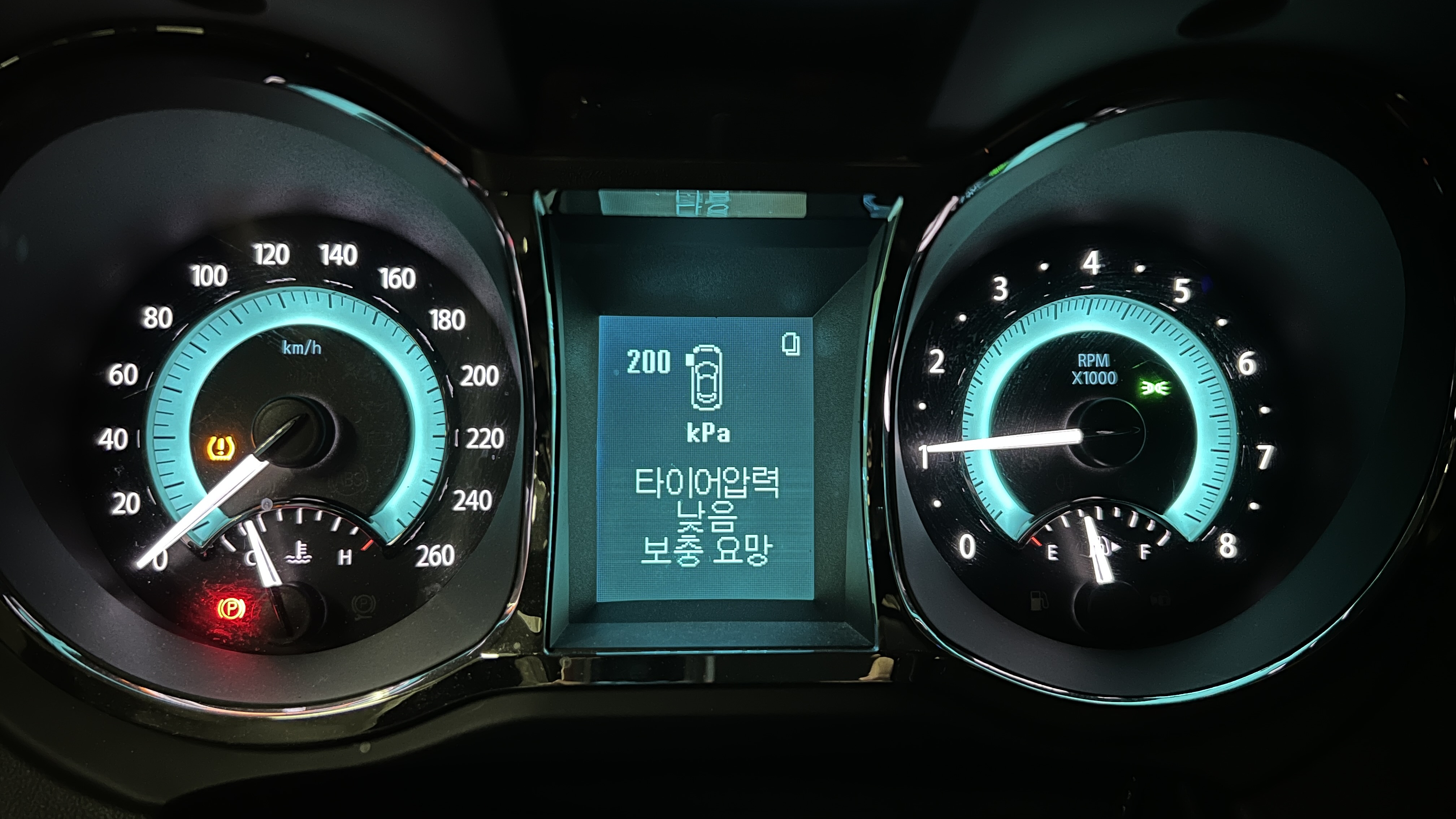 공기압 주입전 상태. 전륜 좌측 타이어가 200에서 190을 왔다갔다 하면서 경고등이 뜨고 있는 상태.