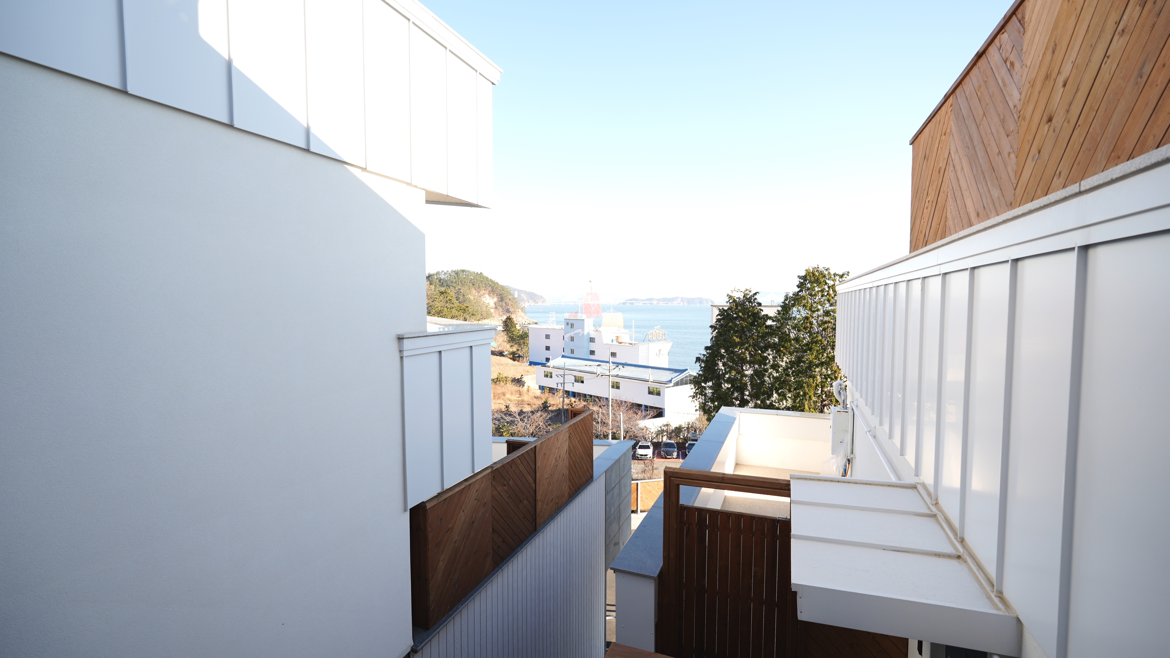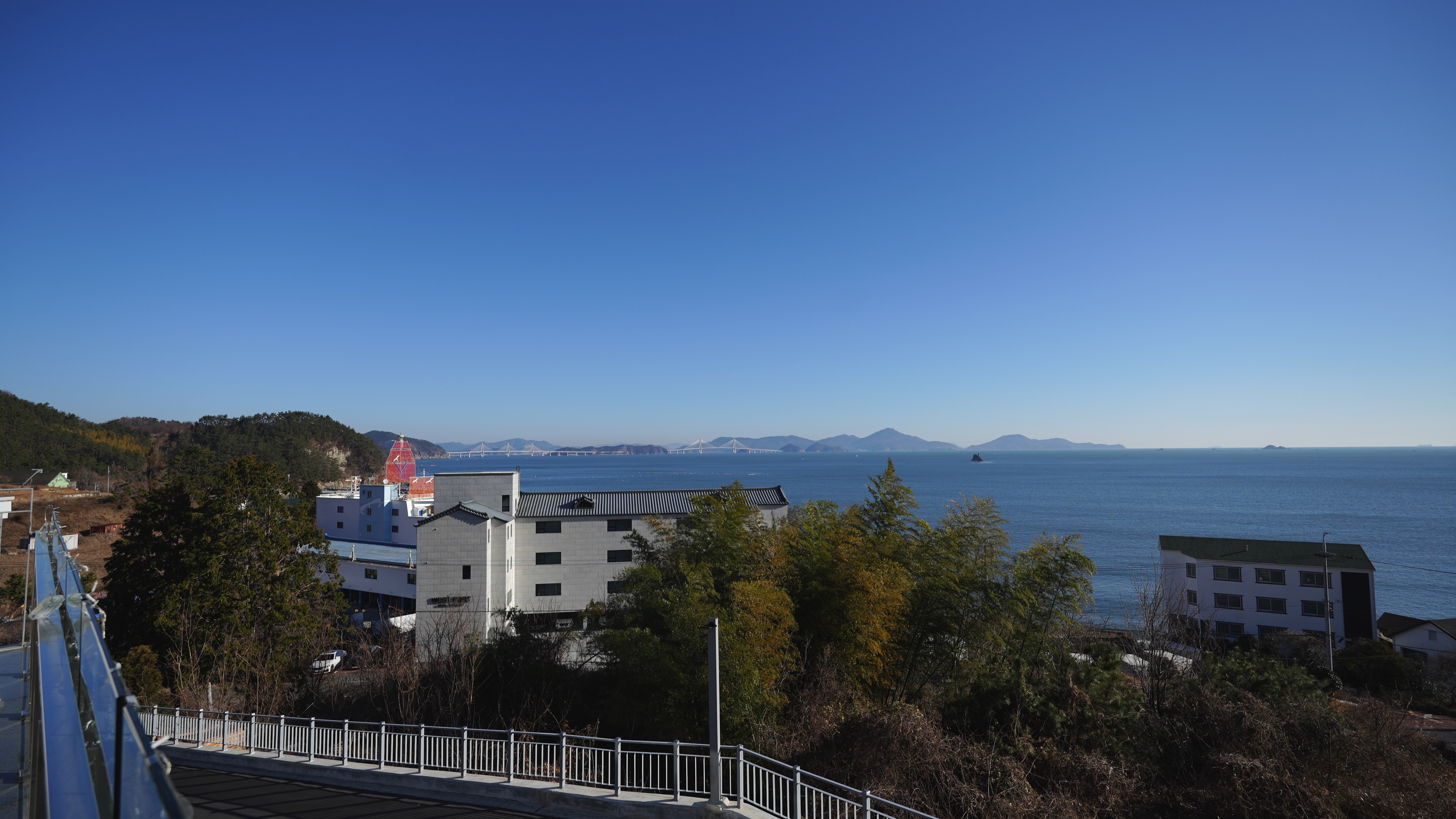 숙소 문을 열고 바라본 거가대교. 밤 늦게 와서 펜션이 어떻게 생겼는지 아침에야 구경 할 수 있었다.