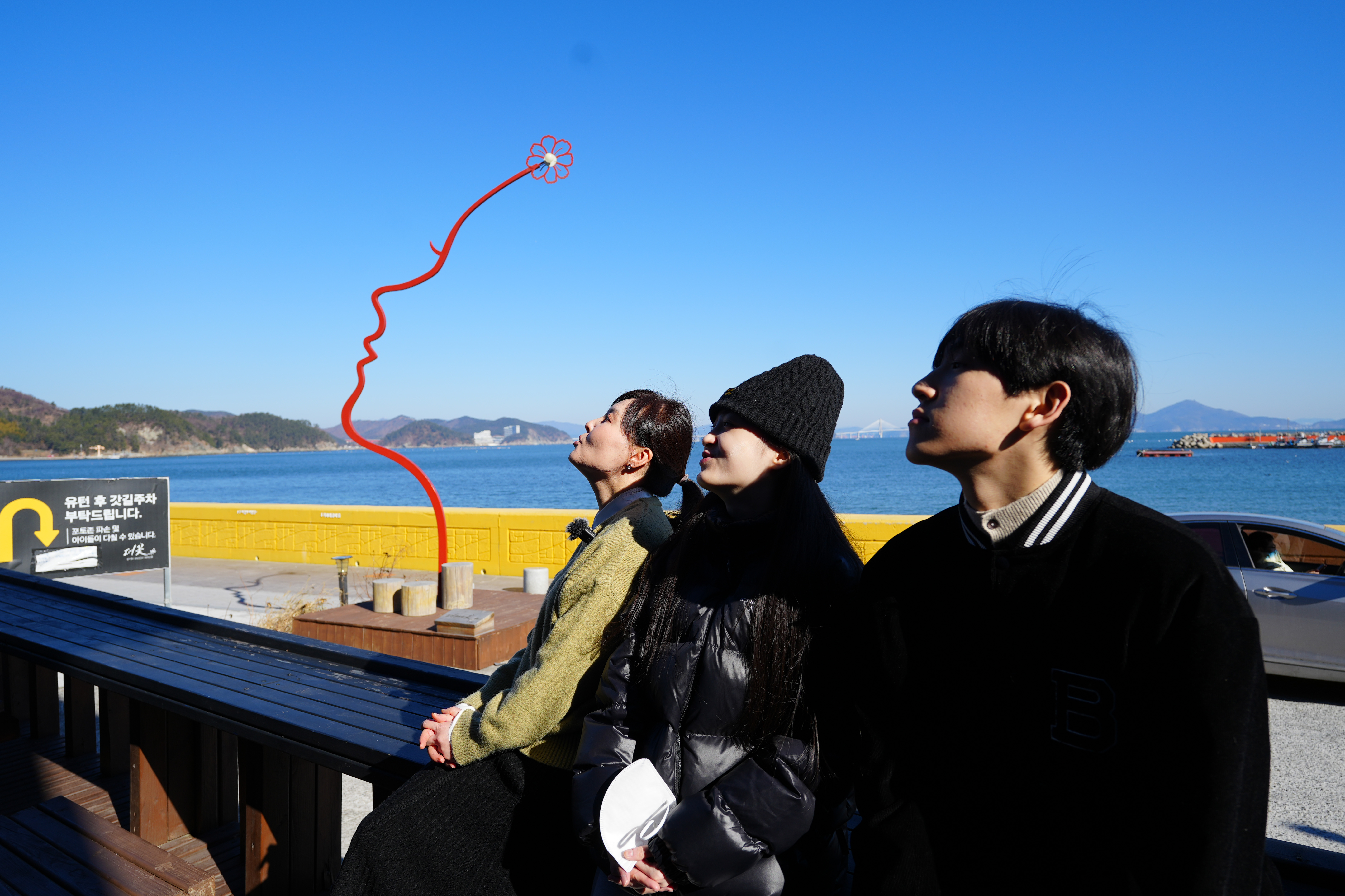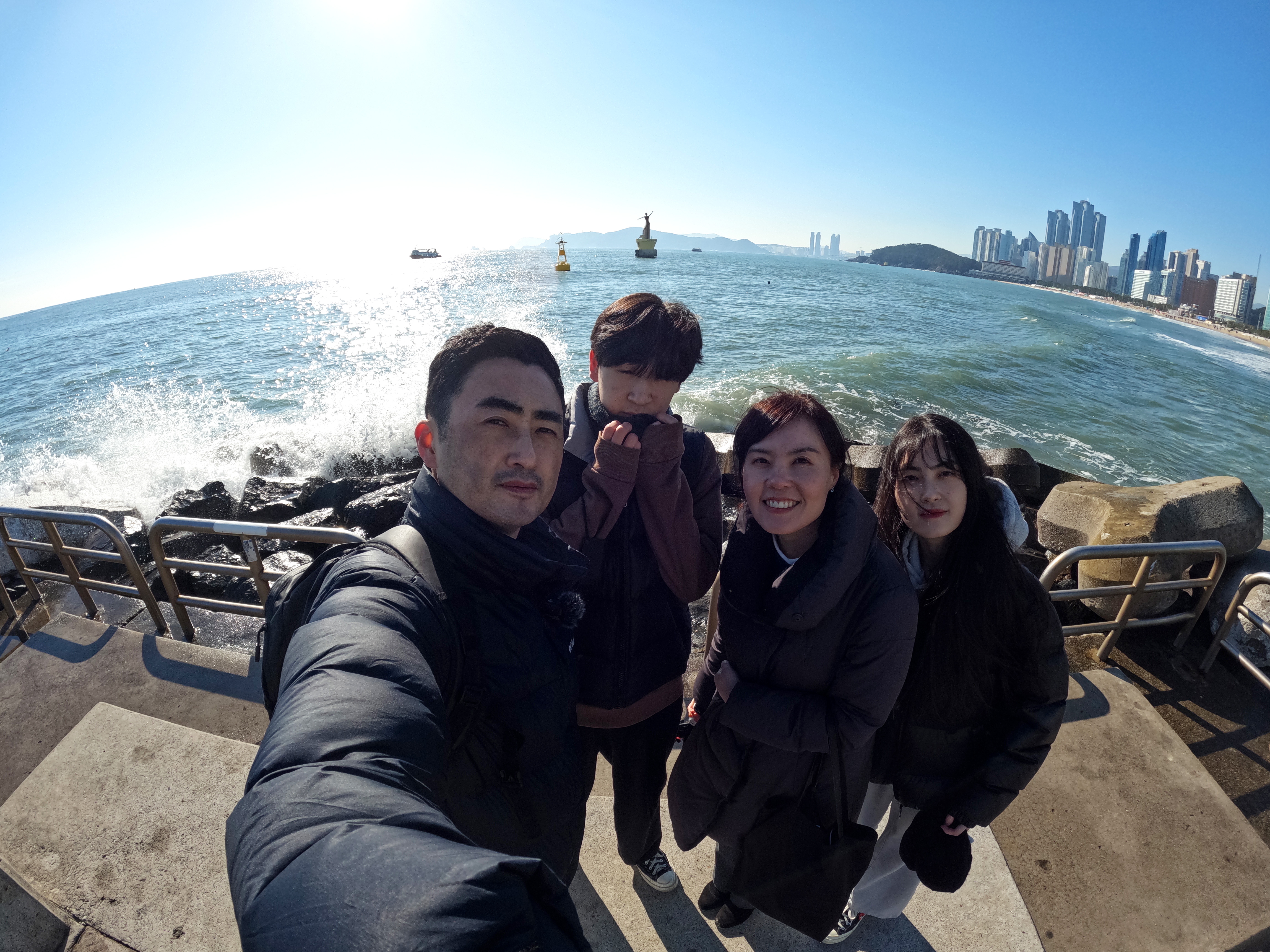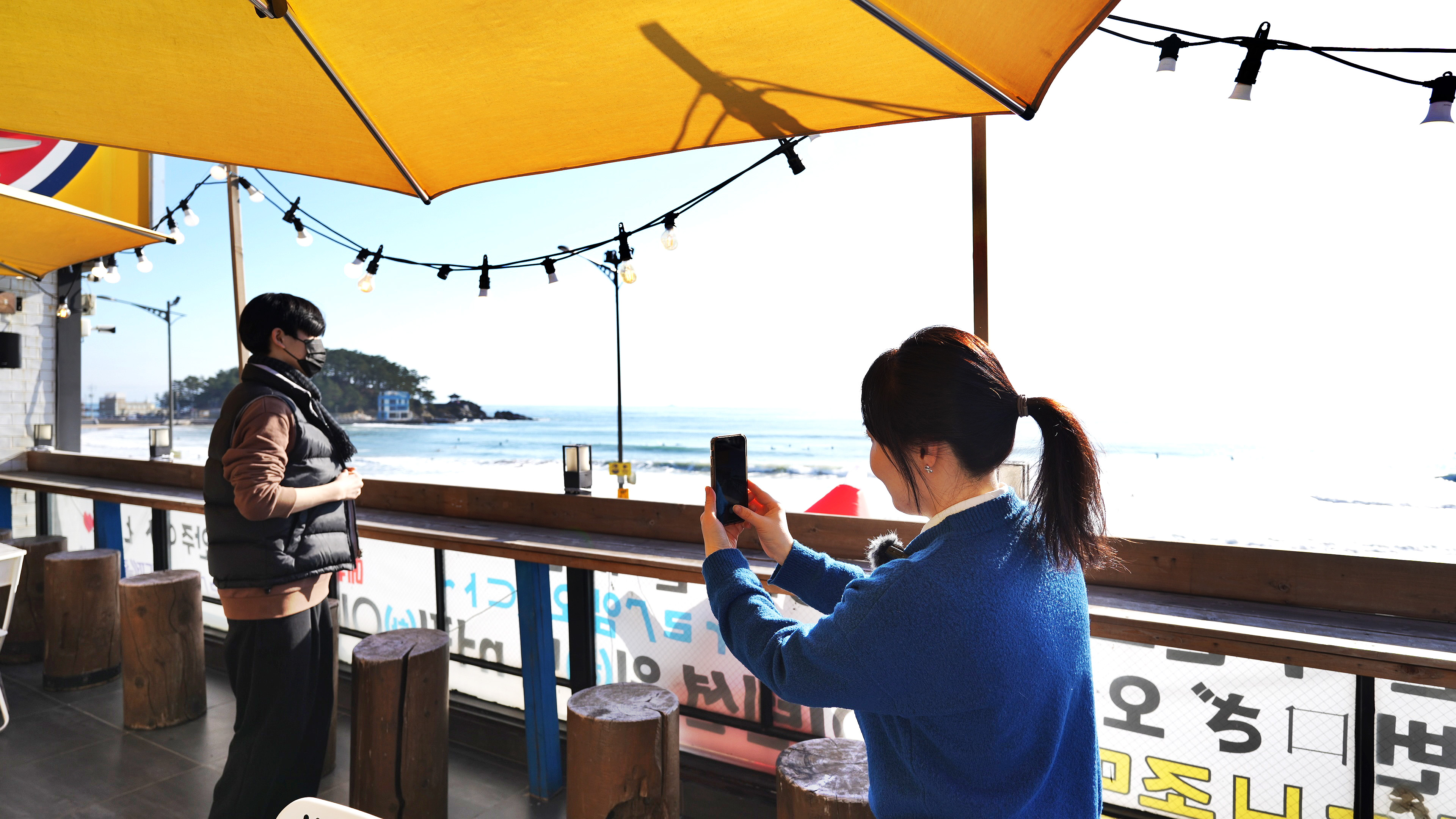 카페를 나와서 오랜만에 본 바닷가를 배경으로 SNS용 사진을 찍어준다.